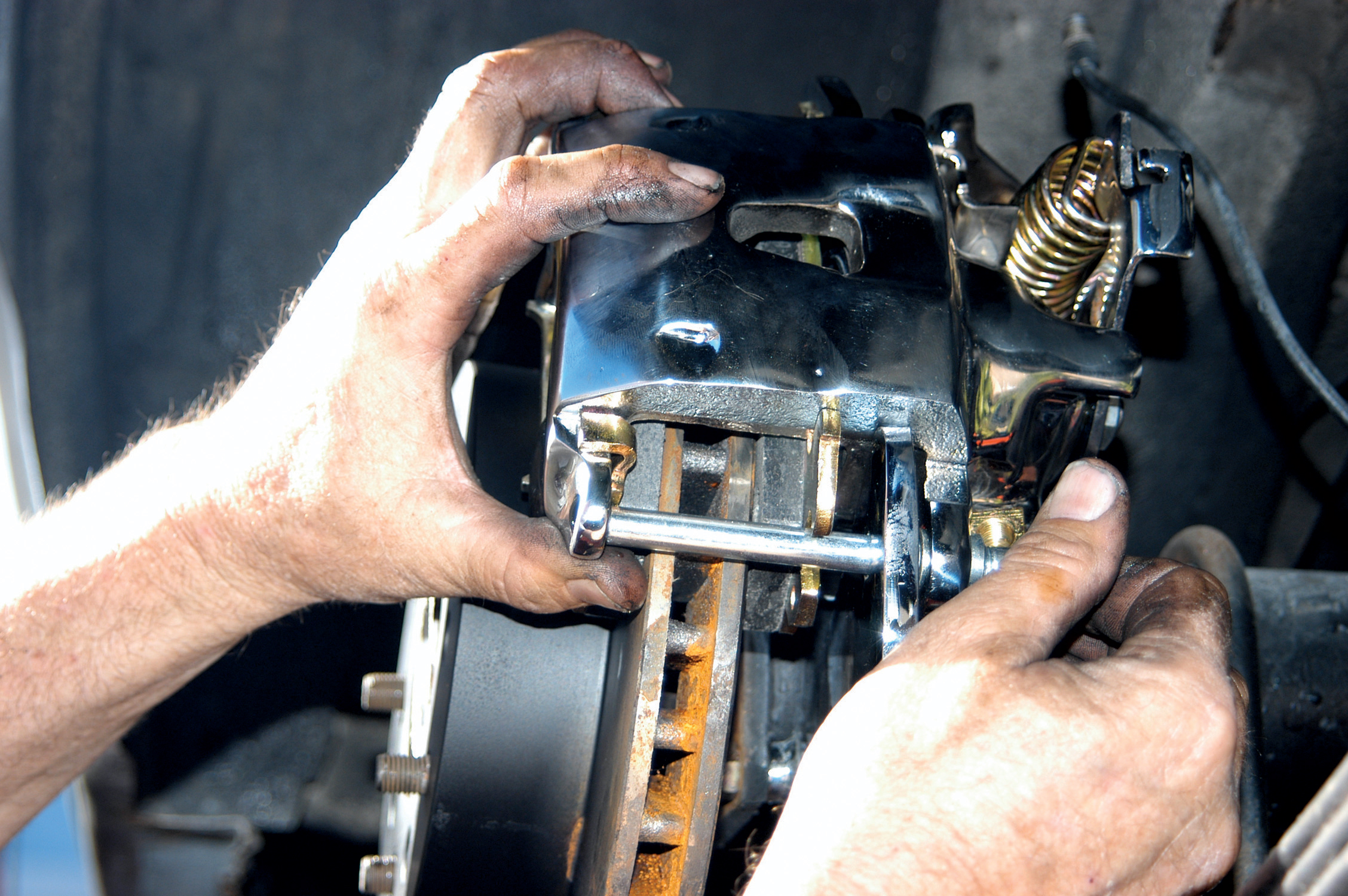 They placed the calipers onto the bracket and installed the bolts. These are floating calipers just like the ones used on the front.