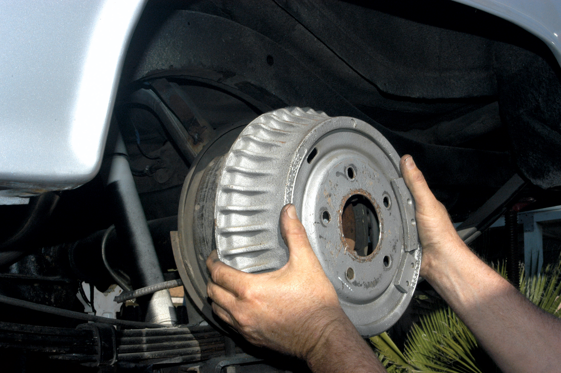 The Dream Cars staff first removed the drum brake to access the backing plate. The rear differential cover also had to be removed before the axle could be removed. The differential is filled with lubricant, so they drained it into a pan.