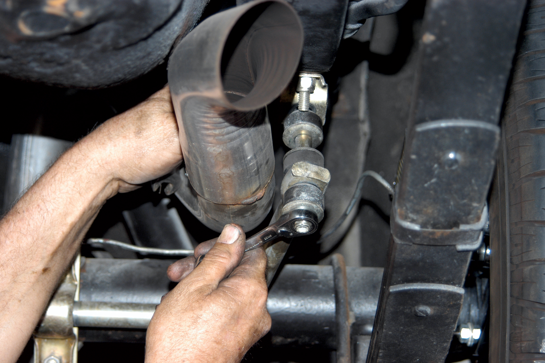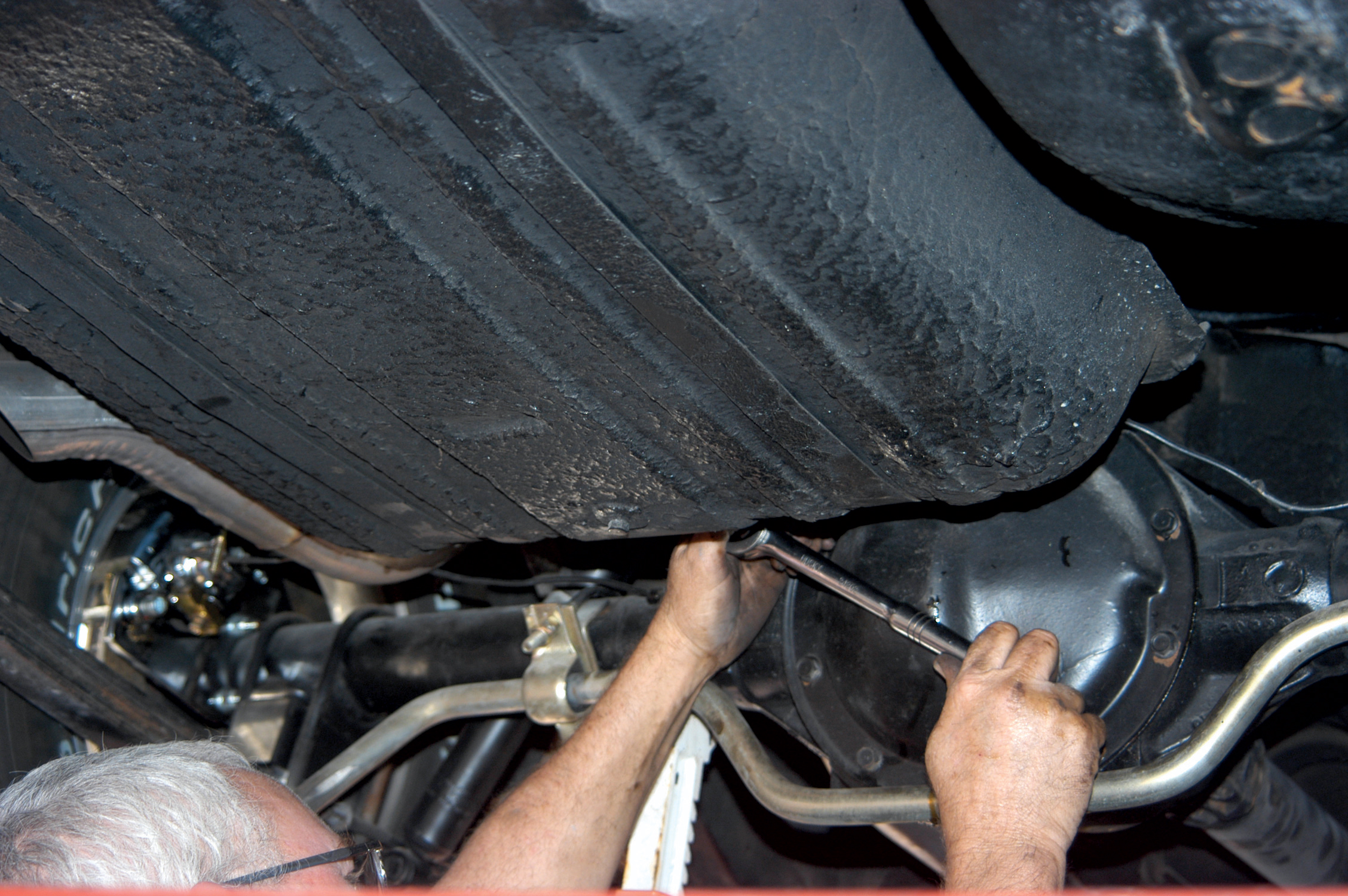 After they installed the rearend cover, they connected the sway bar. It is always a good idea to install sway bars on ’55-’57 Chevys because they improve the cars’ handling and cornering ability.
