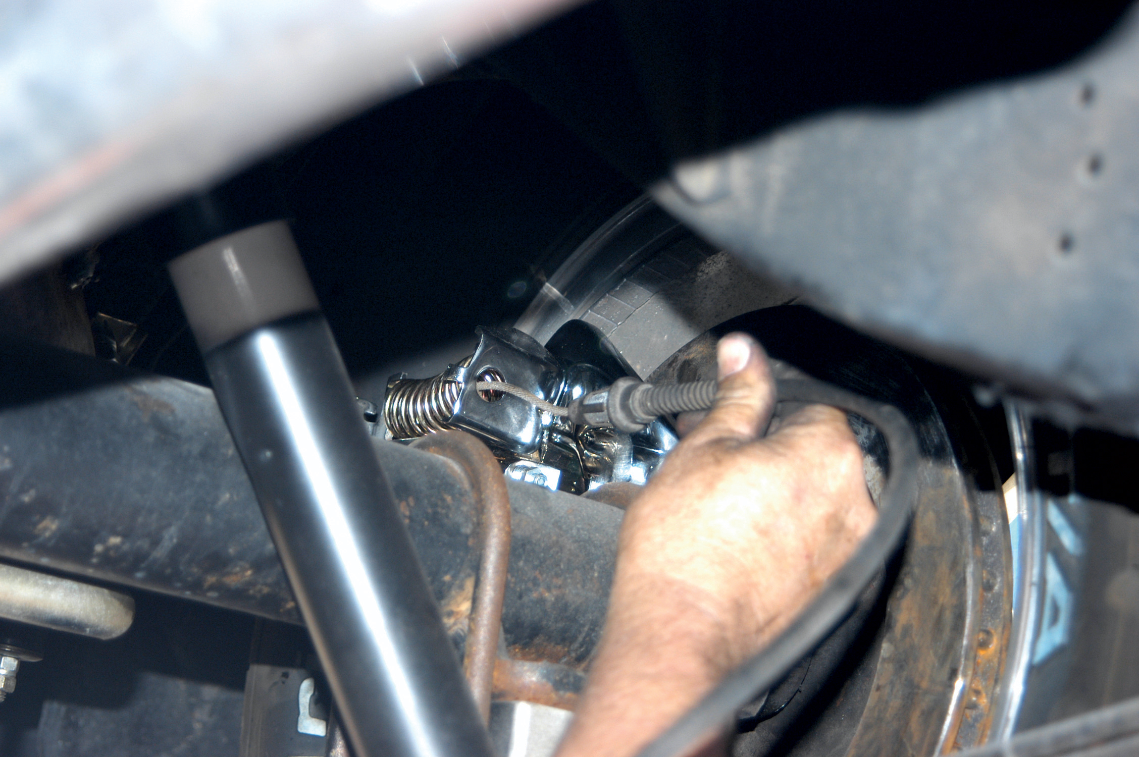The knob on the end of the bracket will fit into the emergency brake clip. When the cable is connected, you can make the necessary adjustments to the cable mechanism. The line should have almost no slack when it is adjusted properly.