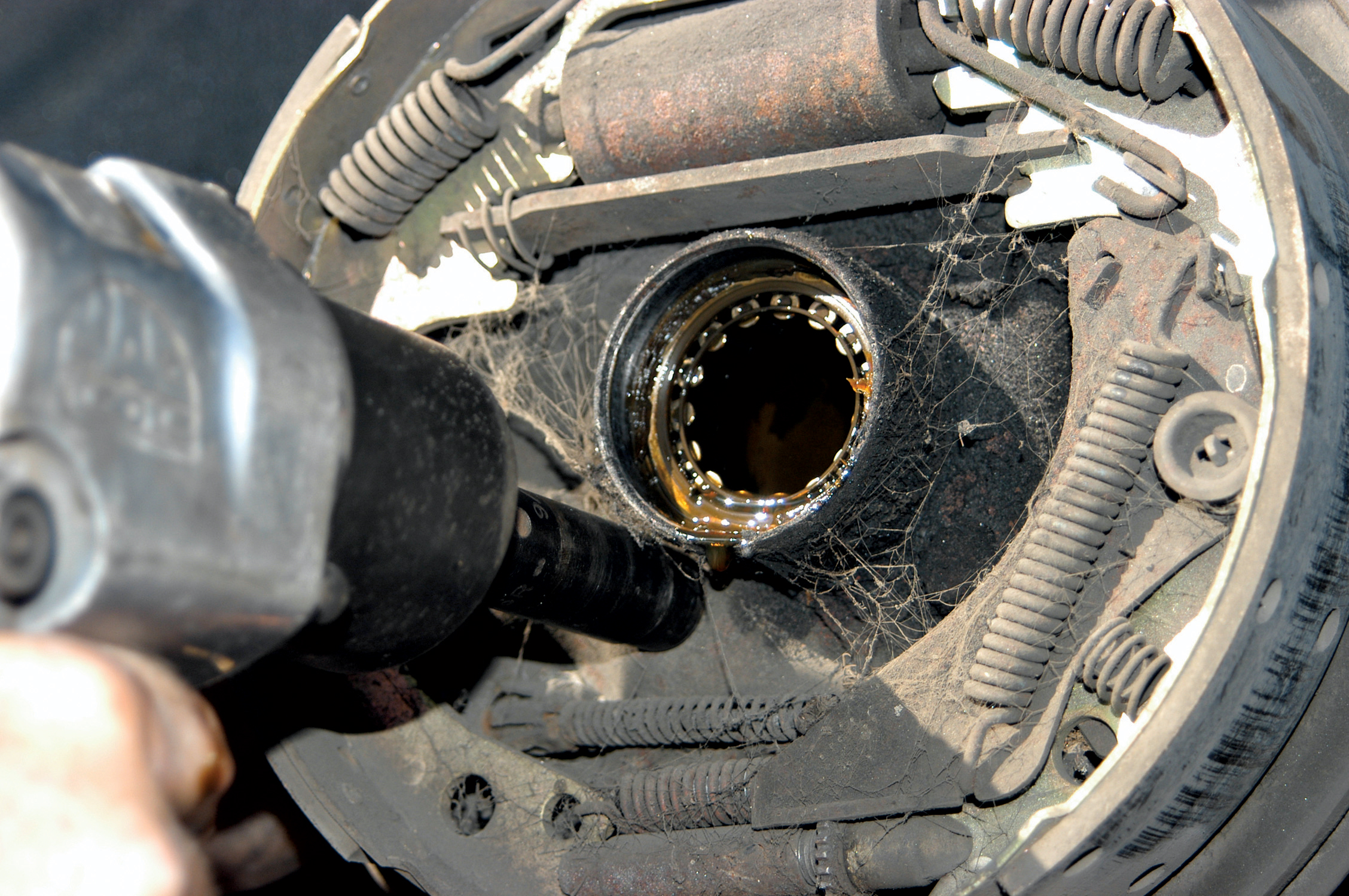 Using the axle as a pry bar, they also removed the axle seal. A new seal will be installed later.