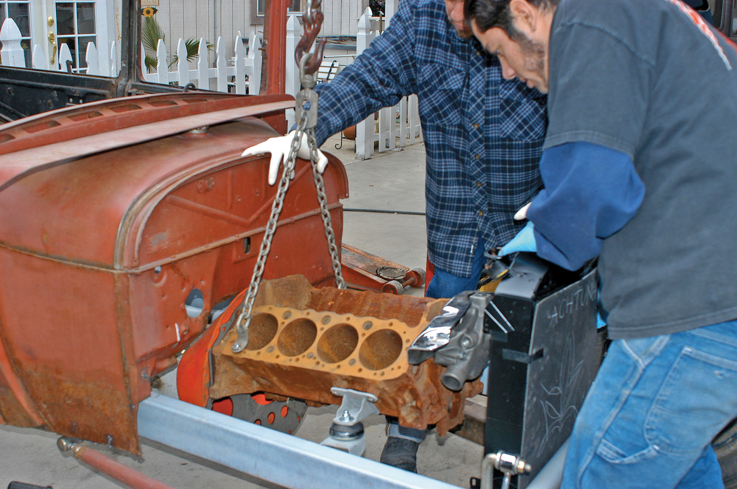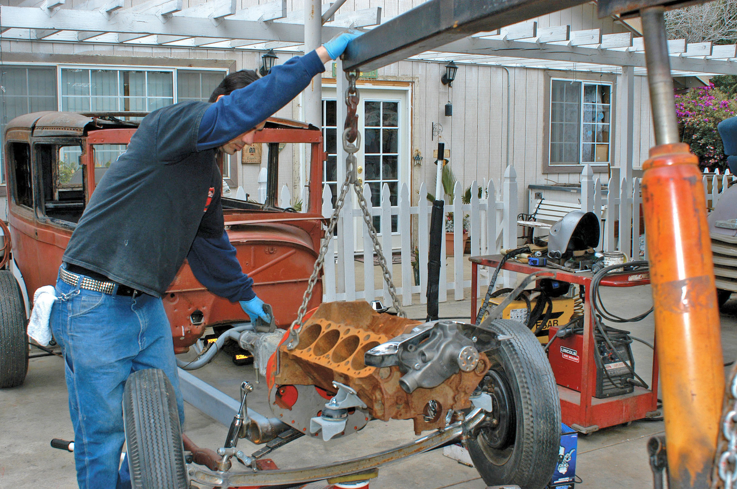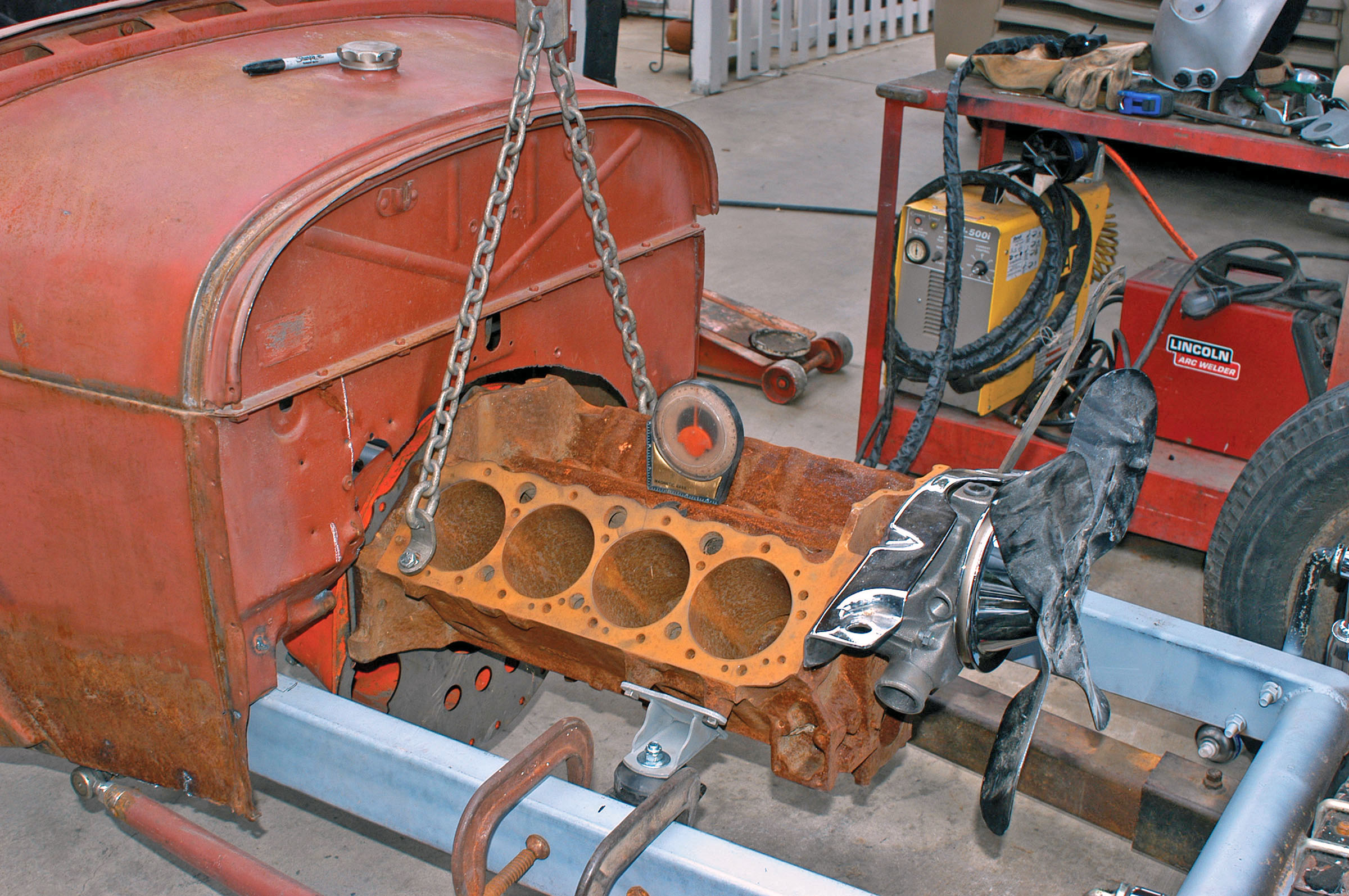 Amadeus decided that it would be cost effective to purchase a new chassis for the rod, because by the time he started with a stock Model A chassis and fixed all of the problems it would cost more money than buying a nice unit from Last Refuge Hot Rods. Amadeus could have used any number of old V-8 engines, but again, for reliability he selected a 350 Chevy engine and totally rebuilt it with a 0.030-inch overbore and a 400 crank, giving the engine 383 cubic inches. The engine also has fuel injection heads and a high-performance cam, and it made more than 400 horsepower on the dyno. The engine is going to be hooked to a Muncie four-speed transmission, and that gives you a good idea of why he selected a strong 9-inch Ford rearend. The Last Refuge Hot Rods chassis didn’t come with engine mounts, so it was up to Amadeus to install them himself. Amadeus contacted Chassis Engineering and ordered a set of engine mounts. The transmission mount will be engineered after the front mounts are installed.