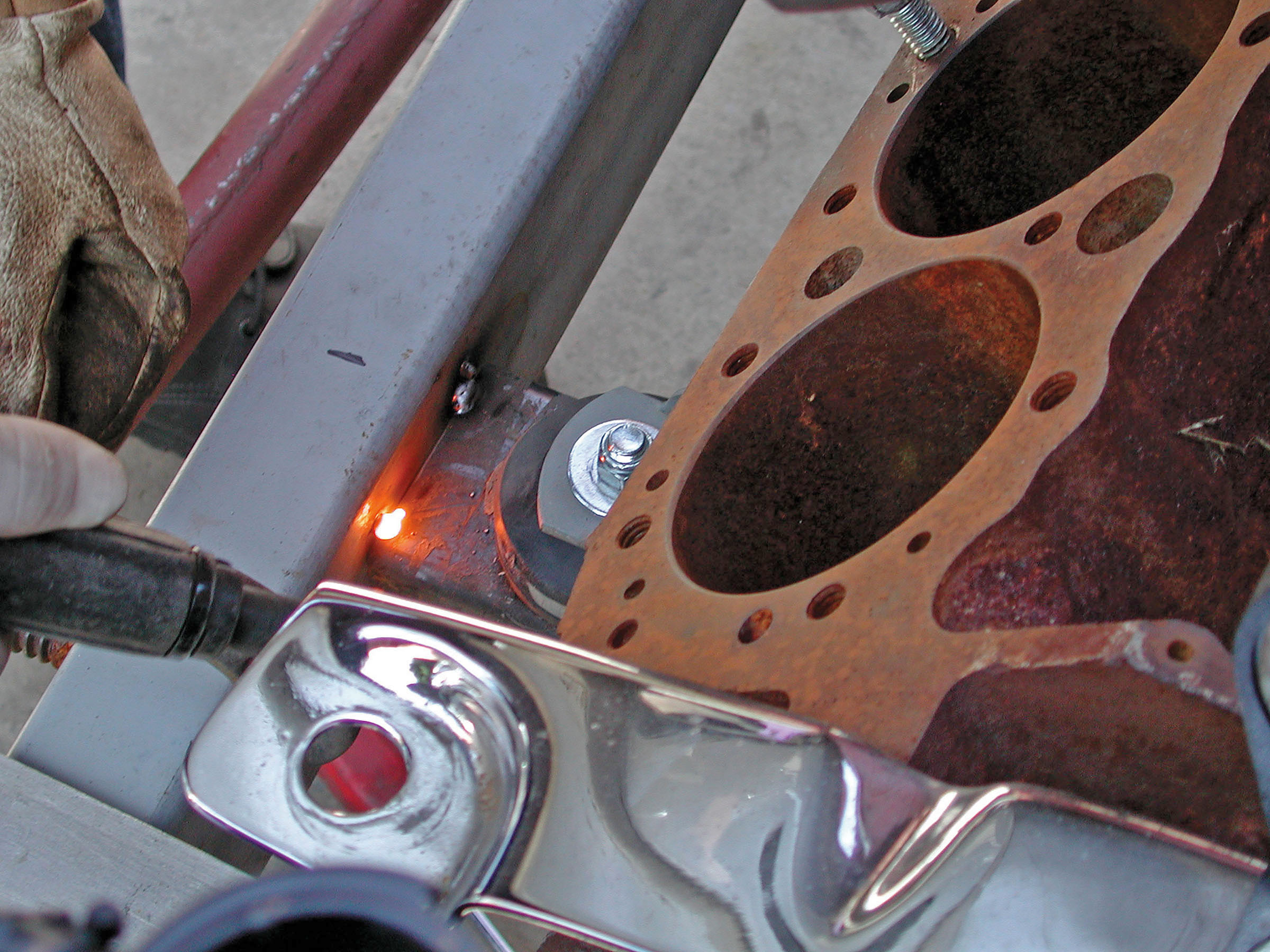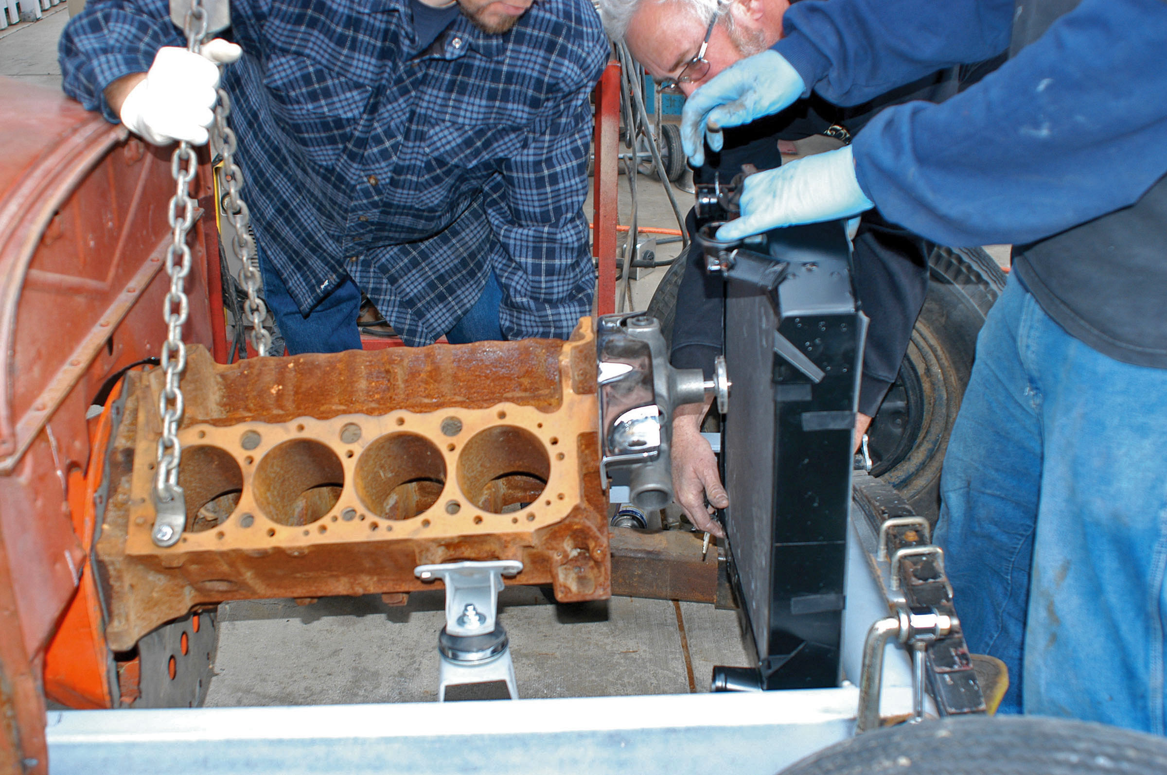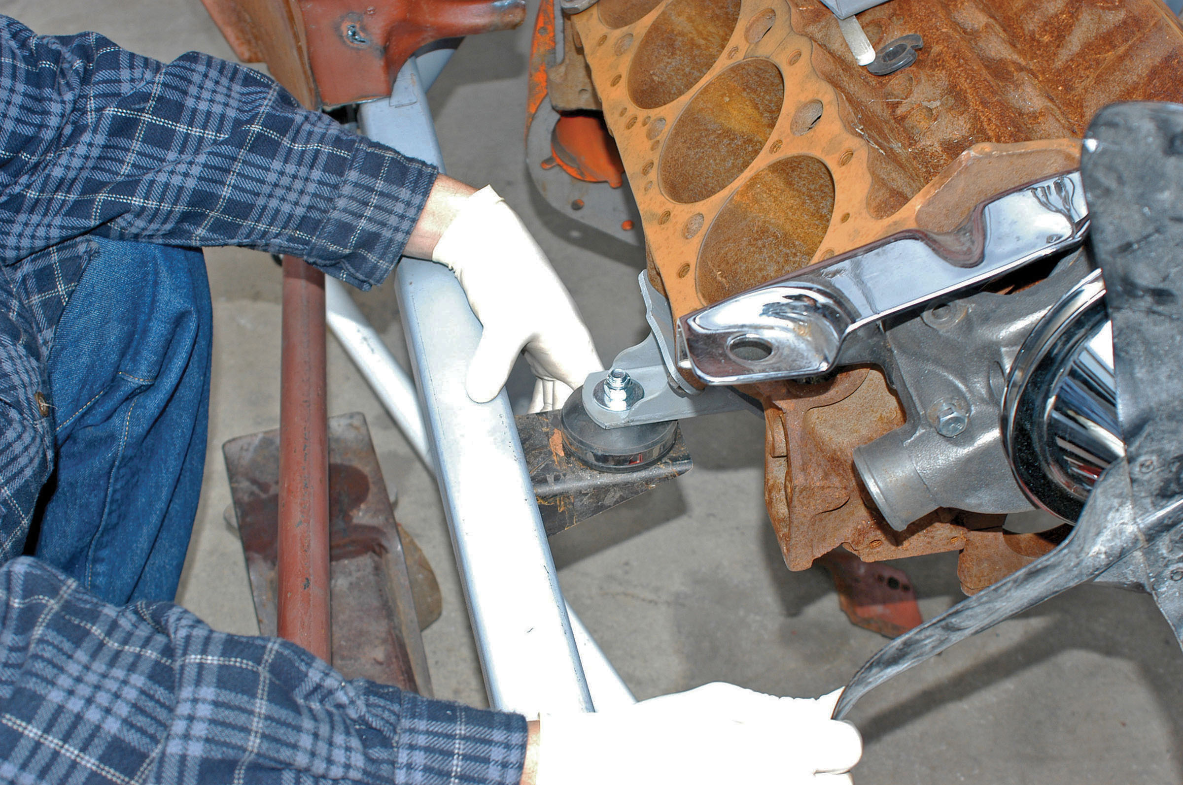 Amadeus decided that it would be cost effective to purchase a new chassis for the rod, because by the time he started with a stock Model A chassis and fixed all of the problems it would cost more money than buying a nice unit from Last Refuge Hot Rods. Amadeus could have used any number of old V-8 engines, but again, for reliability he selected a 350 Chevy engine and totally rebuilt it with a 0.030-inch overbore and a 400 crank, giving the engine 383 cubic inches. The engine also has fuel injection heads and a high-performance cam, and it made more than 400 horsepower on the dyno. The engine is going to be hooked to a Muncie four-speed transmission, and that gives you a good idea of why he selected a strong 9-inch Ford rearend. The Last Refuge Hot Rods chassis didn’t come with engine mounts, so it was up to Amadeus to install them himself. Amadeus contacted Chassis Engineering and ordered a set of engine mounts. The transmission mount will be engineered after the front mounts are installed.