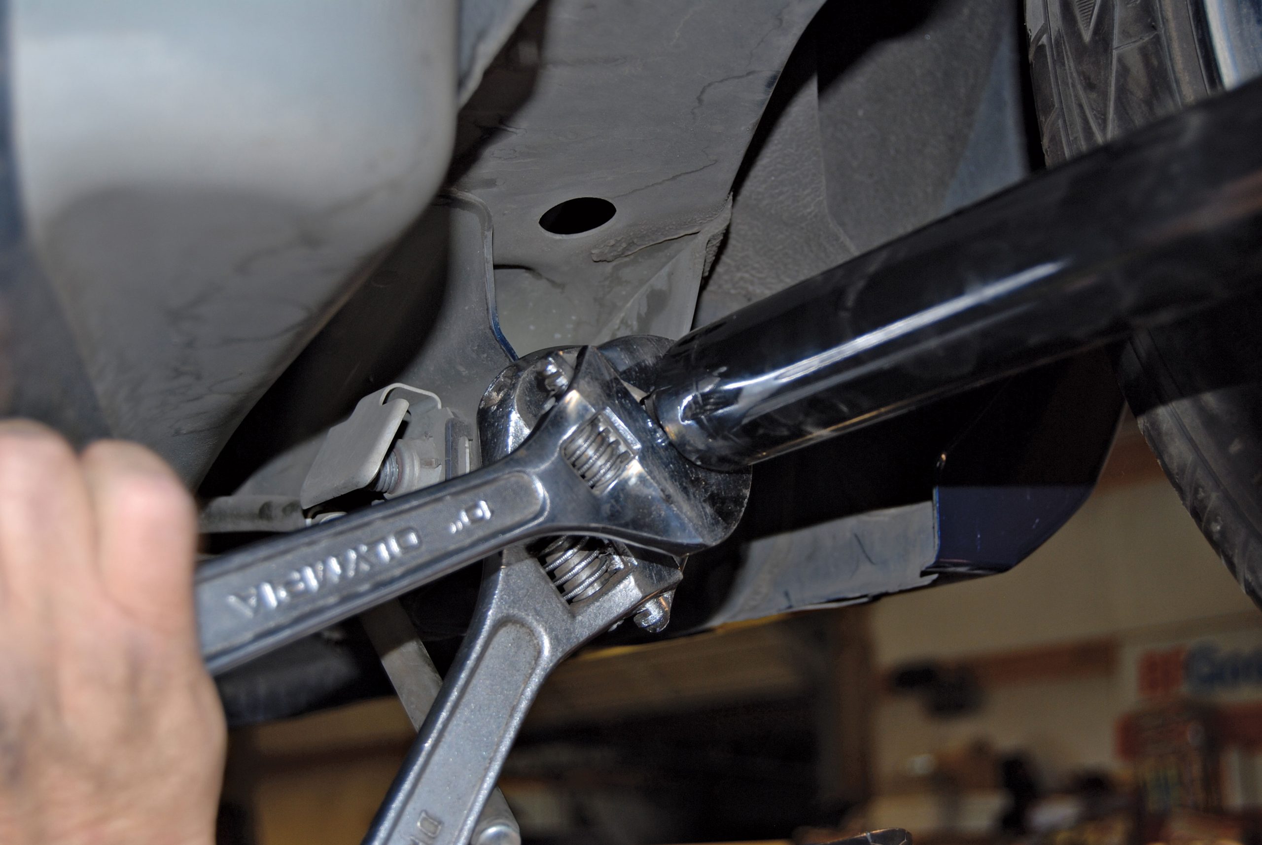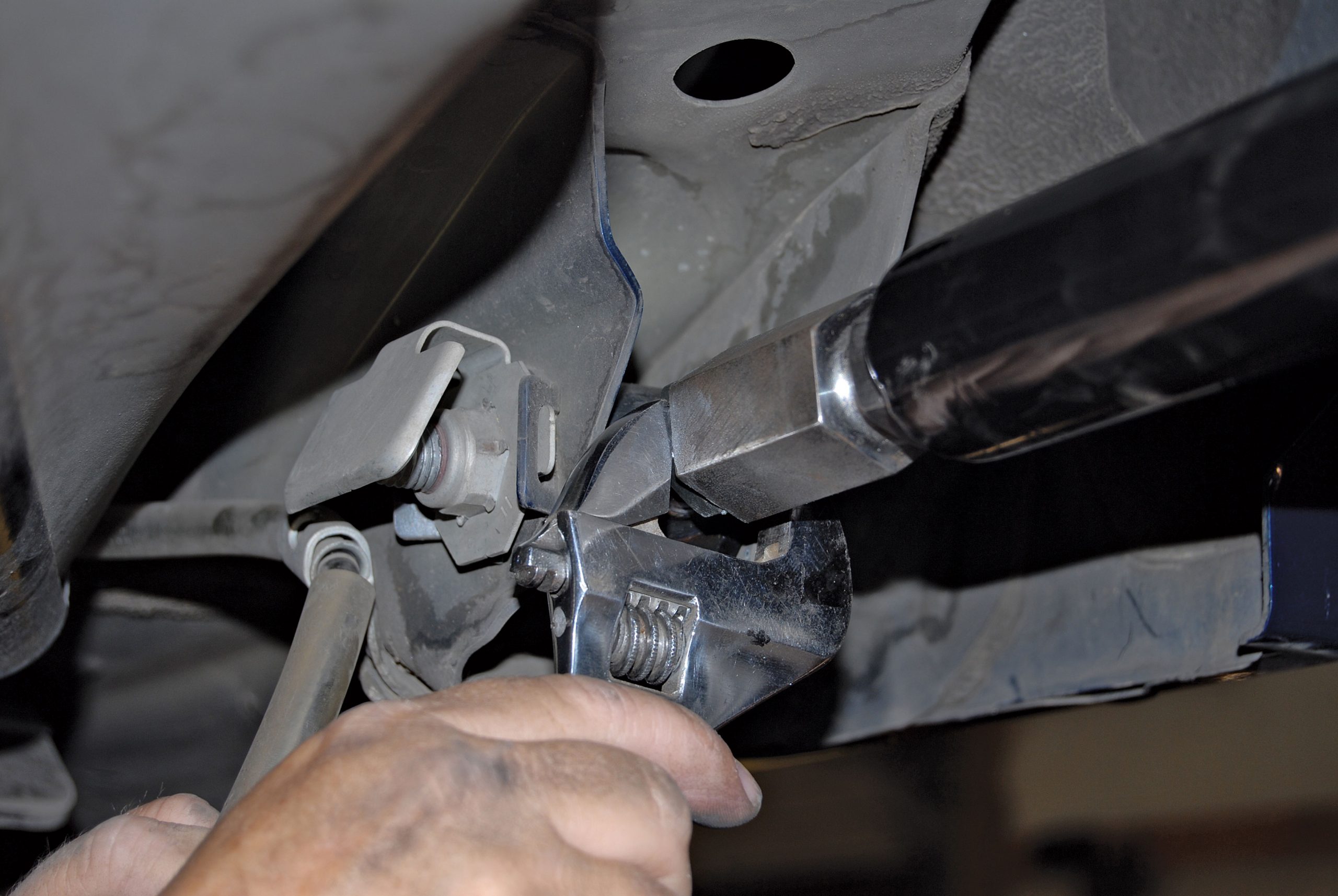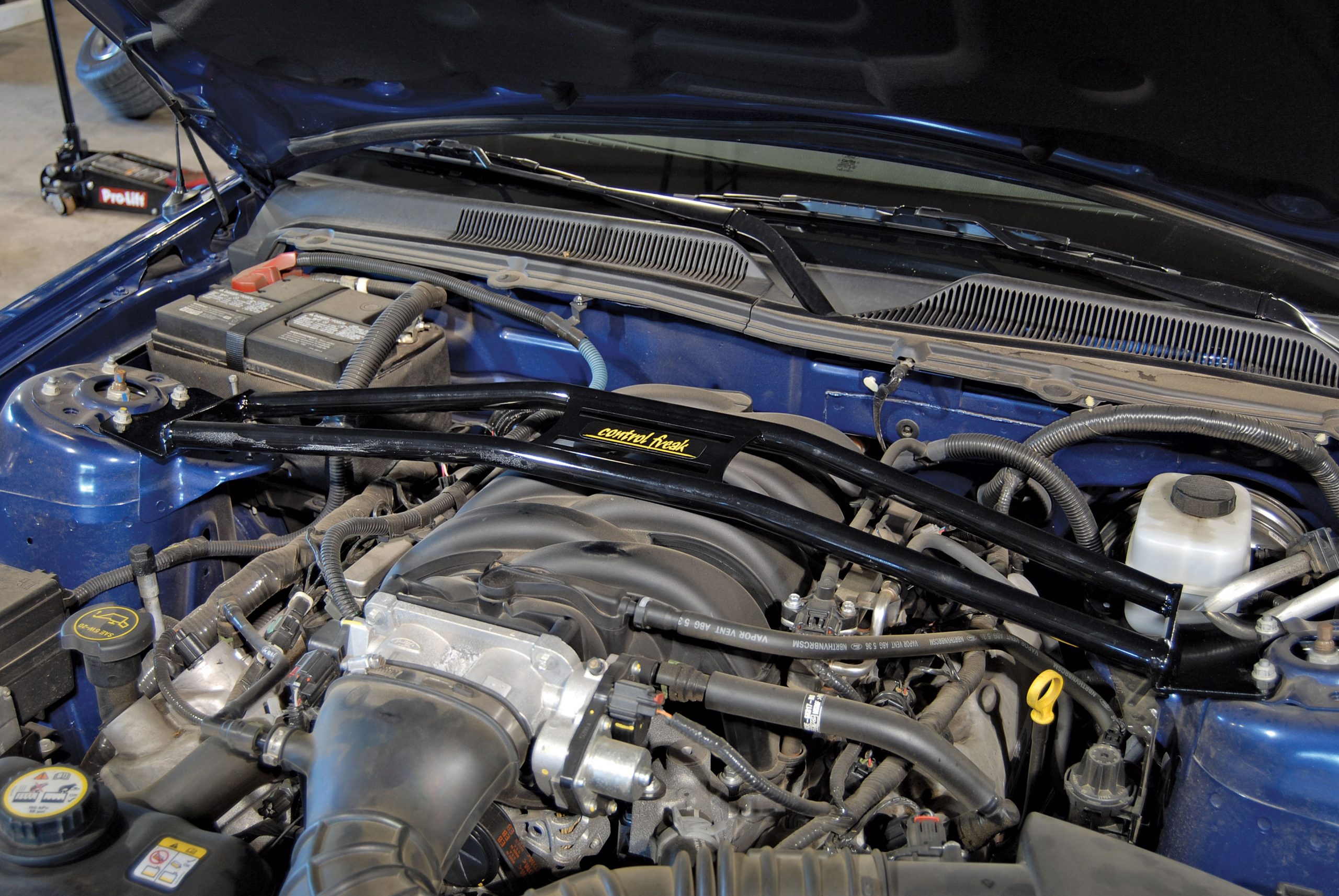 Kamhi responded by sending us a variety of Control Freak products for the S197 platform. These parts included a tubular-steel strut tower brace that installs in under 5 minutes, yet reinforces the Mustang’s body structure to prevent unwanted torsional twist (flex) that will literally pull your tires out of alignment, thus reducing traction. This installation would hardly be exhausting, so the company also sent along an adjustable Panhard bar and matching lower control arms.