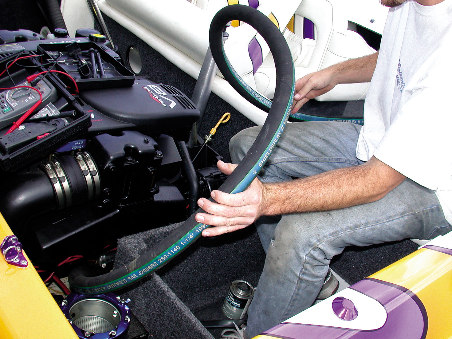 The hose that runs from the sea strainer to the seawater pump will need to be replaced with new hose (it’s not long enough after cutting). Here, Duffin figures out how much hose he needs.