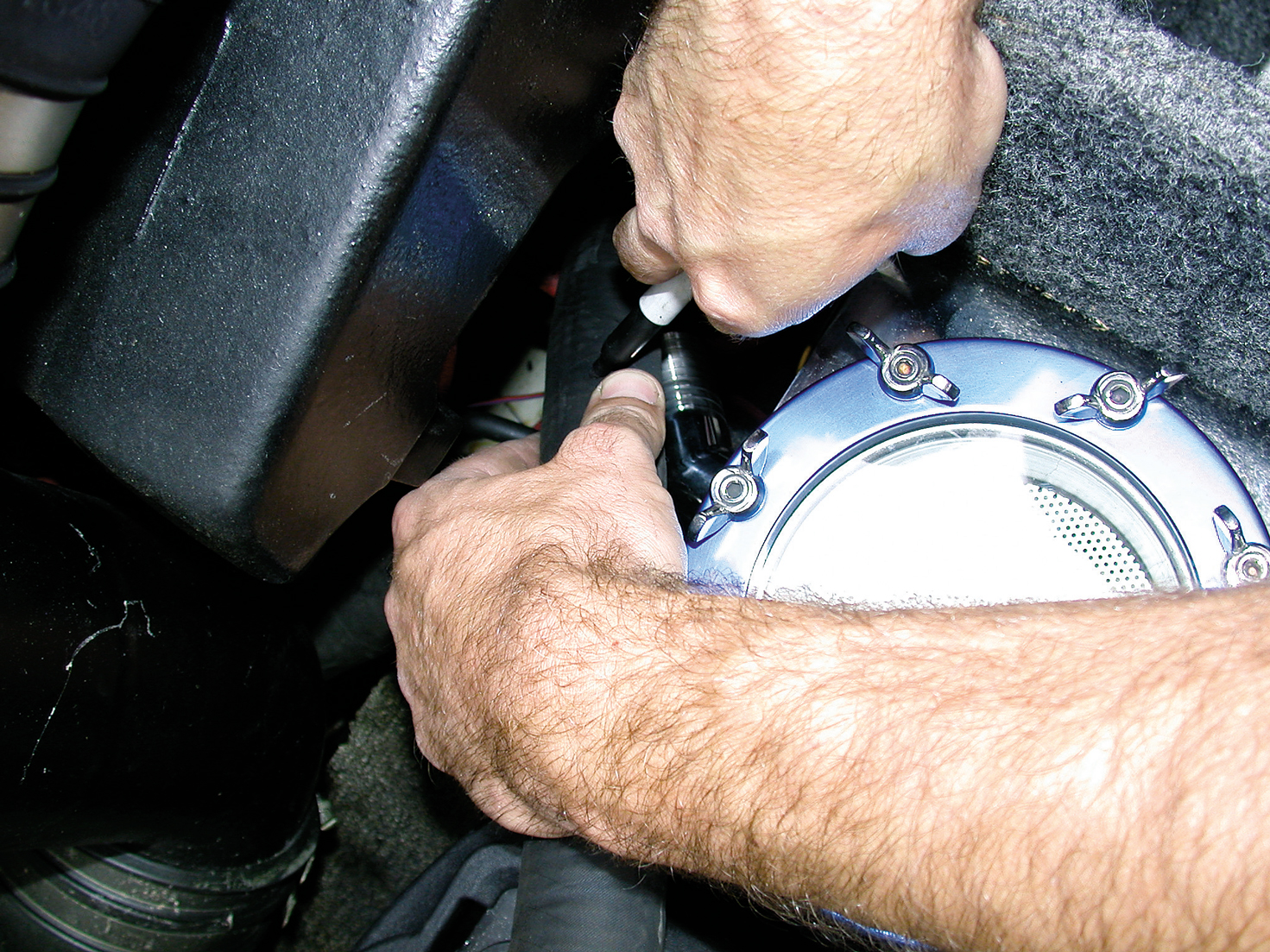 Duffin tightens the hose clamp.