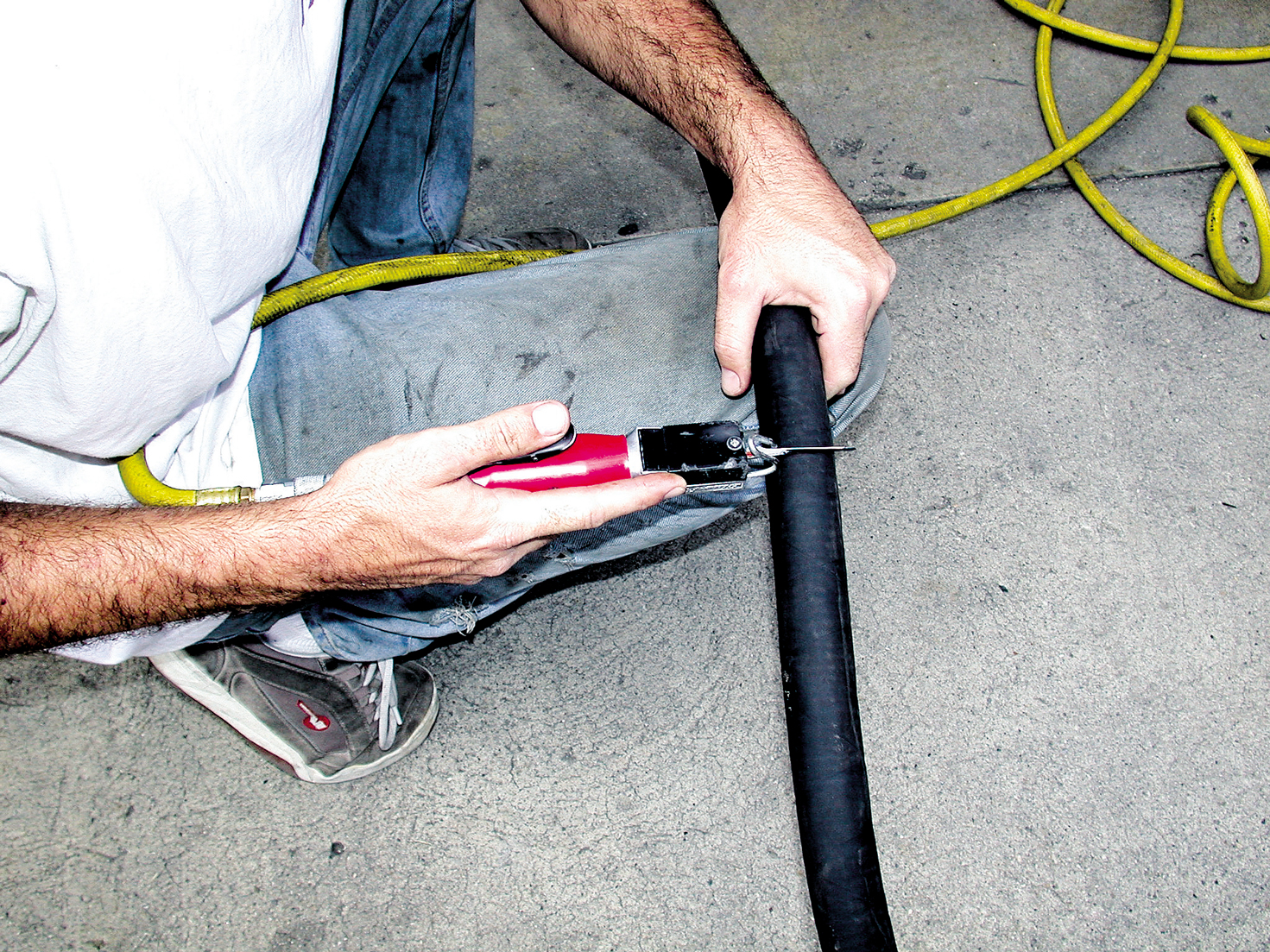 A marker is used to identify where the hose will be cut.