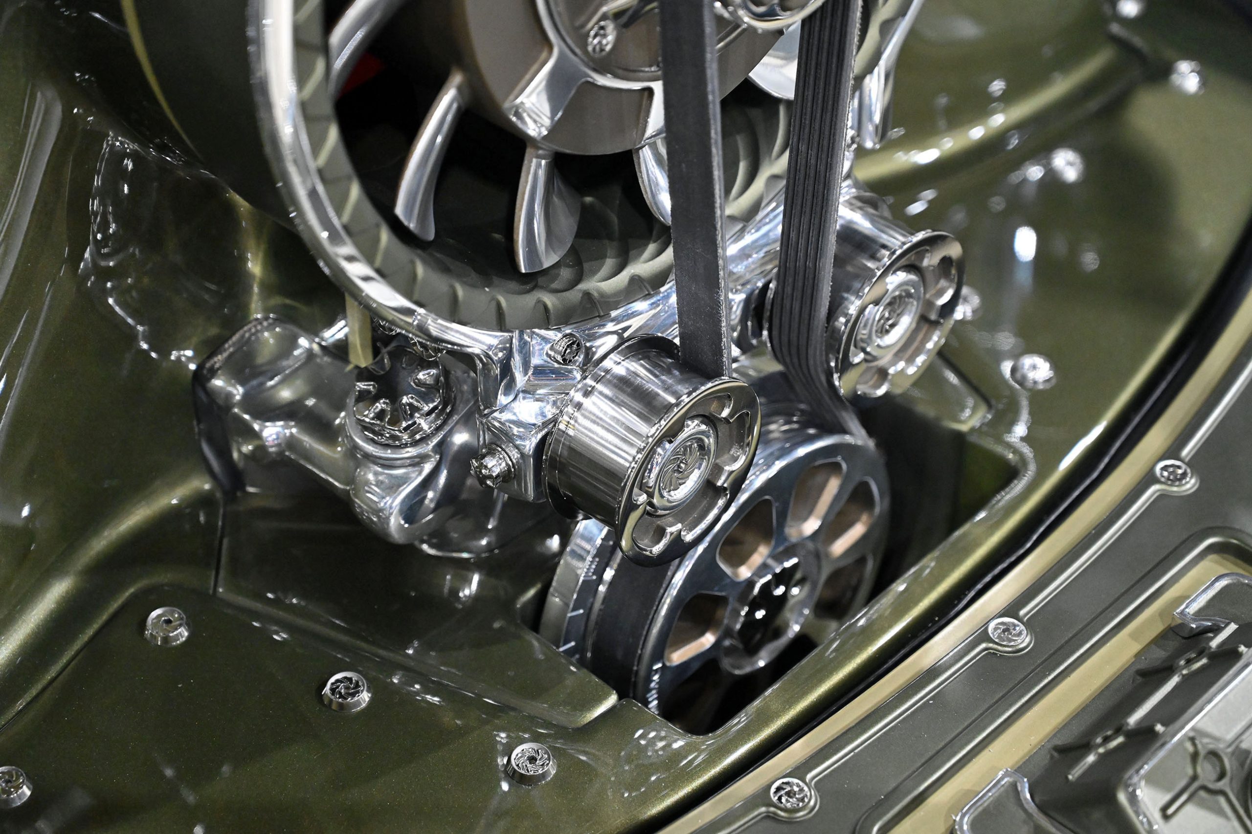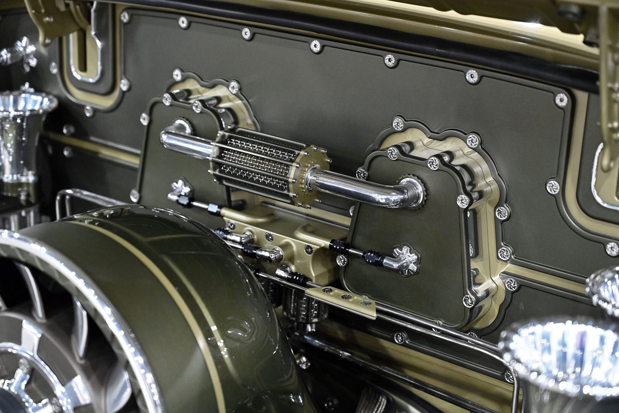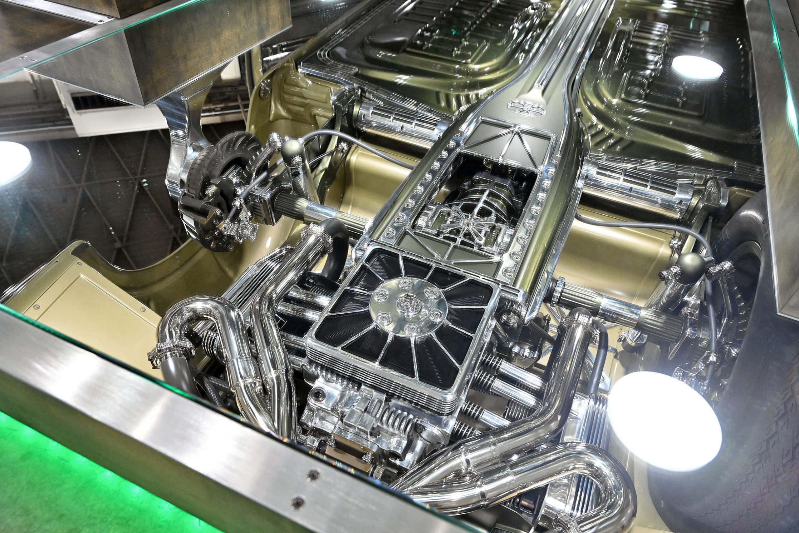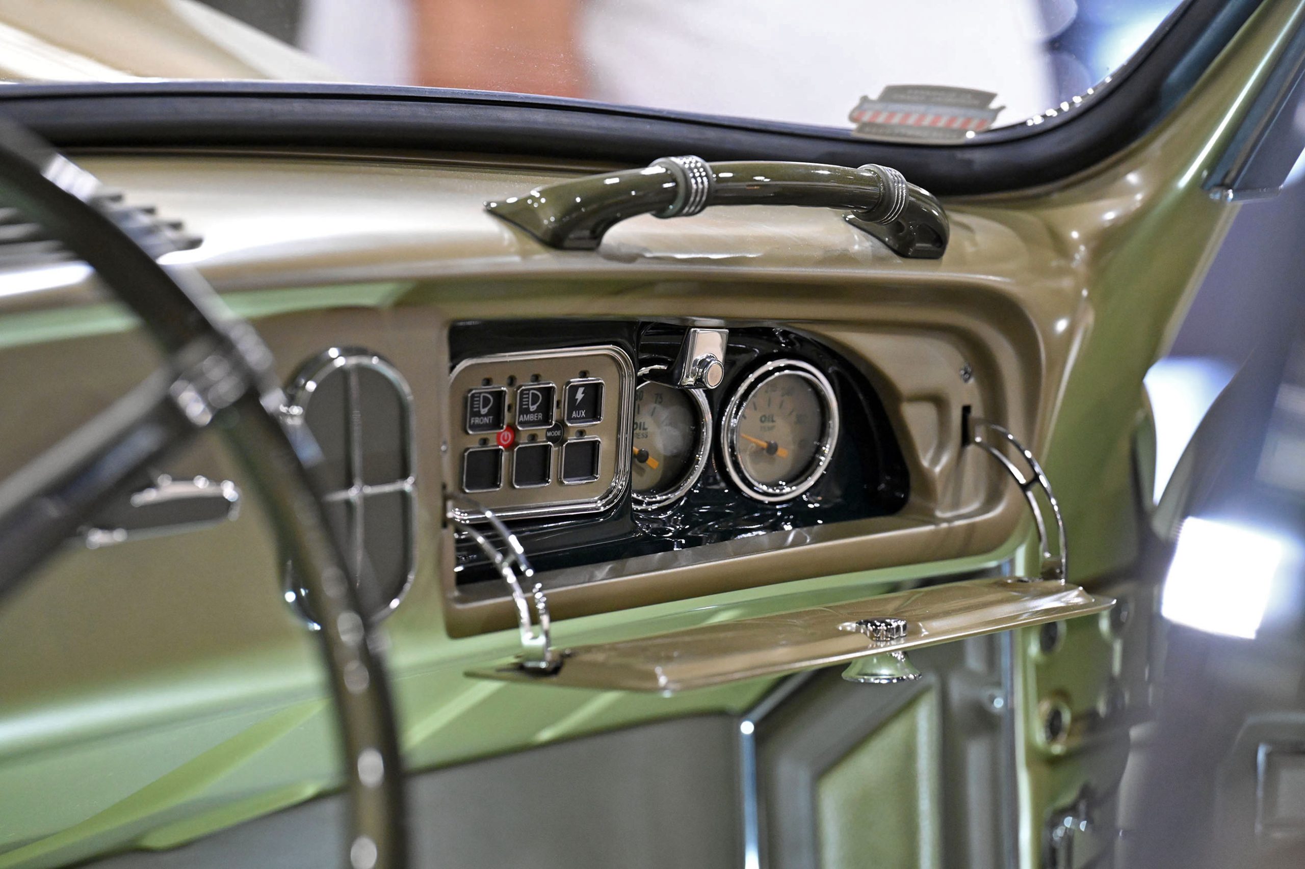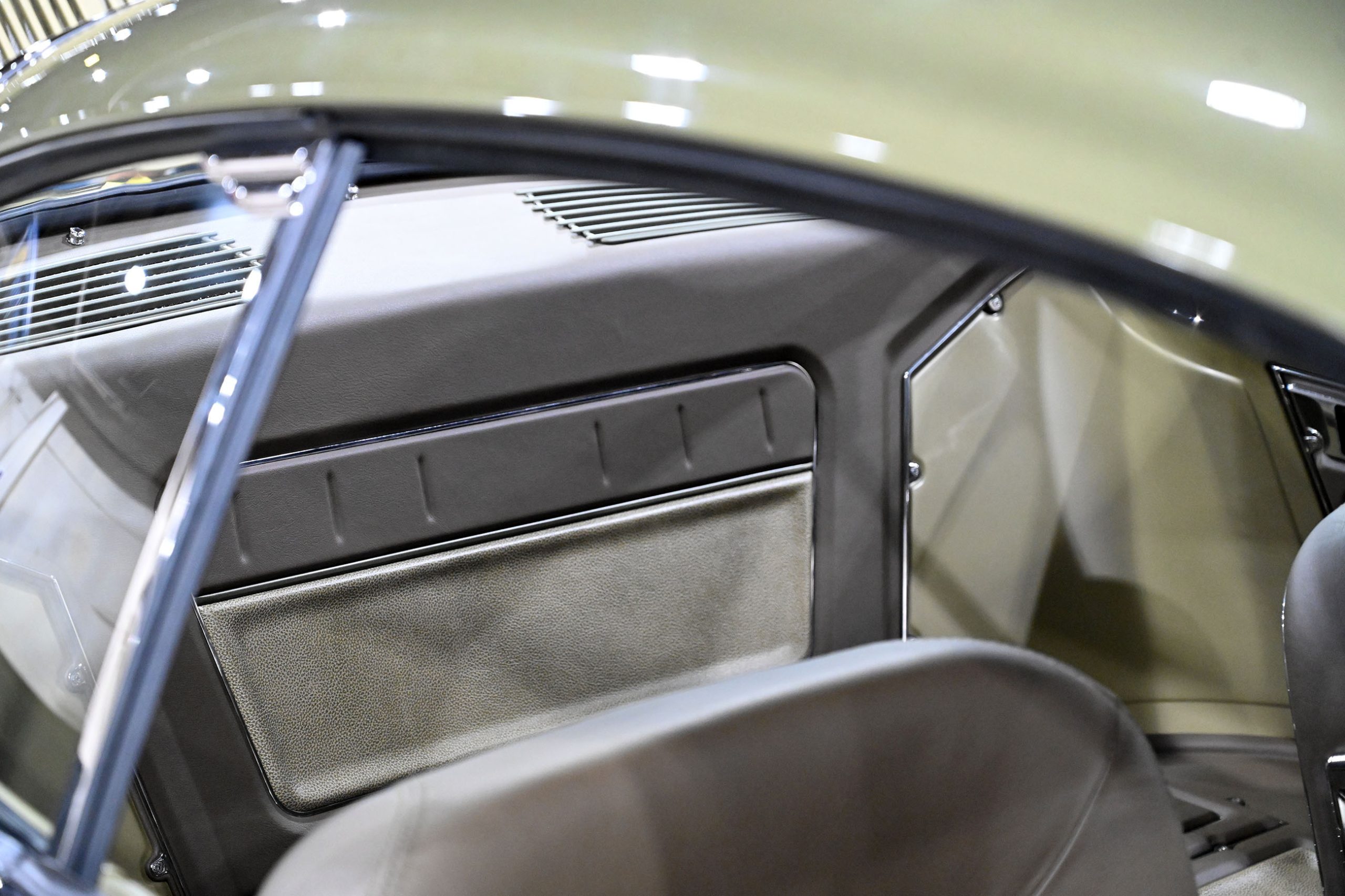 The finish is pure confidence. A custom two-tone green—olive at its foundation with a darker green roof—was mixed using Glasurit, incorporating a subtle gold pearl that only reveals itself under the right light. The paint alone took roughly eight months to perfect, including the sourcing of a discontinued toner to achieve exactly the right tone.