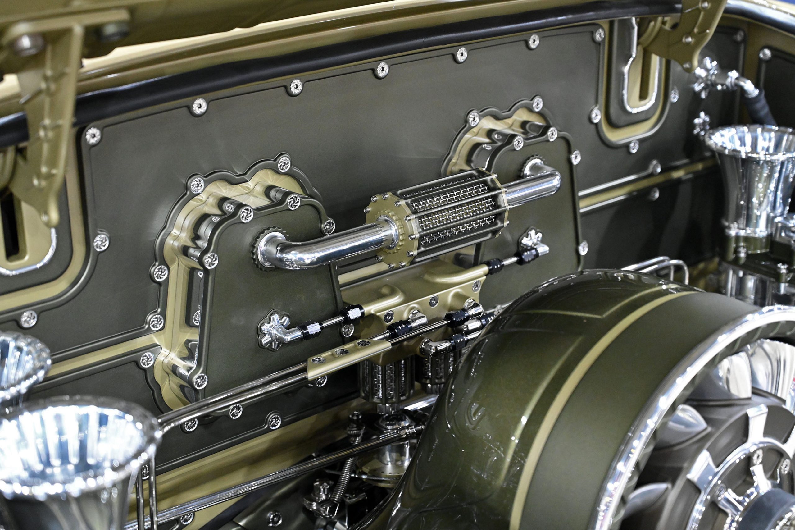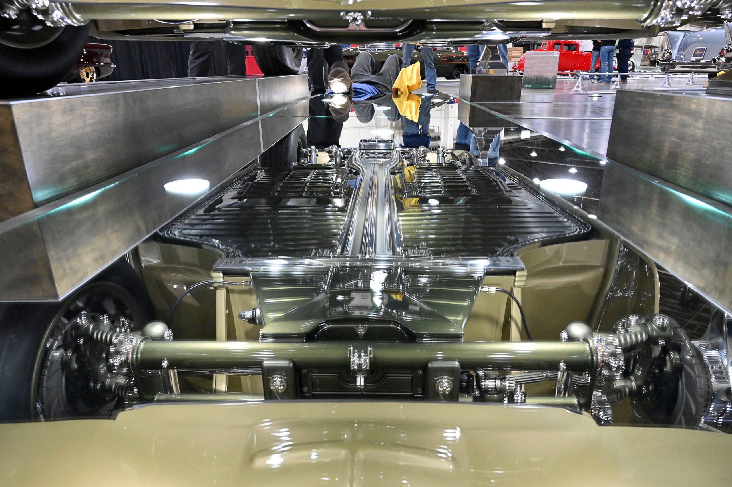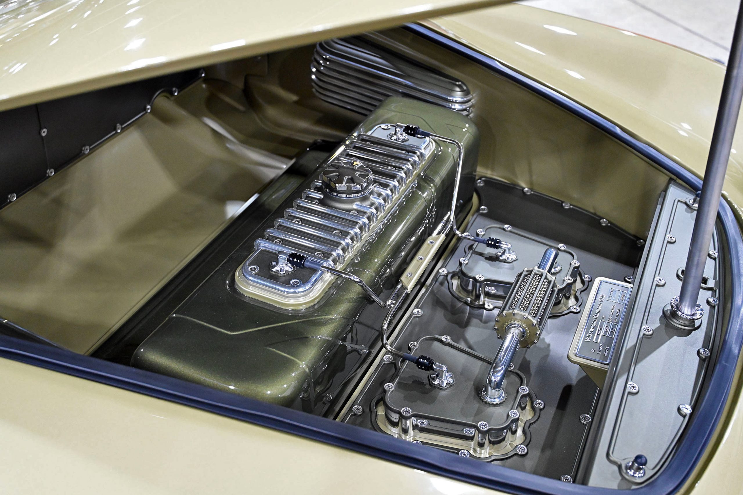 This 1955 Karmann Ghia wasn’t just customized—it was fully realized. Nearly 80–90 percent of the chassis was reworked or fabricated. The front end was extended to better center the wheels. The bulkhead leaned back four degrees for improved caster and drivability. Even the undercarriage received the same visual attention as the exterior.