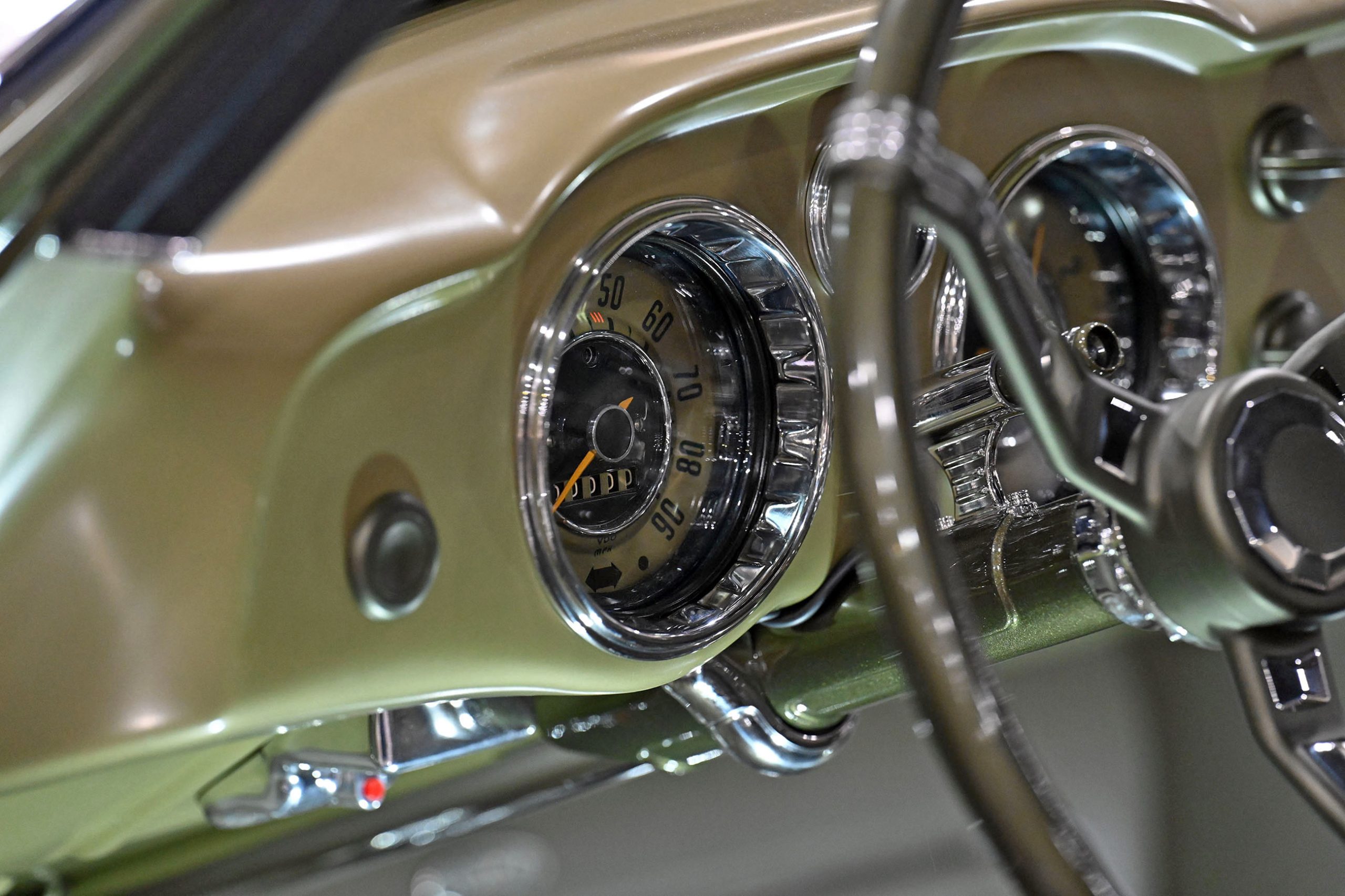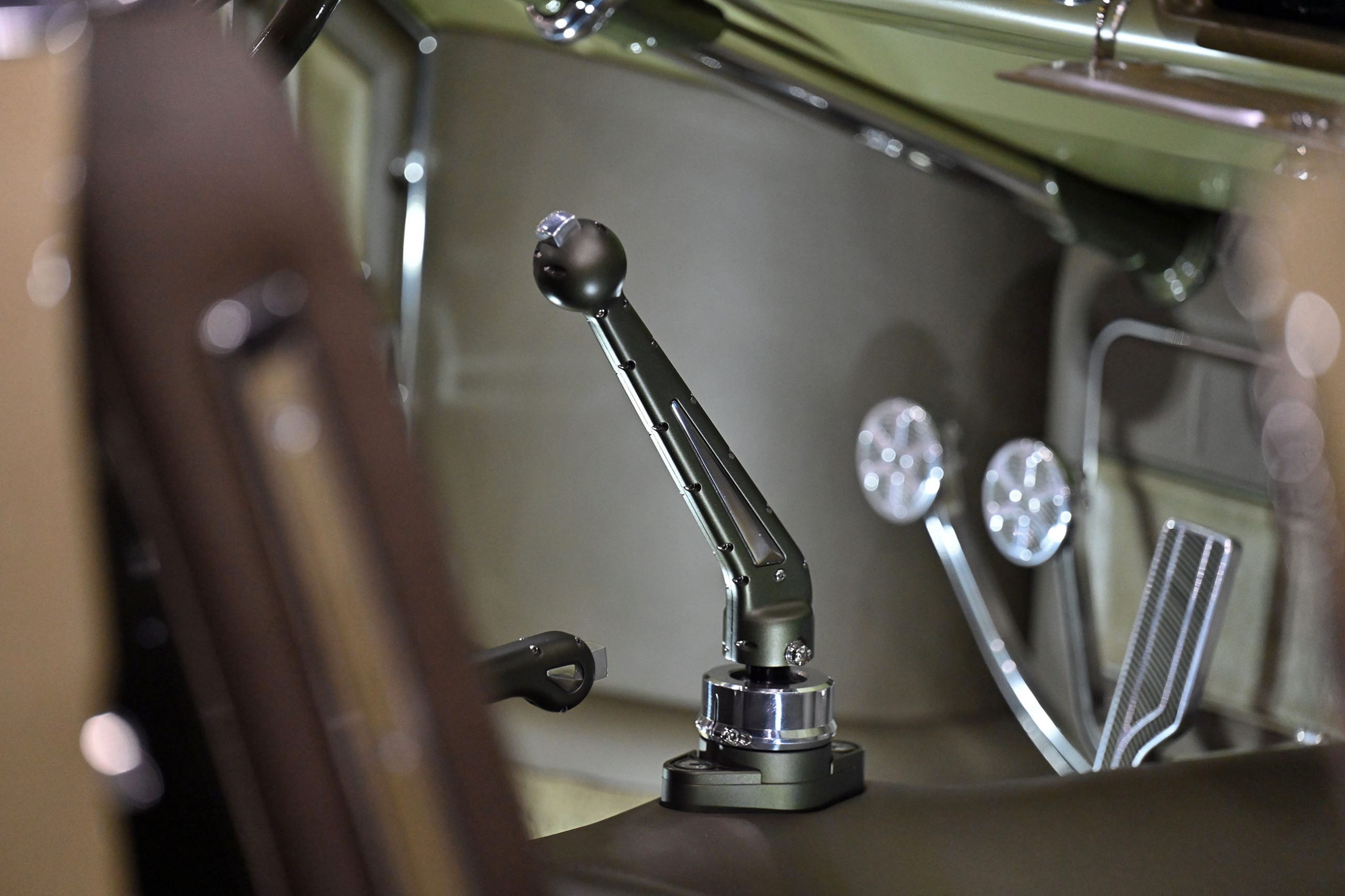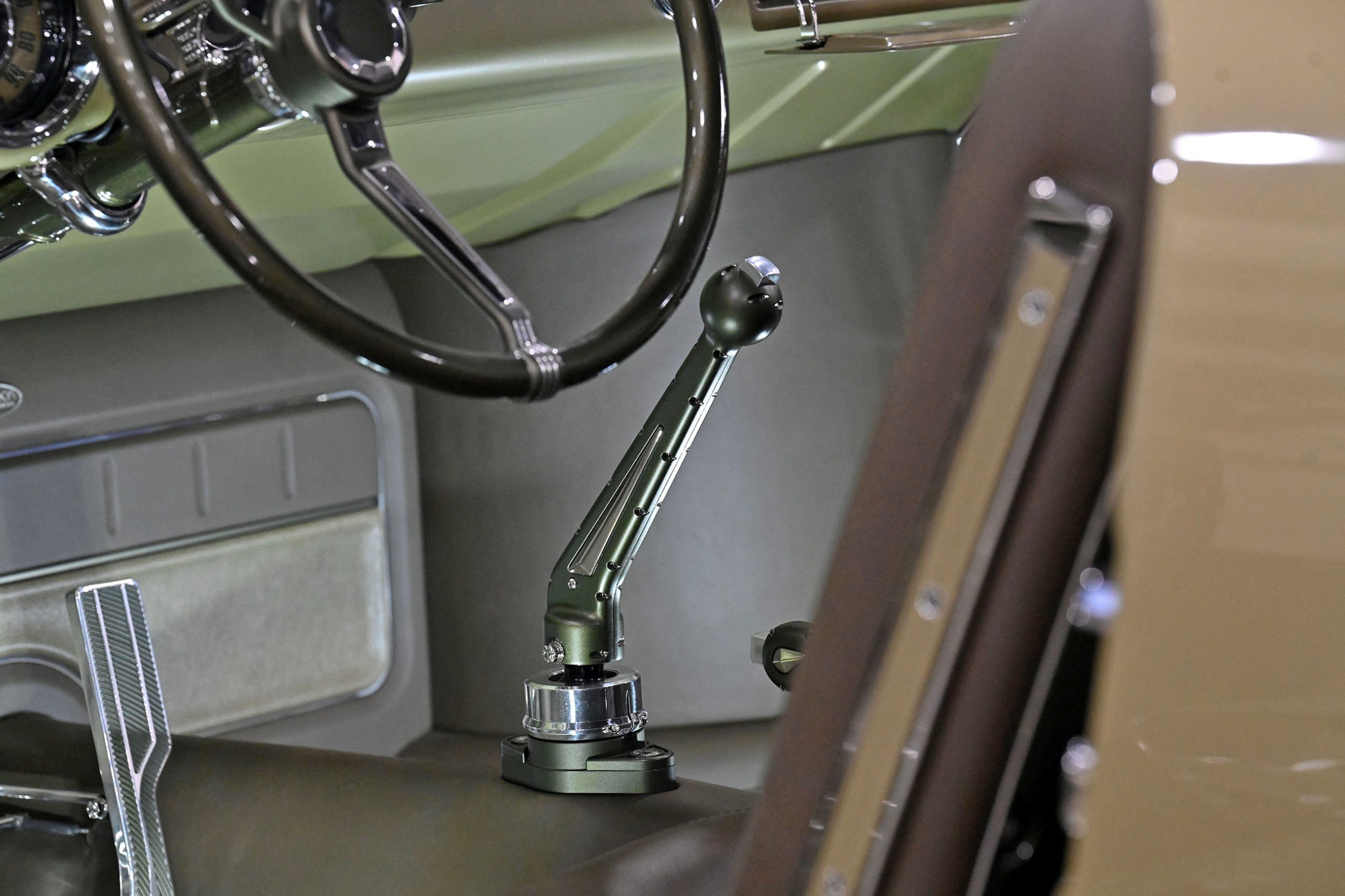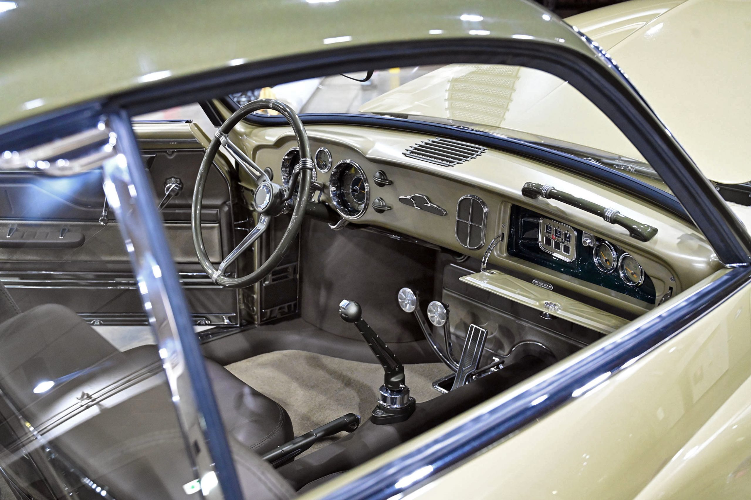 Custom aluminum door panels with stainless surrounds, machined window cranks, steering components, shifter, and column hardware were all produced in-house. Removable panels allow real service access, while hidden gauges live discreetly in the glove box.