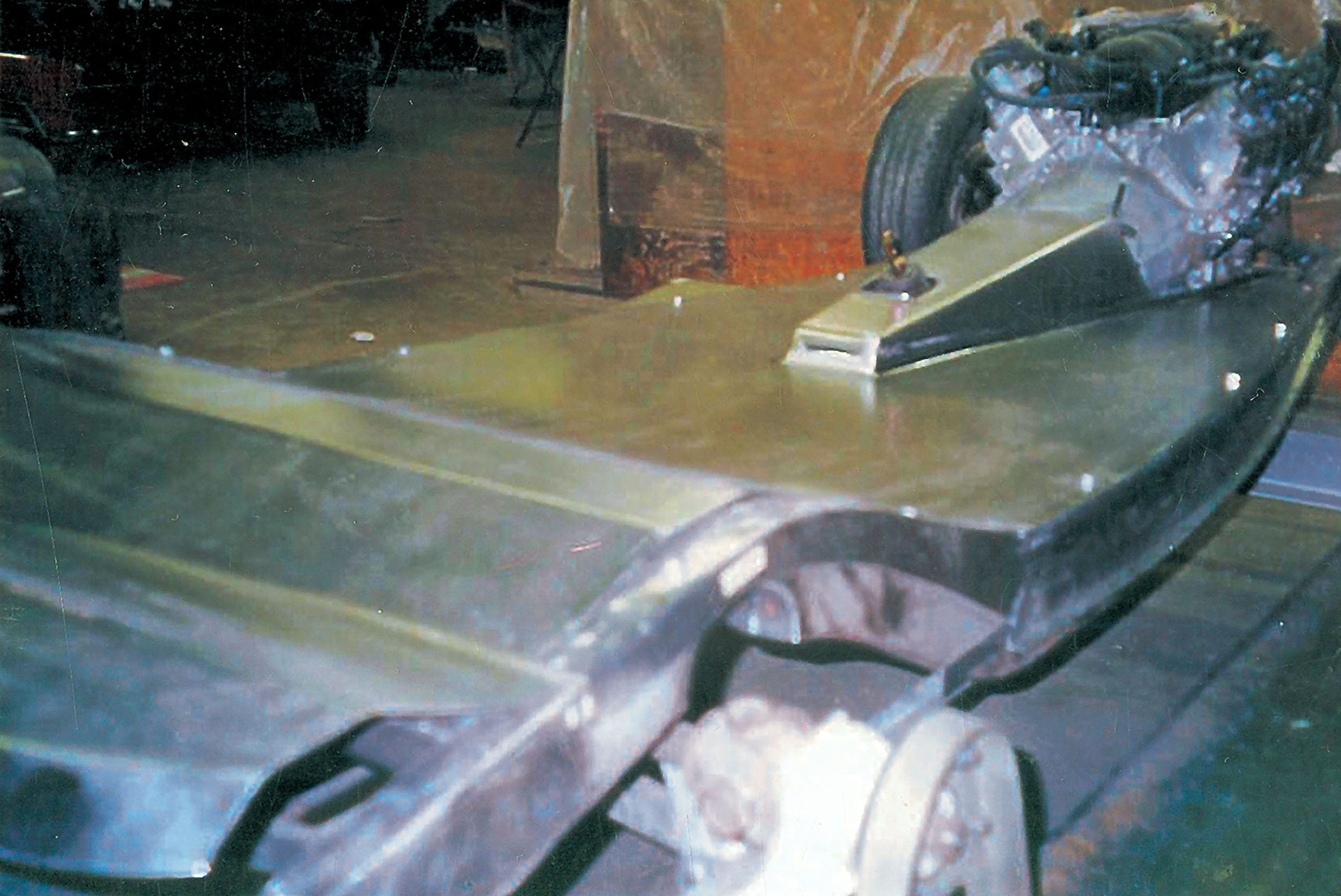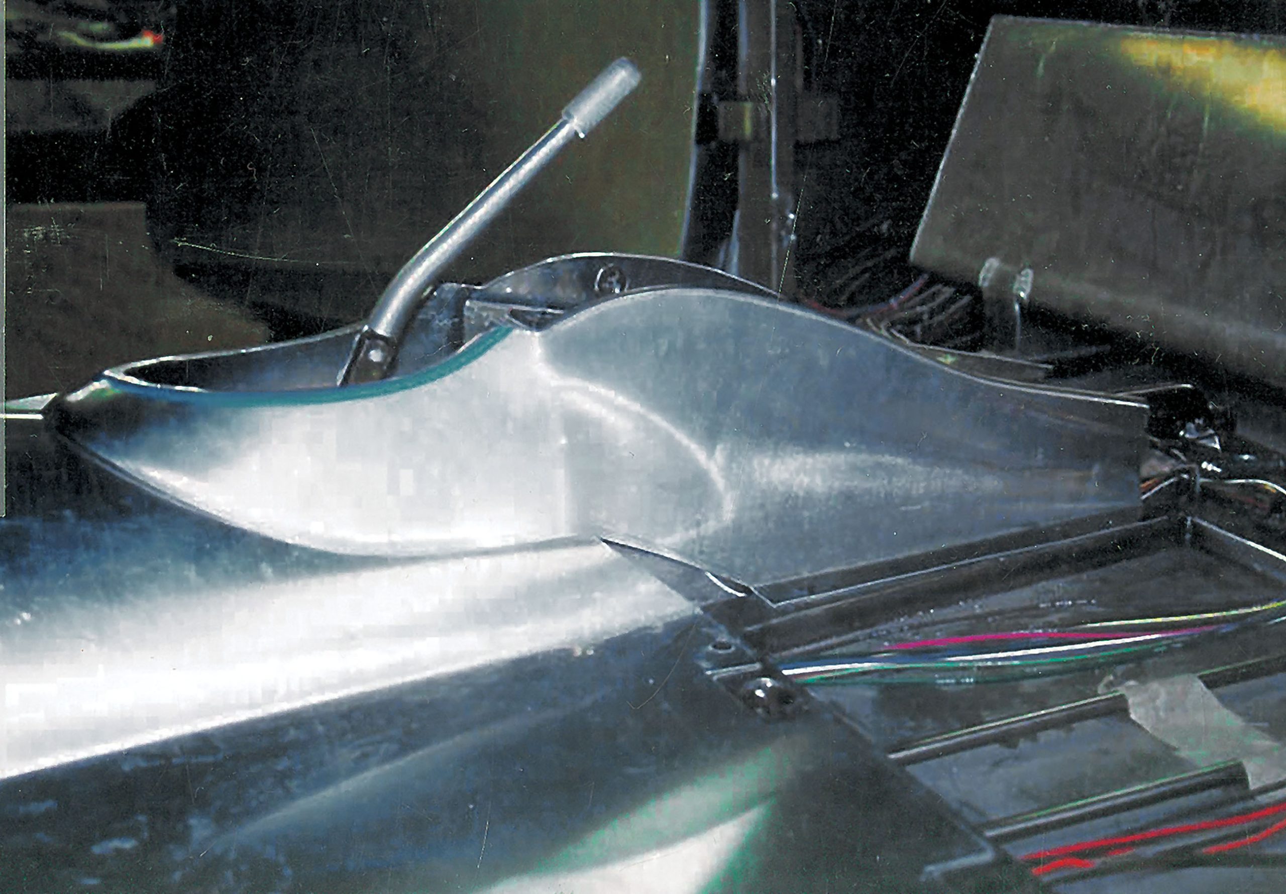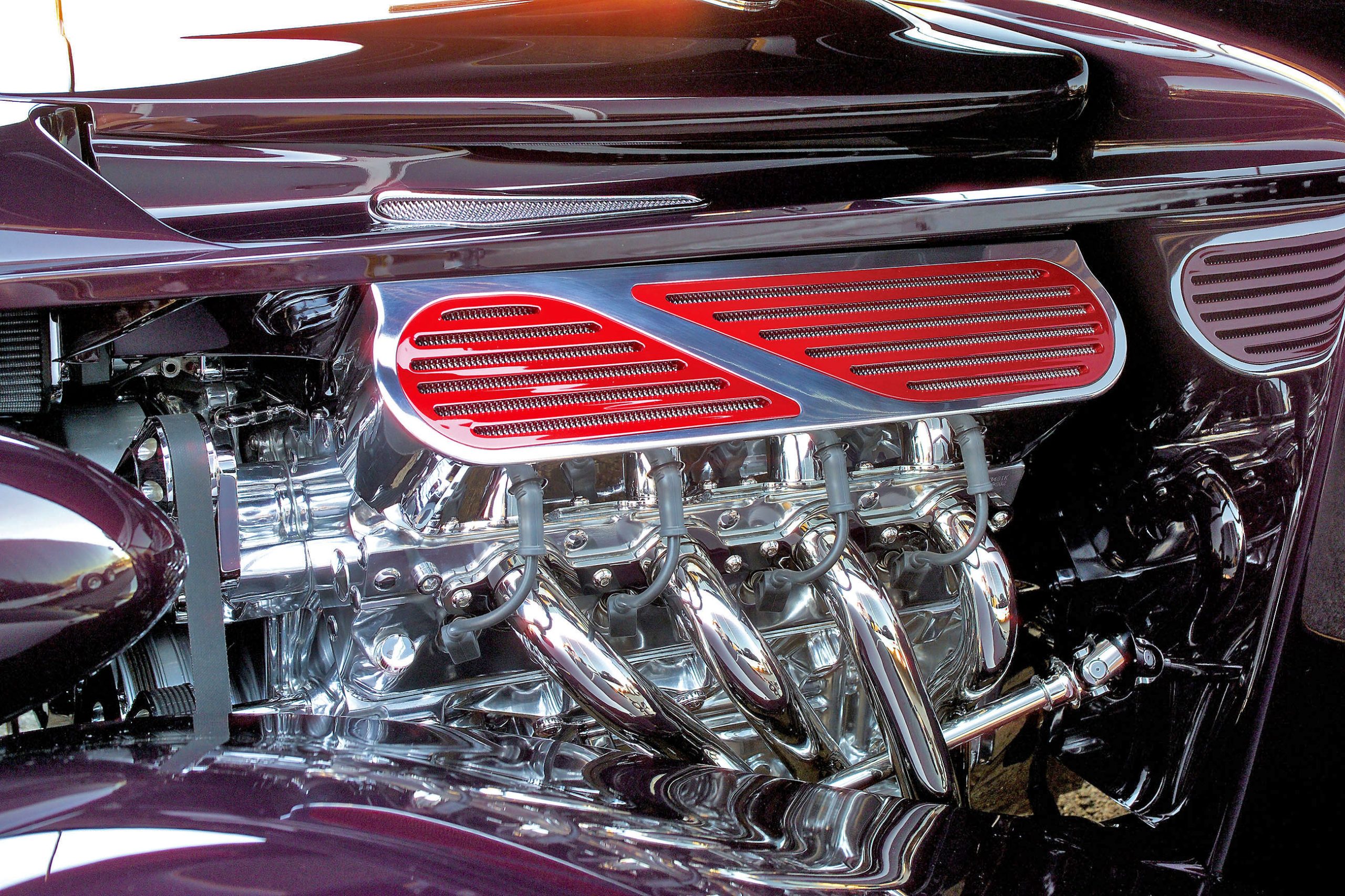 As we mentioned earlier, special valve covers were made to cover the individual coil packs, lending a unique appearance similar to that of a big-block Chevy. As you might imagine, this took considerable time, because the valve covers themselves had to be patterned from wood and then machined from solid-aluminum blocks once their precise shapes were determined. While the top was relieved for the red grilled panels, the inner surfaces facing the intake manifold were vented to release heat generated by the coils. Similar modifications were made to the transmission, as well, including many hours of polishing to match the engine. All the electronic switches were rerouted or replaced with special plugs and covers, and button-head Allen bolts were used wherever possible. The trans mount was specially built from aluminum; hydraulic clutch fittings were remade to AN sizing; and a stainless vent tube and adjoining fittings were added to complete the detailing.