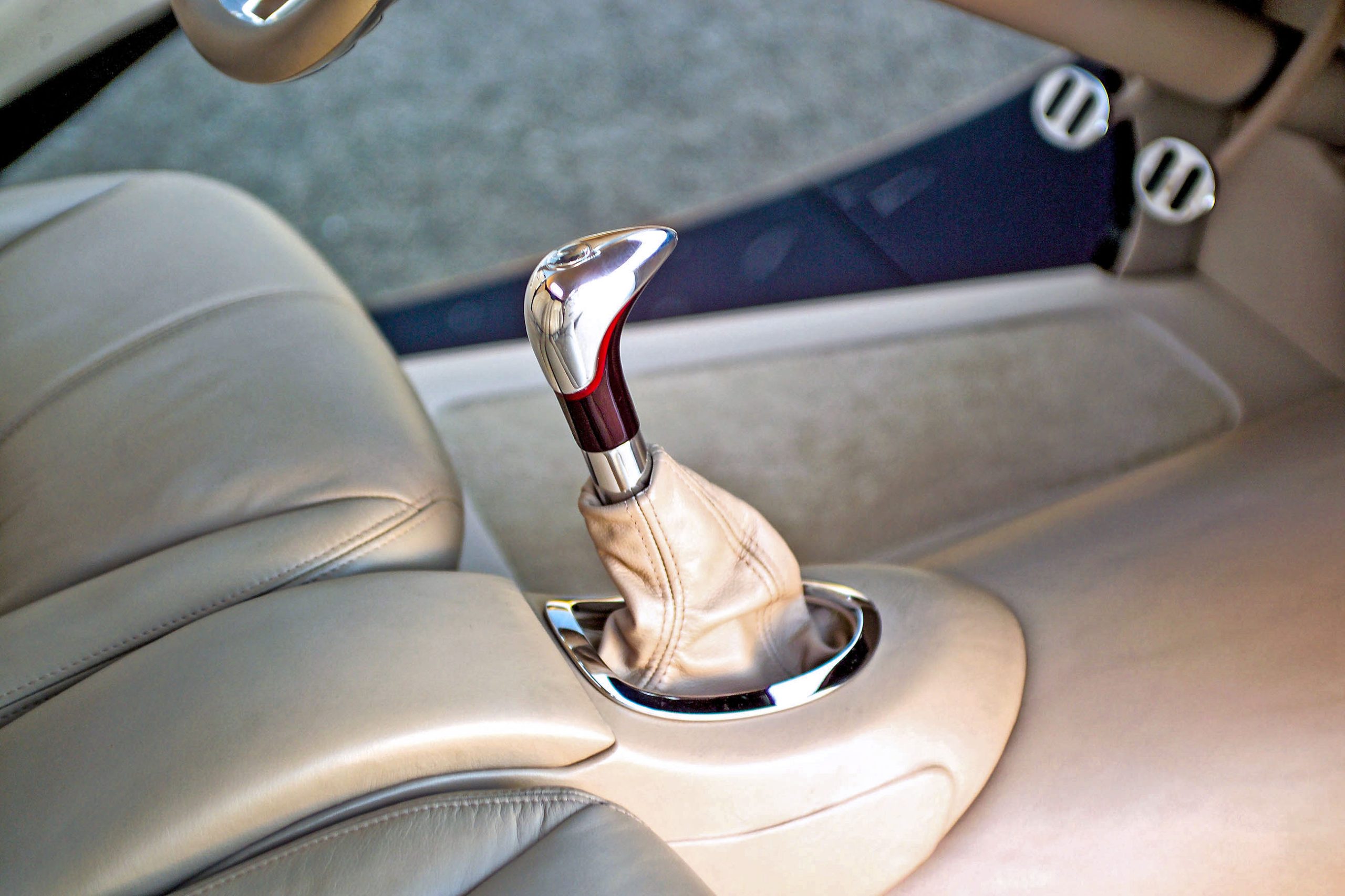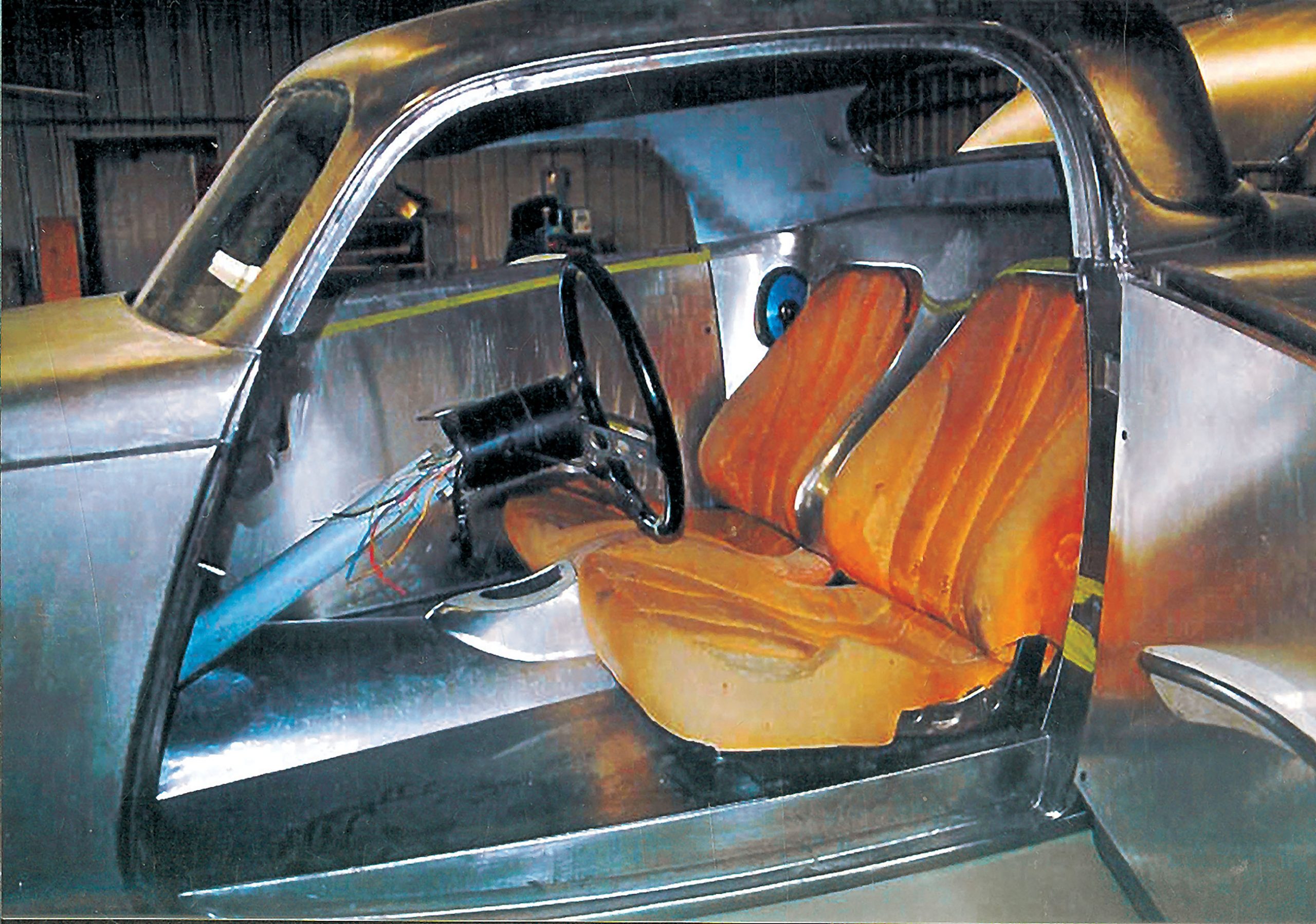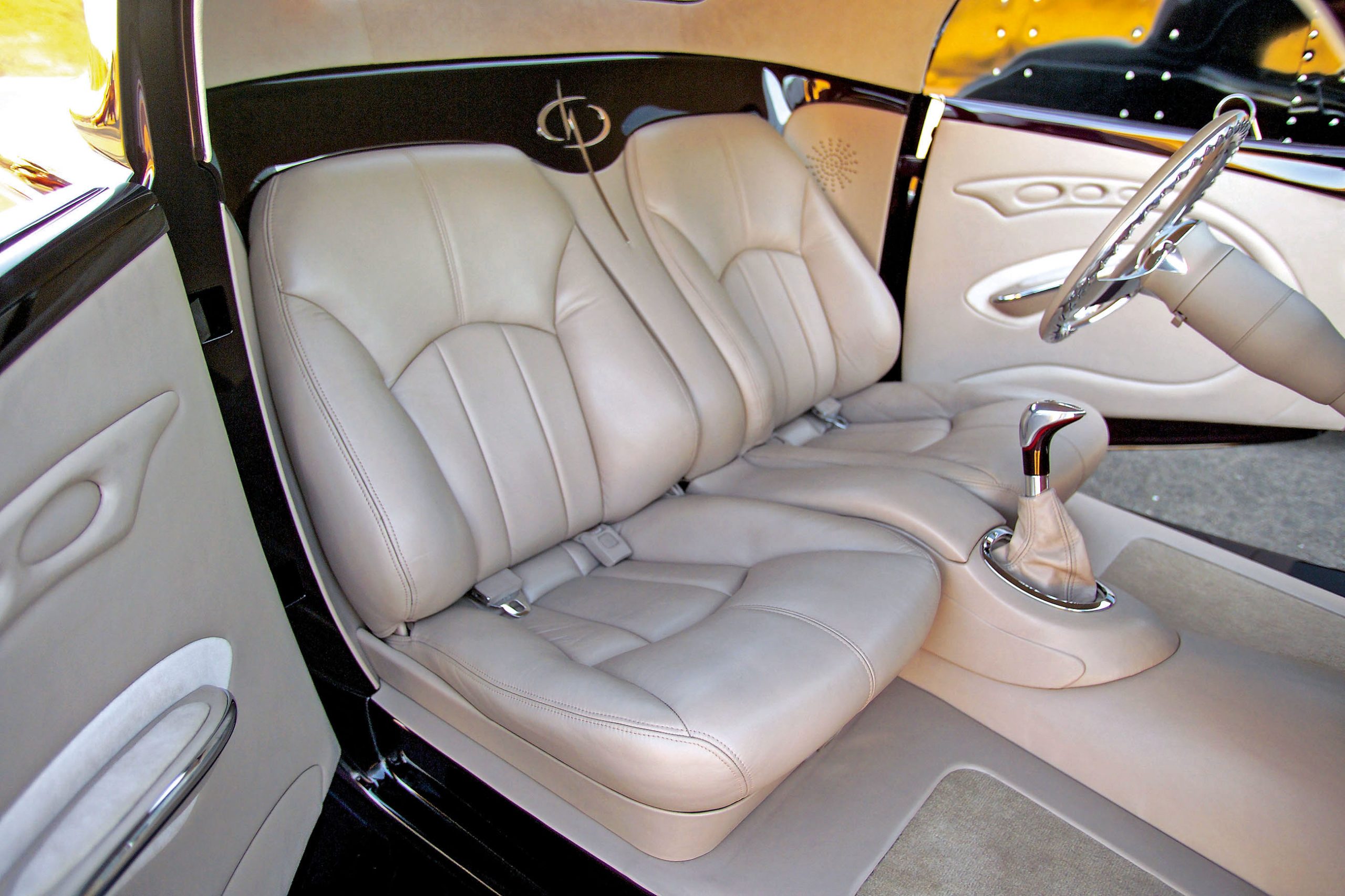 The same can be said of the interior, which was outfitted by Iowa City, Iowa’s McFall’s Auto Trim in beautifully contoured, burgundy-tinted beige leather that conceals still more of the same amazing metalwork. The aluminum details include the ’33-style dash with its specially designed gauge panel, the smoothed panels below, and the molding that leads into special door panels. Between the seats, a shapely console houses all the accessories and the cleverly designed billet shifter. Surrounding efforts make up the kick panels, trim pieces surrounding the seats, the door and windshield trim, and the laser-cut stainless steel Storm logos on the dash and between the seats. The unique, freestanding steering column has been fitted with a steering wheel designed to match the beautiful road wheels, and the turn signals and tilt mechanism have been combined into one control. Other controls for the windows, power trunk lift and rear license plate retractor are hidden away. Above, there’s a fiberglass panel that forms the headliner, and like every detail on this car, its suede-covered surface conforms precisely to its surroundings.