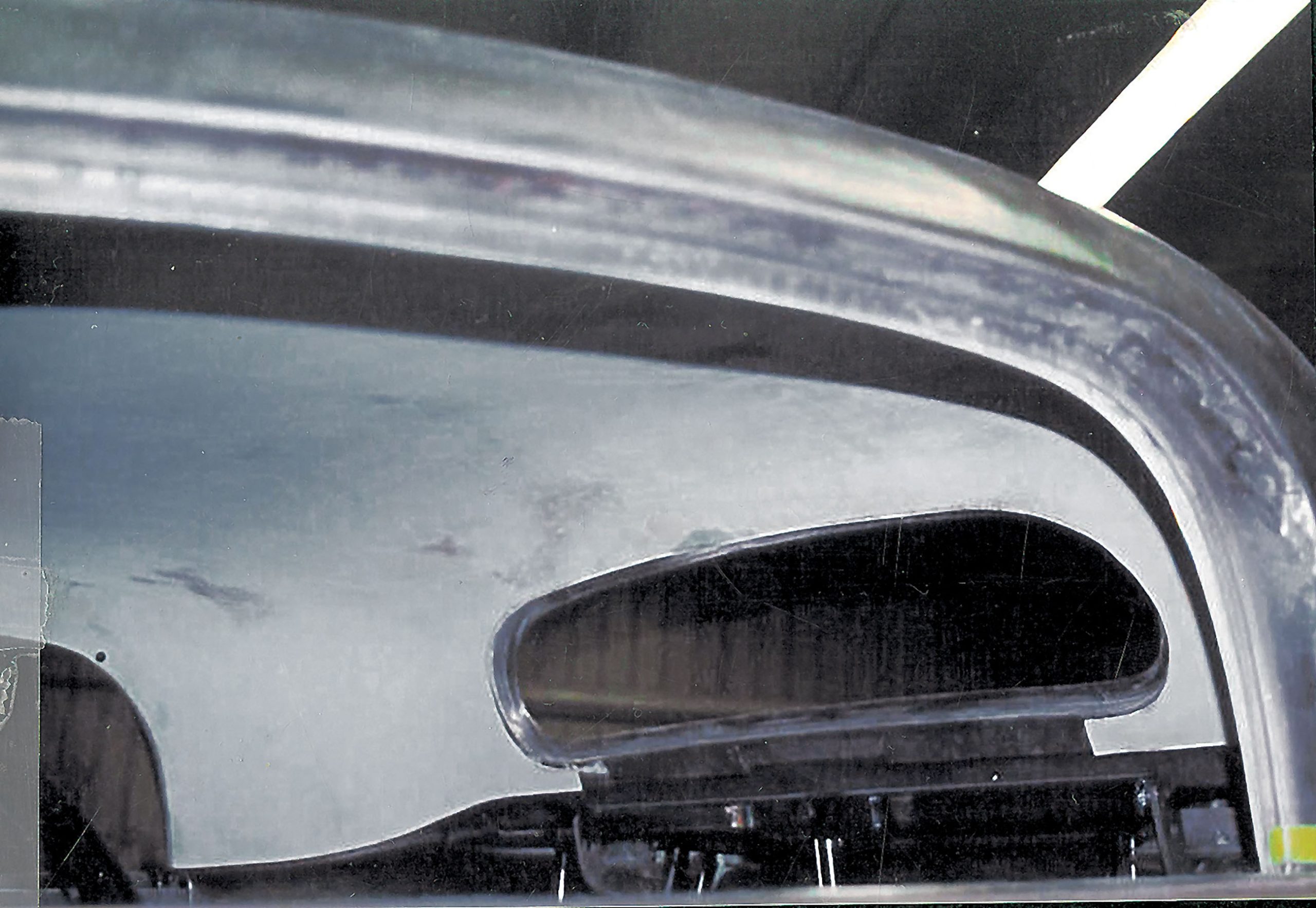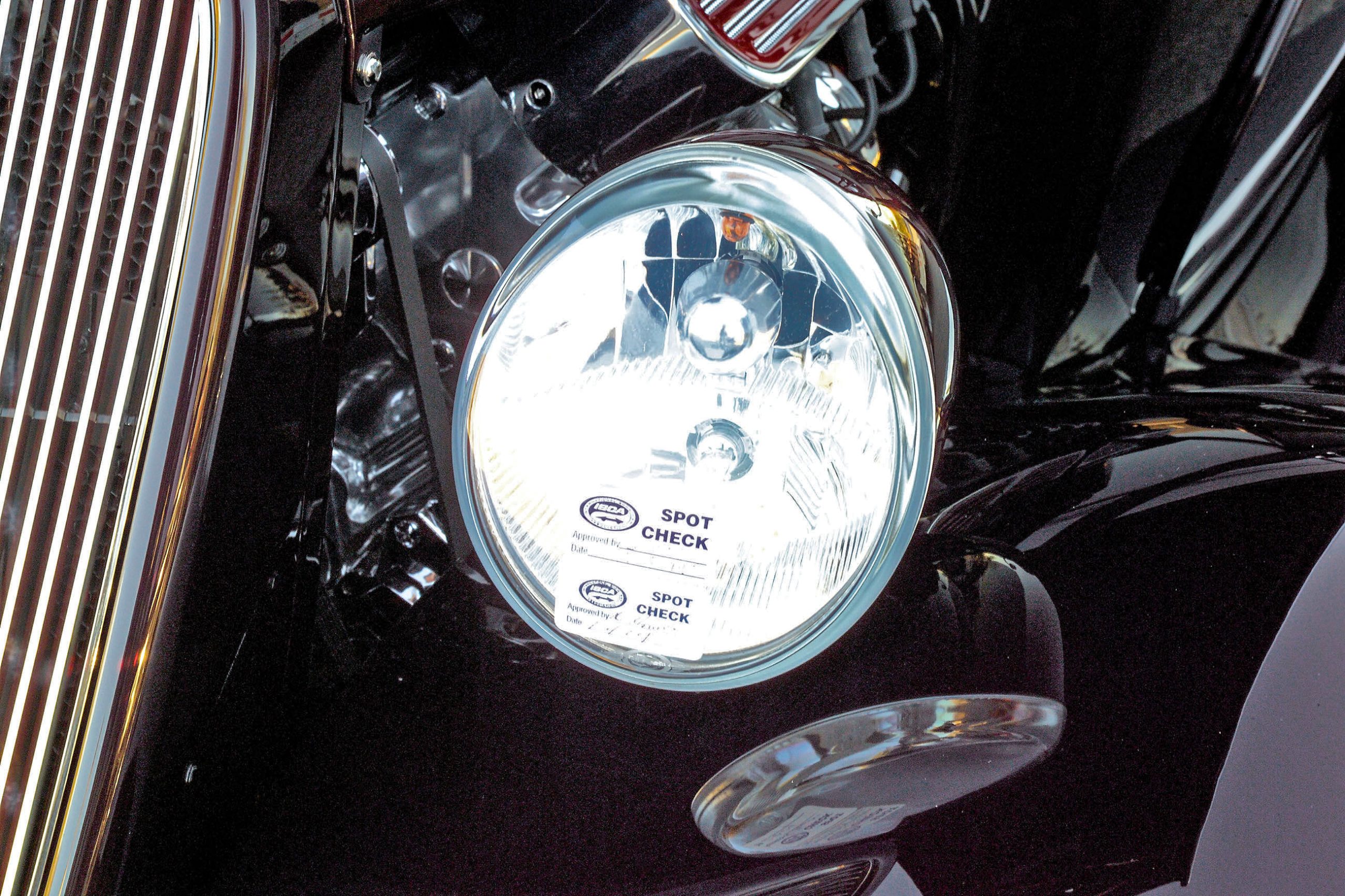 In shaping the doors, inner panels were created that match the doorjambs around a primary structure housing the power-window mechanism and horizontal intrusion beams. Once this was completed, the outer skins were rolled out and formed to match these contours. You’ll also notice that the window frames are now incorporated in the roof, and that more curved glass from Art Glass Studio in Edmonton, Alberta, was used here as well. To bring these changes together, the front quarter panels were moved back 2 inches and sectioned to suit the modified contours of the body. The reproduction front fenders were re-radiused around the wheel opening and lengthened for a smooth transition with the shortened running boards. The fenders were also widened 2 inches to meet the hood and butted together at the nose, replacing the original filler plate. The vented inner fender aprons covering the framerails are concealed, while the front edge of the fender has been raised 1-1/2 inches. A pair of Harley-Davidson V-Rod headlights was fitted within modified housings from Steve’s Auto Restorations in Portland, Oregon.