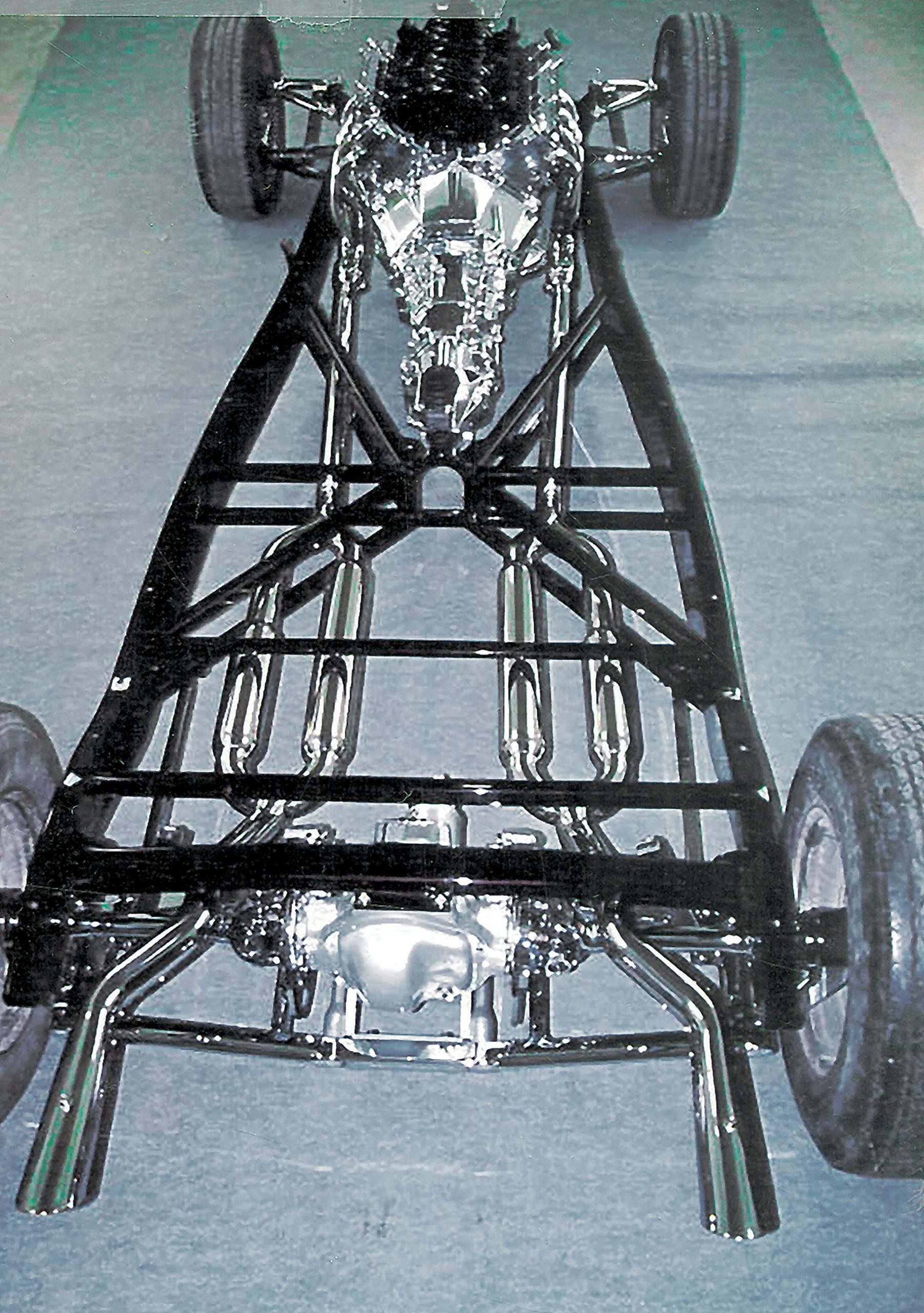 To bring it all into perspective, you have to realize that 95 percent of this car was scratch-built, which is a testament to the commitment it takes to reach this level of quality. To start, the chassis is amazing, incorporating many special approaches that begin with its overall taper from front to back. Heavily pinched from the midsection, the boxed ’33 Ford rails are joined with tubular crossmembers, forming a ladder X-member centering on the driveshaft hoop. This creates an extremely stiff foundation, ensuring that torsional flex is held to a minimum to maintain optimum suspension geometry, while greatly lowering the stresses applied to the body and fenders over uneven surfaces.