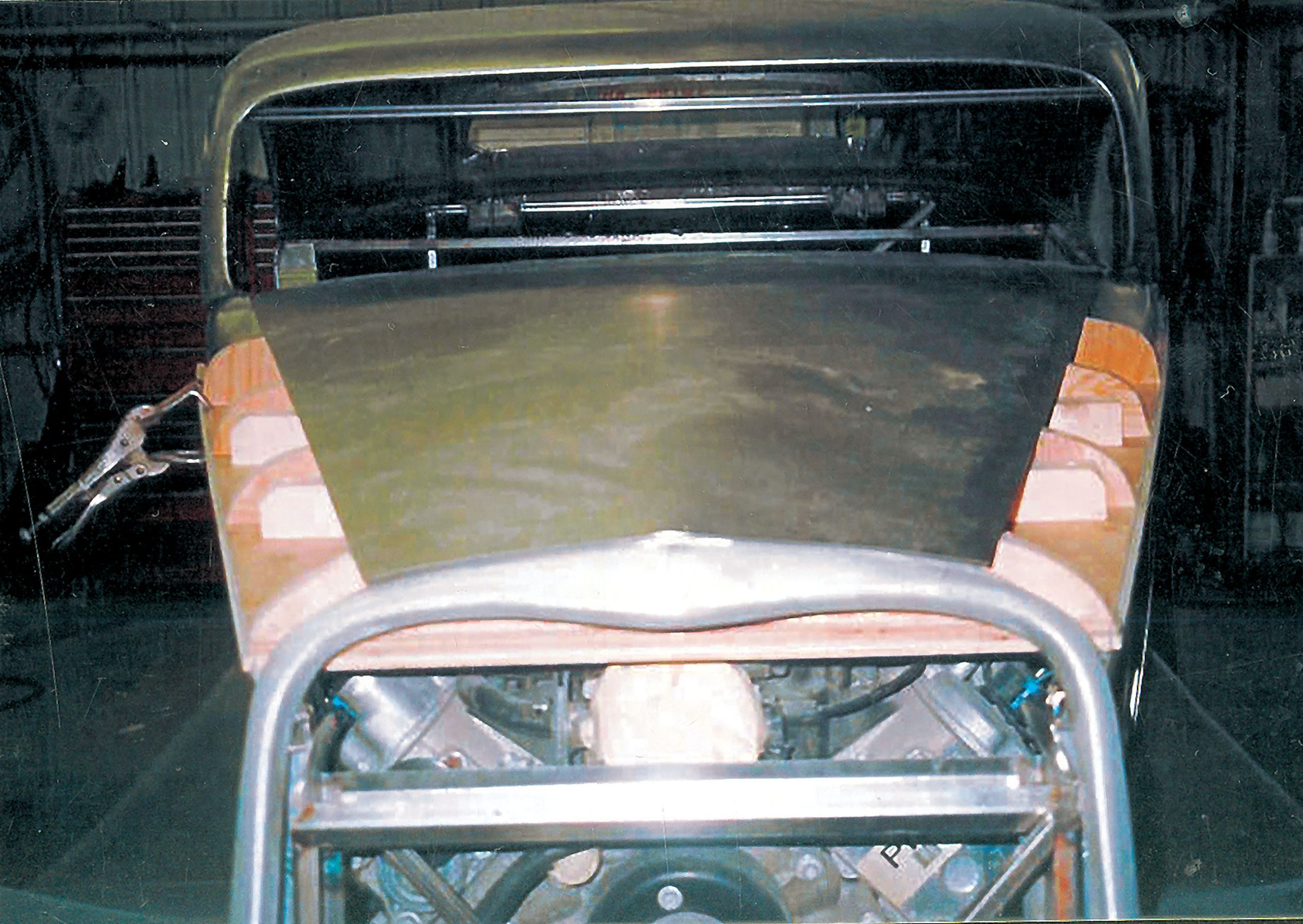 With the foundation for this car in place, it was time to shape the body, which began with the creation of the full-length floor pan. With this completed, a stock ’33 Ford body was cut apart and for the most part re-created using flat 18-gauge sheetmetal formed into the specific shapes needed to refine the overall contour. First, the firewall was formed, along with the front portions of the body and the lower windshield support. The cowl was done away with in favor of a full-length hood that extends from the complex grille shell to the base of the curved windshield frame and doors. The roof was lowered 5 inches and the rear portion of the door opening was moved back 2 inches, while the rear window was moved up and fitted with flush-mounted curved glass to replace the original reveals for a more modern look.