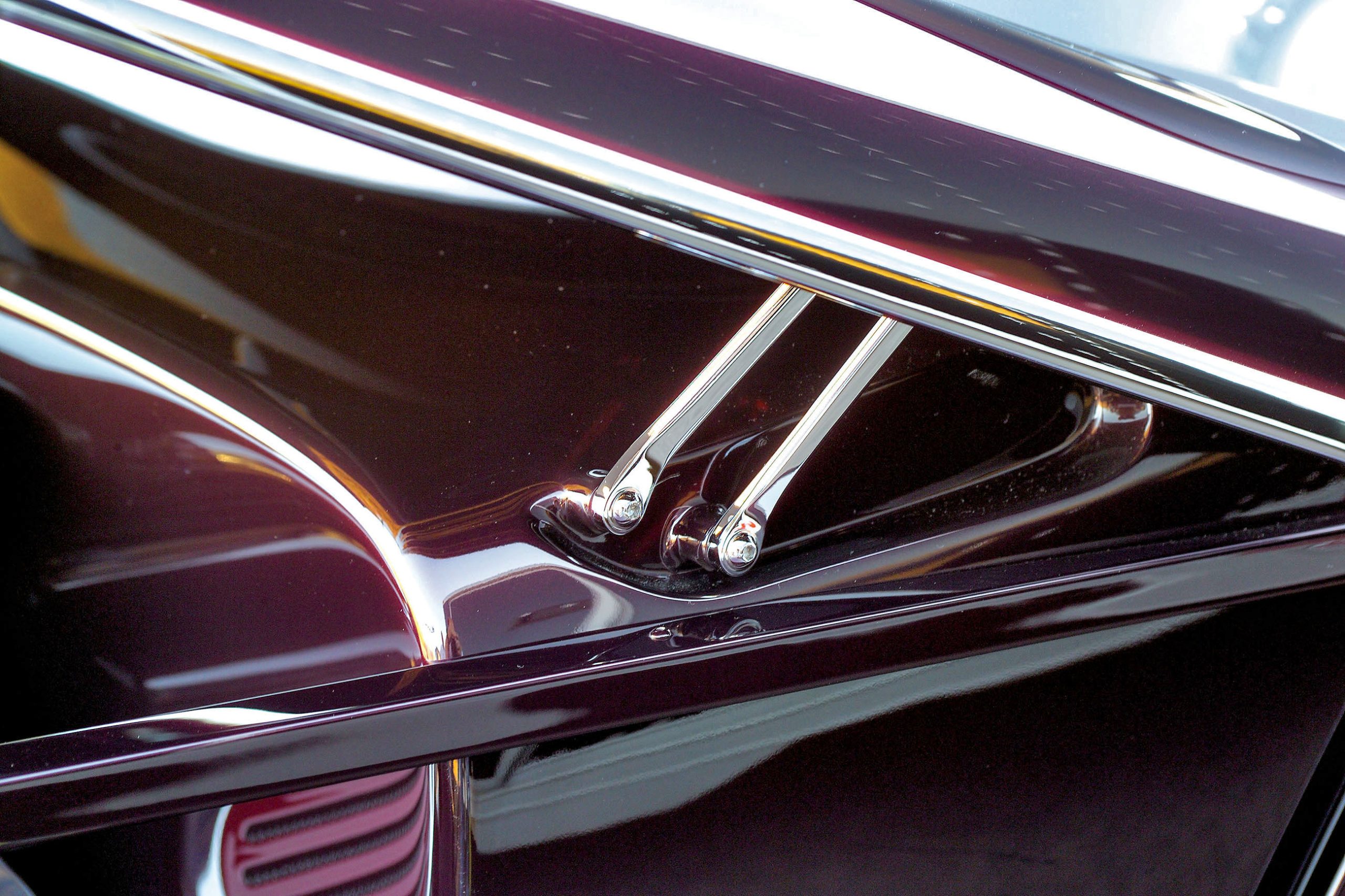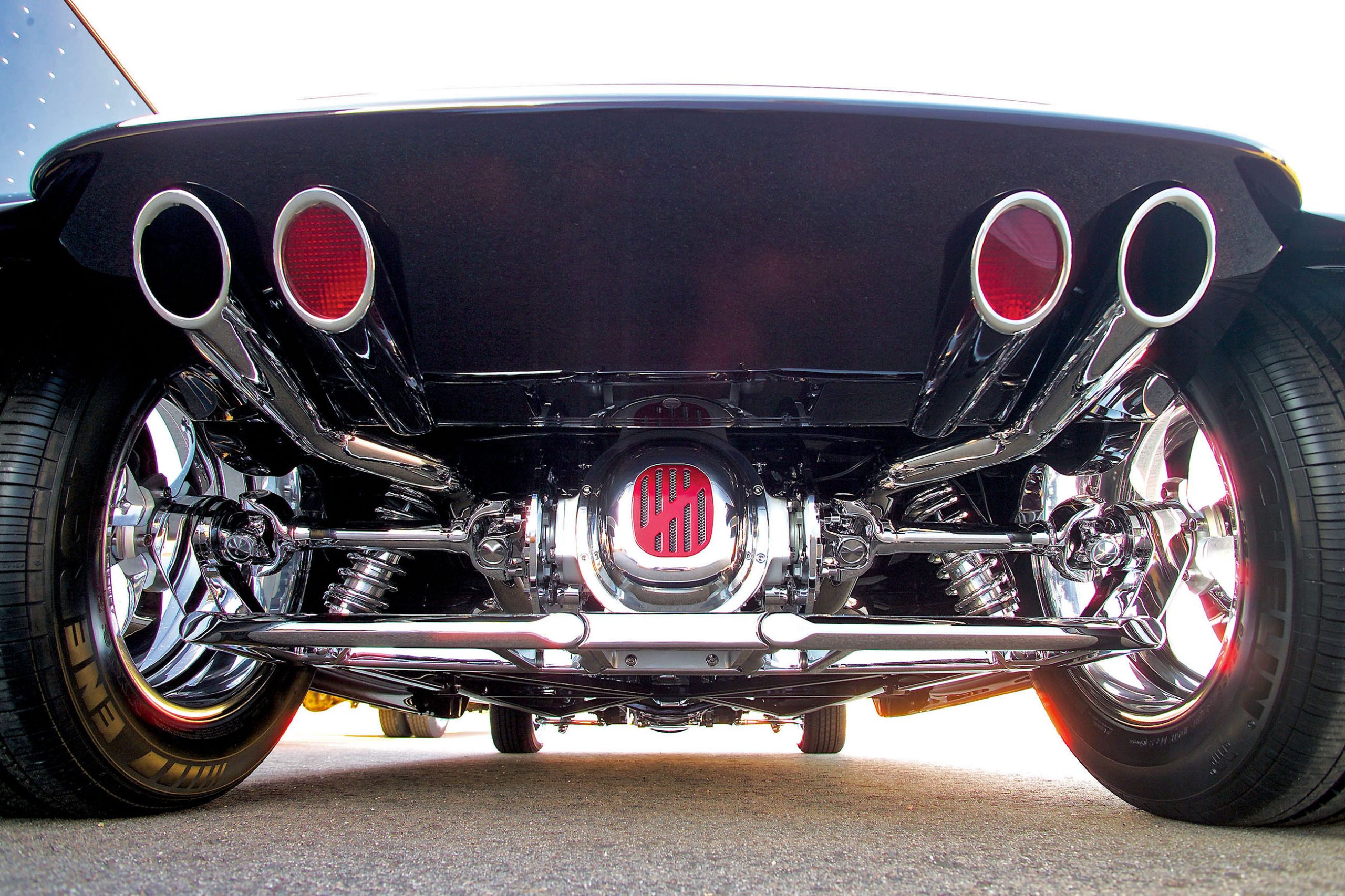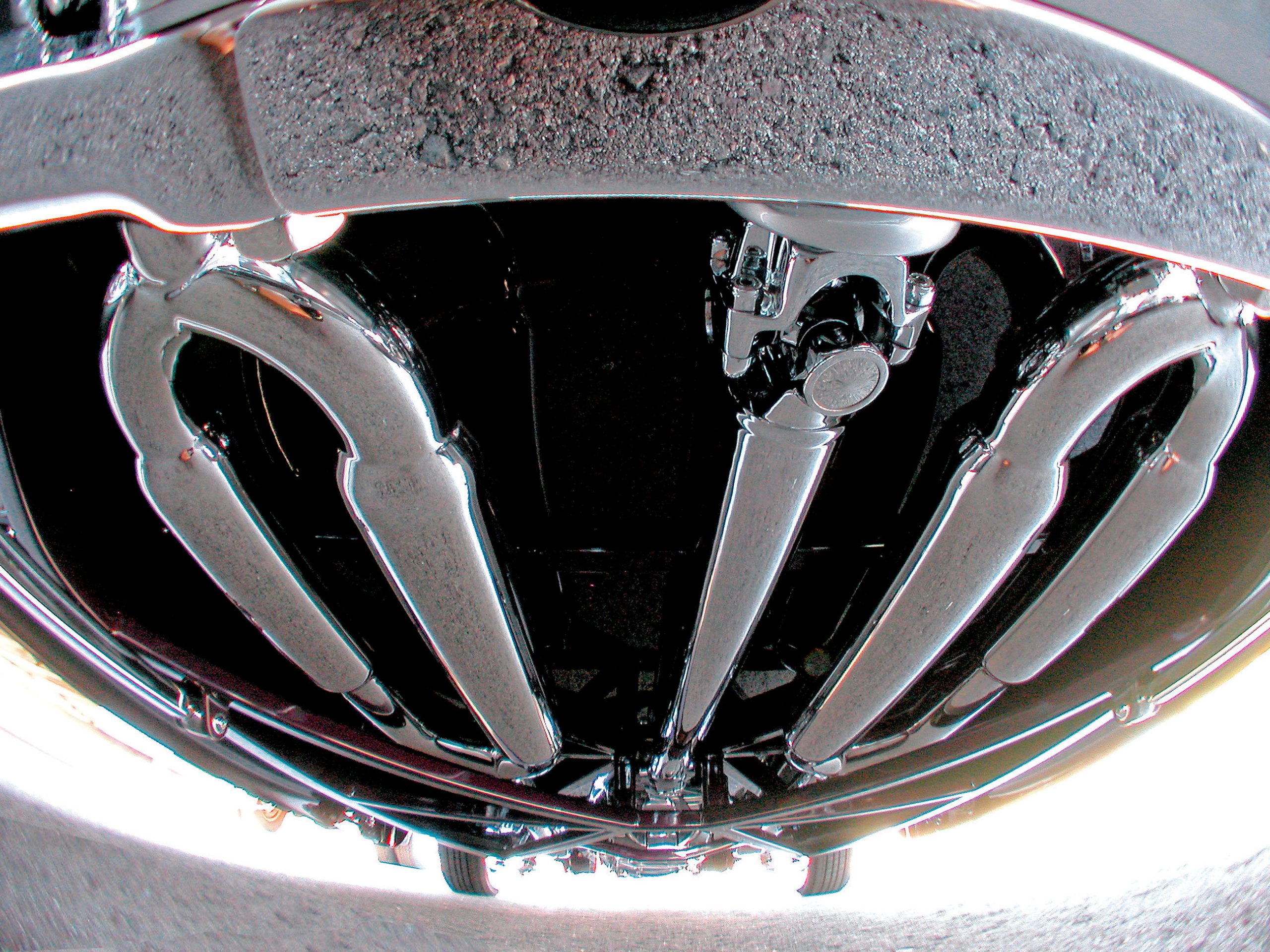At the front, the frame horns have been removed ahead of the crossmember, which acts as the mount for the independent front suspension. It’s here that specially shaped aero-tube control arms have been fitted with chromed billet-aluminum spindles and hubs. These feature scalloped edges to match the brake rotor and wheel openings. Other details remain unseen, including the chromed and recessed hub seals and the lower shock mounts that are blind-tapped into the control arms, doing away with mounting nuts that are usually visible through the top of the control arms. The lower shock pivot bolt has also been blind-tapped into the back of the bracket using a flush-mounted Allen-head bolt. The upper shock mount sleeve is tapped with a button-head at each end, doing away with the typical fasteners. Furthermore, the ball joints and tie-rod studs have been trimmed to fit flush with the nuts attaching them, and the ball-joint caps were specially machined without the center bolts normally used to keep them in place.