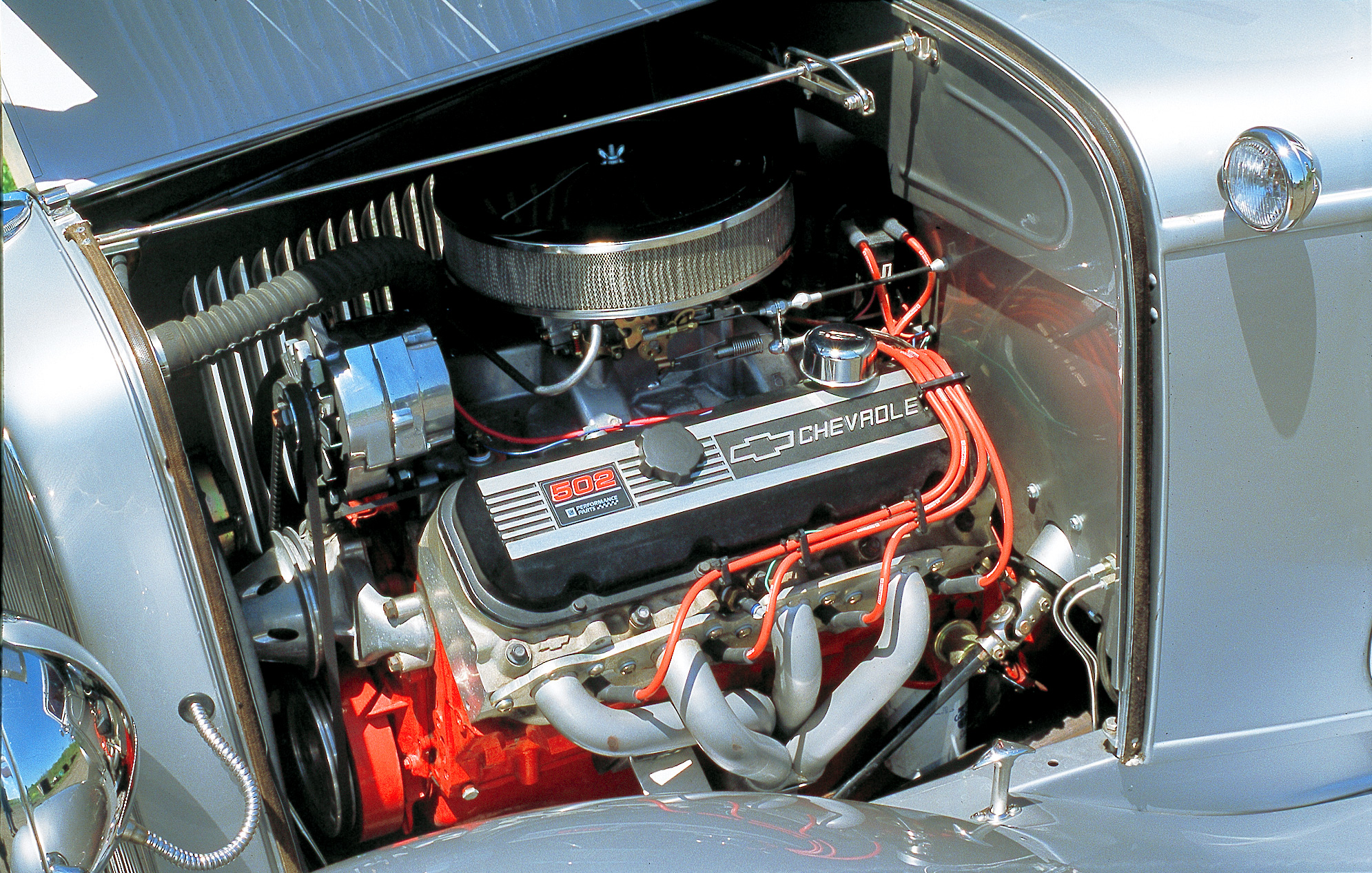 While the chassis was in progress, Robertson ordered a Street & Performance ported and polished 502 Chevy. A Holley 650 carburetor was chosen for the polished GM high-rise intake manifold, along with chrome and billet dressup parts. Robertson and friend Marvin Secord then began polishing everything on the engine, while Birosh fashioned a stainless exhaust system. Secord rebuilt a Turbo 400 trans for the coupe.