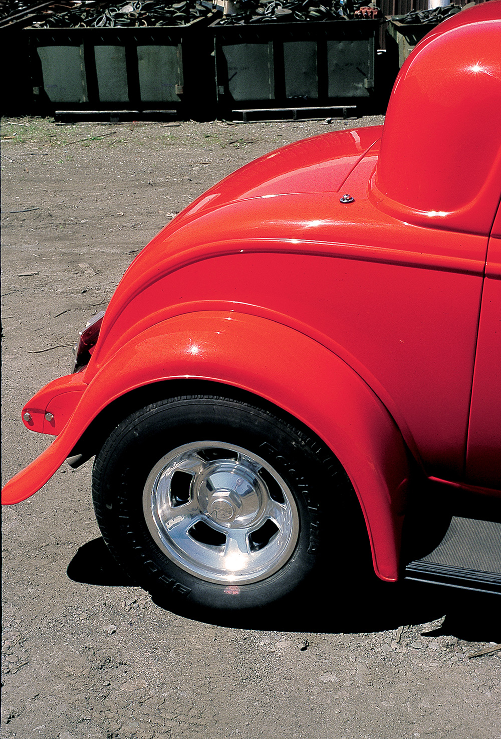 Halibrand aluminum wheels were wrapped with BFGoodrich rubber, and they blend nicely with the silver exterior. Halogen bulbs were placed in the headlights, along with the turn signals. The coupe was then sent to Scott Bailey in Waverly, New York, for painting. With a straight body to work with, the prep still involved many long hours for the silver finish. Next the coupe went to Flyboyz Street Rod Designs in Horseheads, New York, where owner Brian Schuler began sewing the red leather to cover the Glide seat and the door panels. To go with the new interior, red wool carpeting was selected.
