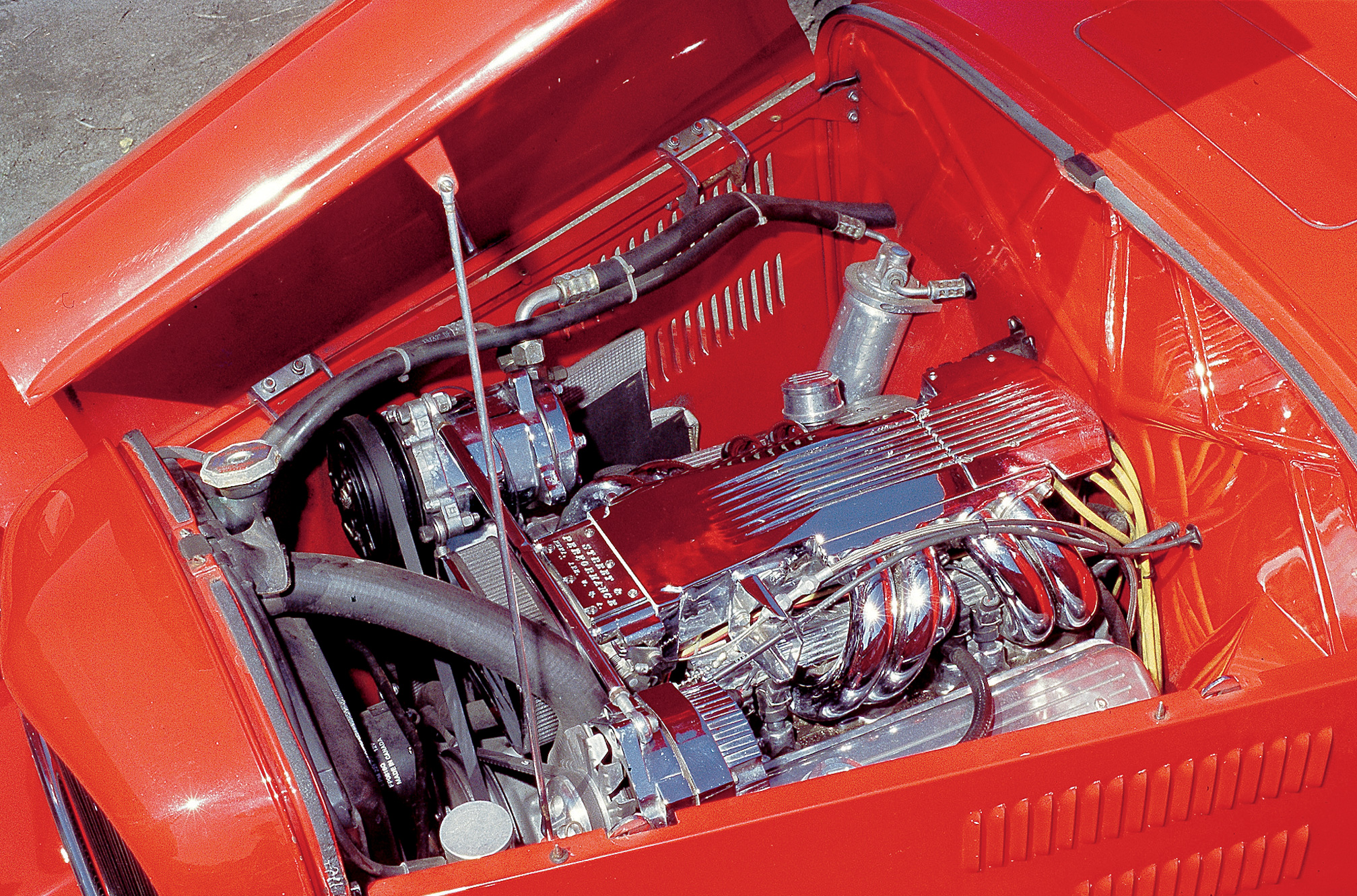 After some lengthy discussion with Birosh, Robertson decided on a ’67 Corvette IRS. The system was modified to include Volvo inboard brakes, and Carrera shocks cushion the ride. Birosh made the driveshaft connecting the Turbo 400 transmission with a Gear Vendor overdrive to the ’98 Chevy 350 TPI. Robertson again called on Street & Performance for his small block. The engine’s exterior surfaces were ground and smoothed, and a liberal dose of engine dressup goodies provides sparkle beneath the three-piece hood, which sports a couple of rows of louvers along the sides. Birosh made the stainless exhaust system for this coupe as well.