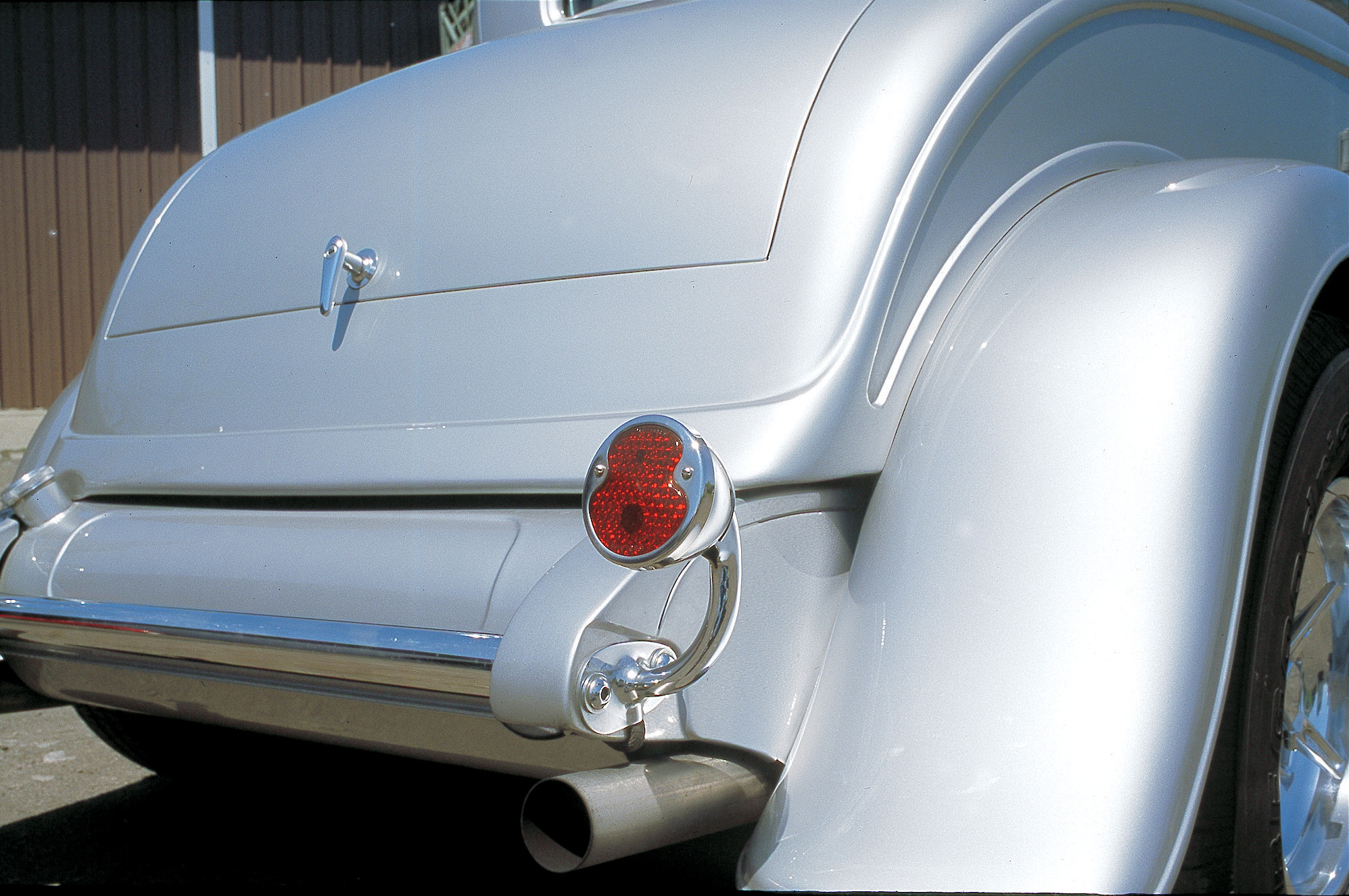 Turning to the exterior after the chop, Robertson selected King Bee headlights with a pair of motorcycle turn signals for front lighting. In the rear, Chevelle side-marker lights were converted to taillights. Like the silver coupe, this ’32 rides on Halibrands and BFGoodrich tires.