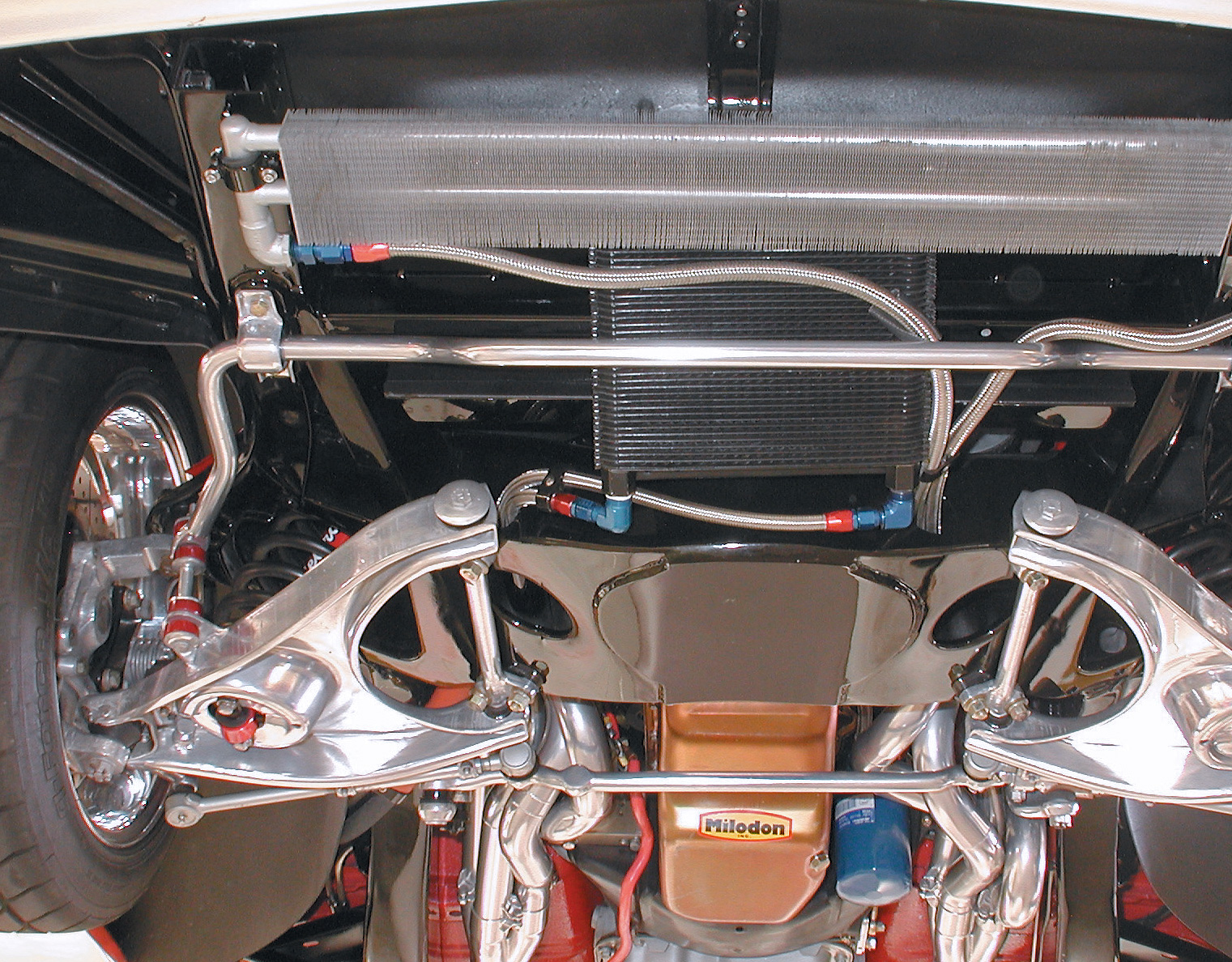 Further improvements can be found in the leather-covered Tea’s Design seats and armrests, as well as in the door panels and headliner, which were shaped in supple leather by Dick Gerwer. Billet Specialties window cranks and door handles add to the detail, while windows from Specialty Power Windows bring a modern touch to the ride. Finally, a heavy-duty audio system, incorporating Kicker speakers, was hidden away until the time comes to rock this ride.