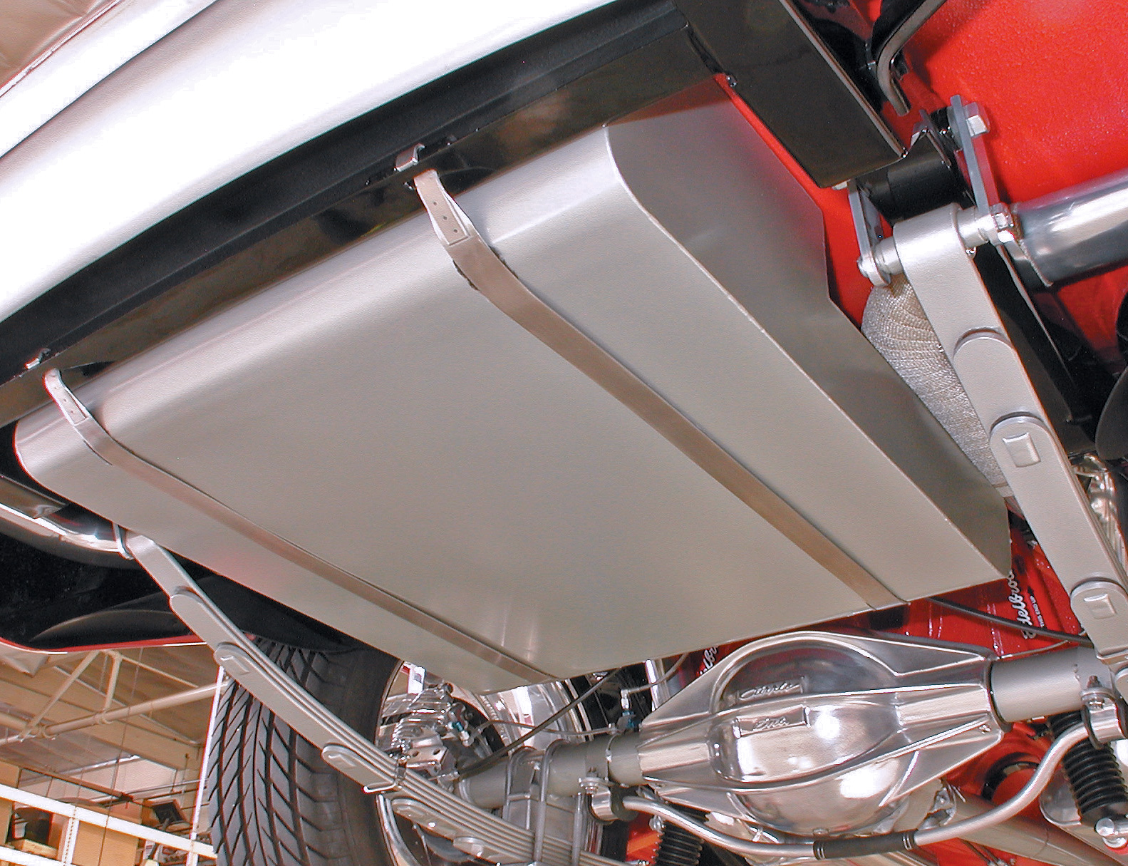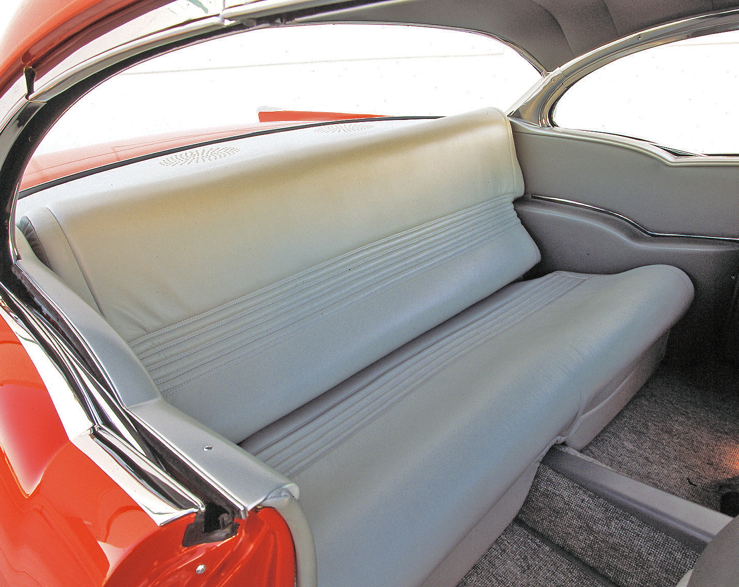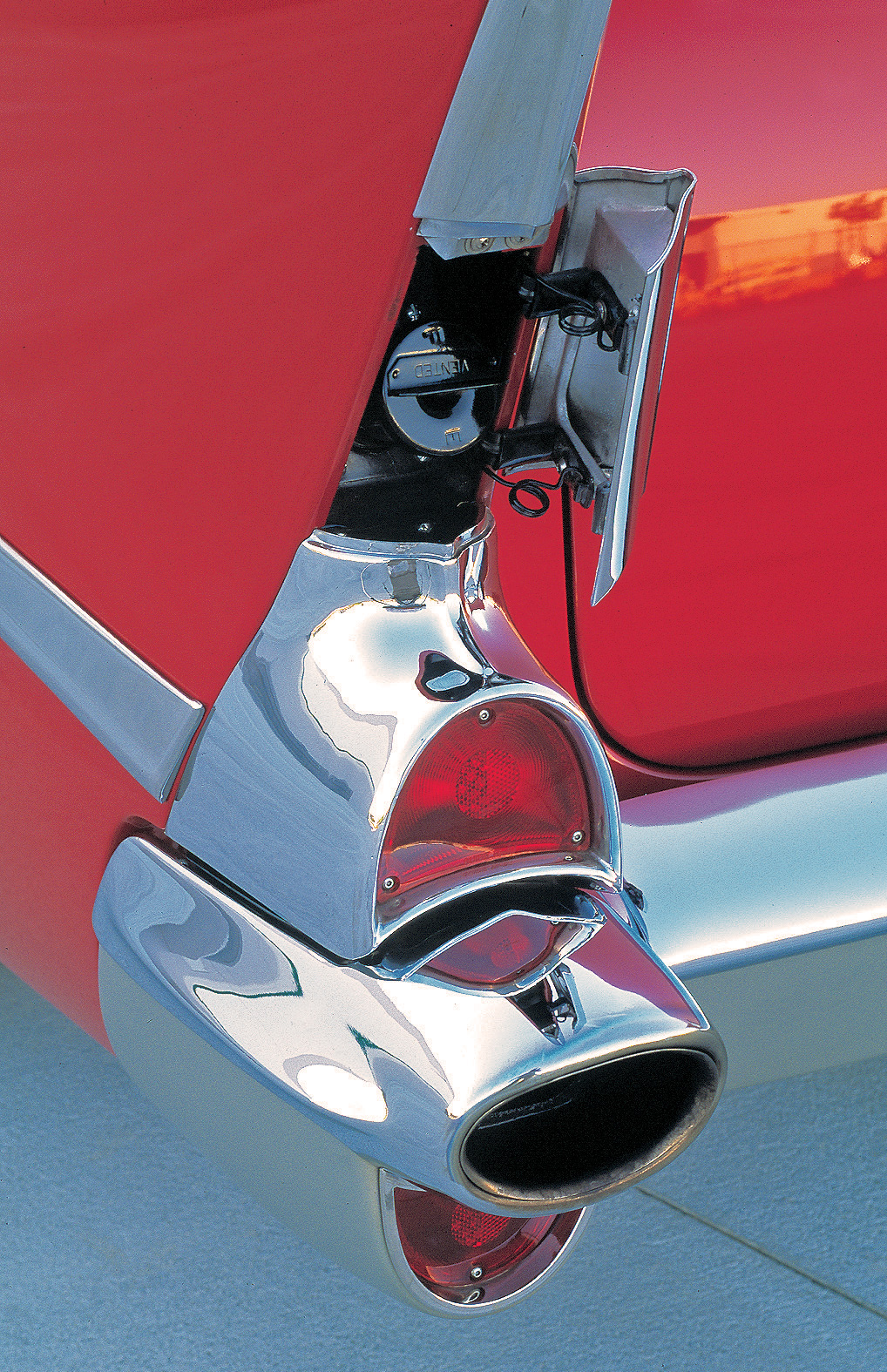 Similar modifications were made in back, where the rear bumper was also heavily, yet subtly, modified. It, too, was cut, narrowed and modified to improve its contours. The “fake” exhaust ovals on either side now sport 3-inch exhaust pipes, something you could never order as an original option. The same goes for the lower taillights that have replaced the original trim pieces, improving the function and the appeal of the car. Reviewing the rest of the body will no doubt turn up other changes, including the reworked, hand-built side molding that is a mere sliver of its previous proportions. In fact, had the car’s original designers gone a different direction, this certainly could have been one of their options, as it really brings a new look to the overall package. So it is with the molding cresting the rear fins, which have been shortened from 36 inches to just 8 inches in length. Even the stock squared-off rocker panels have been cleaned up with rounded versions, and while a 1-inch lip was added along the bottom, the rockers actually appear to be thinner than before. Once a fine layer of PPG “Edelbrock Red” paint was applied, these changes were joined in one flawless machine.