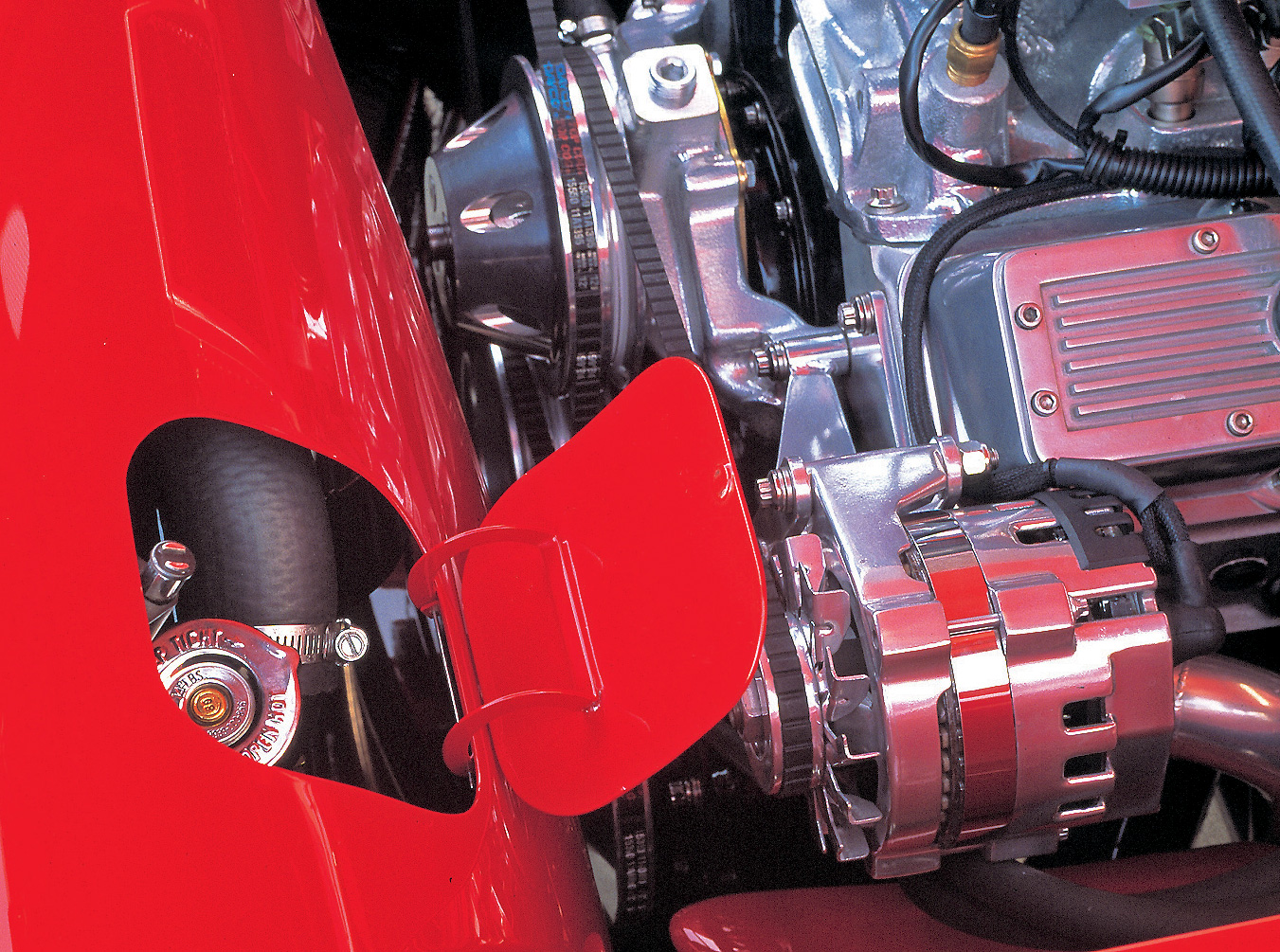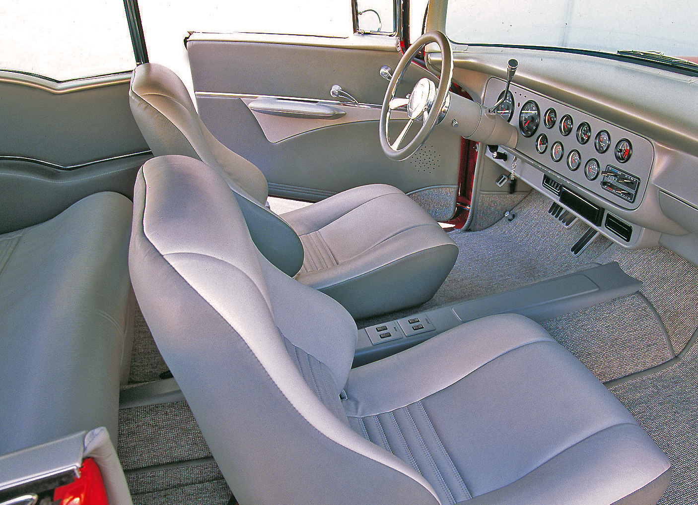 Although the Edelbrocks’ expectations for the car were fairly straightforward, they did have a few specific requests that were seamlessly integrated into the package as only Posies can do. This included the “Edelbrock Red” paint job with some subtle ghost flames (Nancy’s idea), lots of gauges and a chopped top, although there are so many other small changes that it’s actually difficult to realize all that’s gone into this truly unique Chevy. The bodylines certainly have stayed true to the original, yet a number of special details have brought a refined look to the car, putting a new spin on its classic appeal. It’s the things you can’t quite make out that really set it apart.