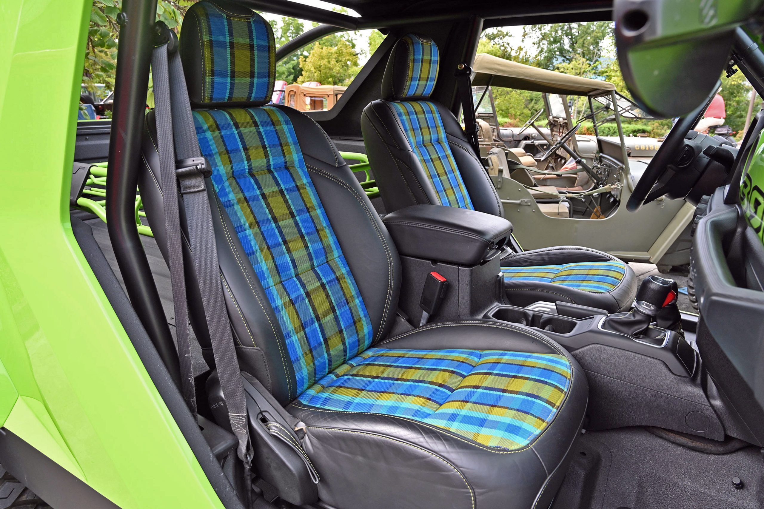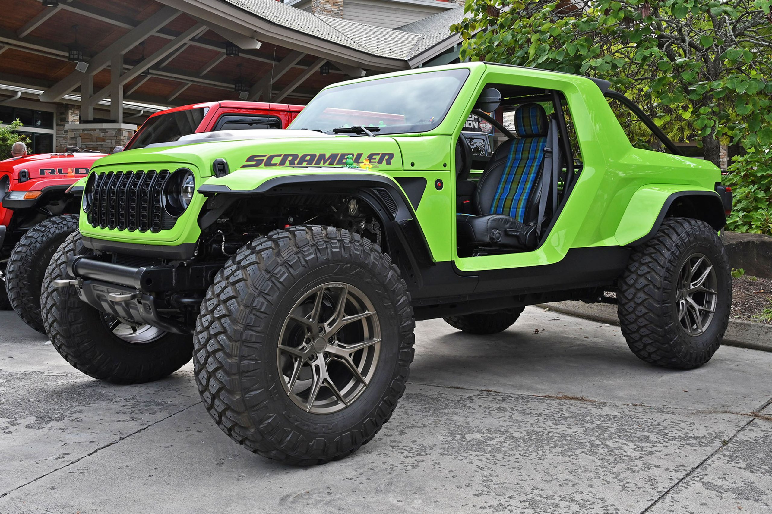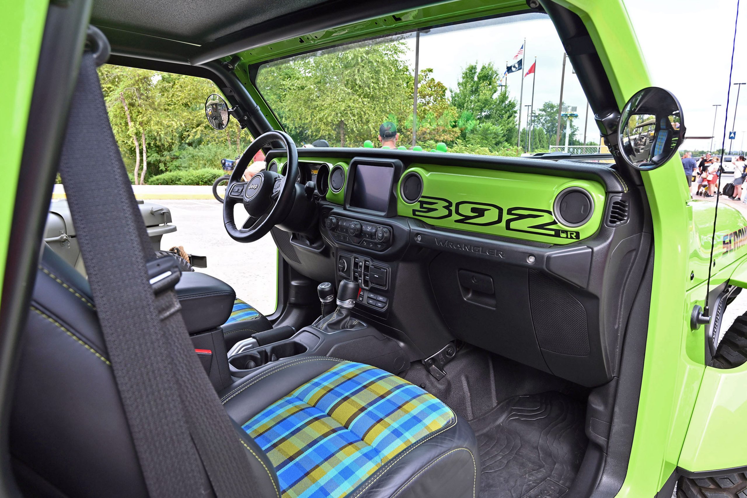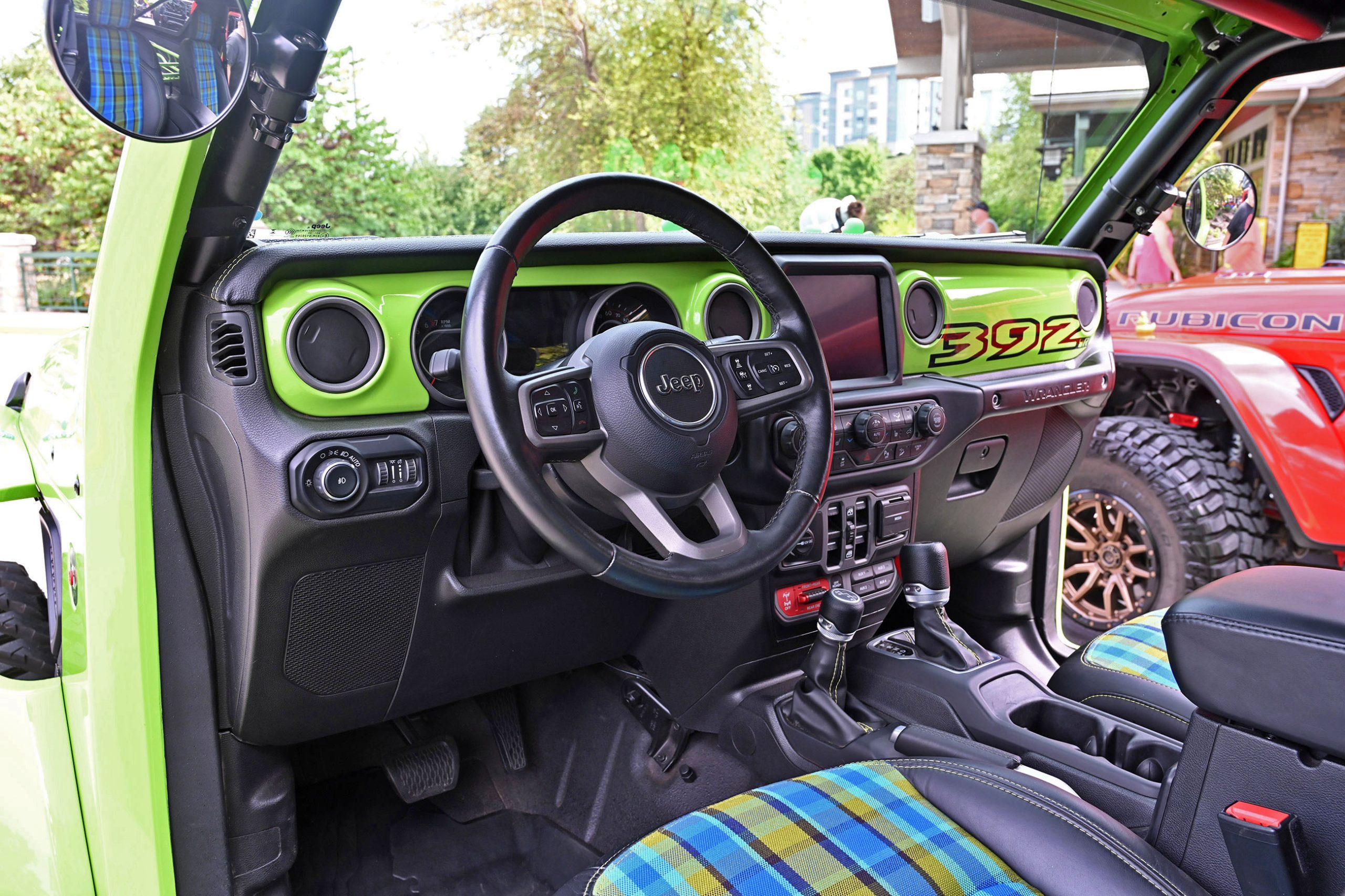 Inside, it’s just as bold. Dark leather, lime-green stitching, and plaid seat inserts echo the exterior’s punch, while a giant “392” across the dash reminds you this isn’t your average Wrangler. Add in an AccuAir adjustable suspension that lets it hunker down or lift sky-high on command, and you’ve got a one-off Jeep that’s pure fantasy garage material. We spotted it, we fell in love — and like you, we wish Jeep would just build the thing already.