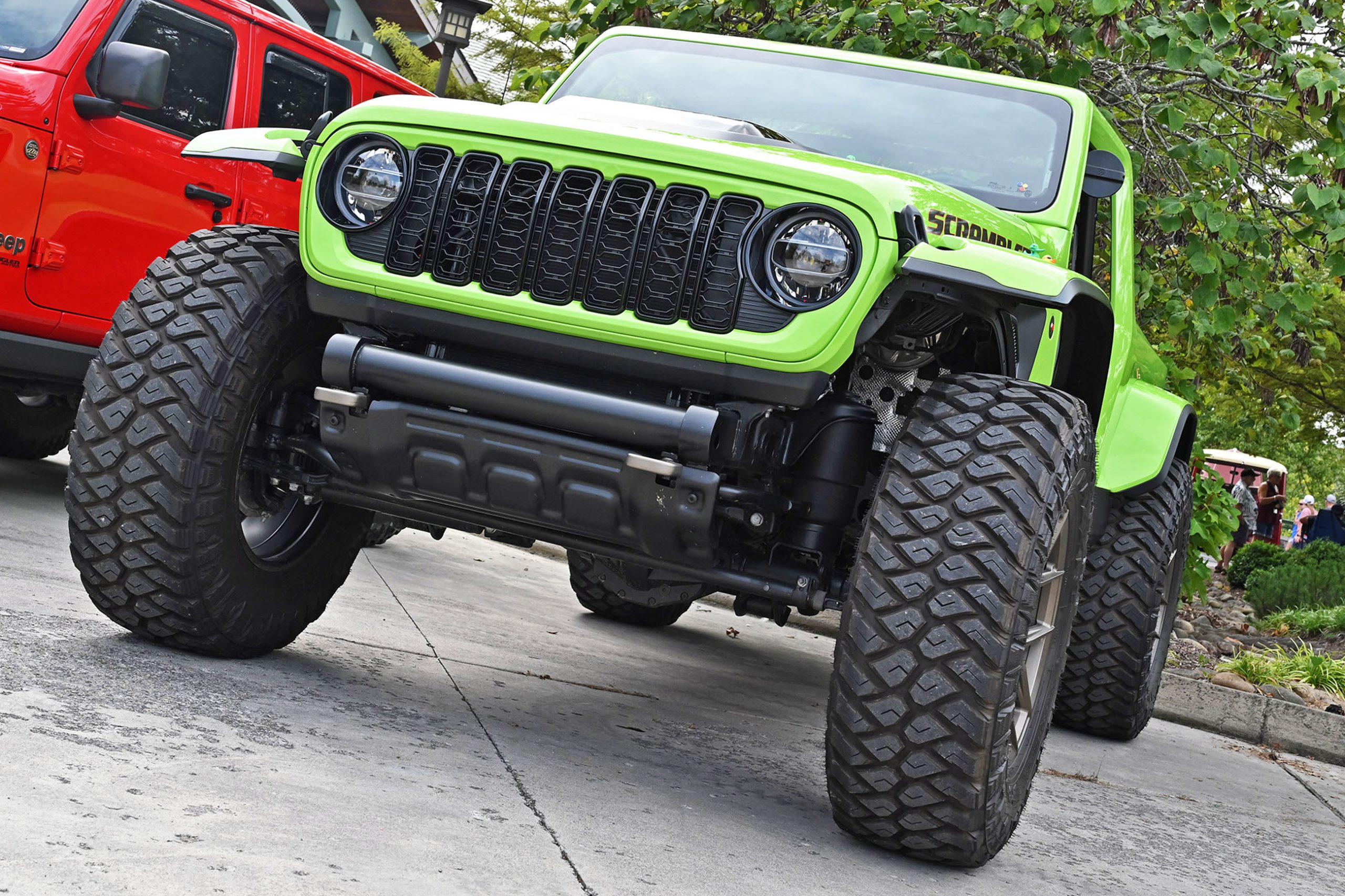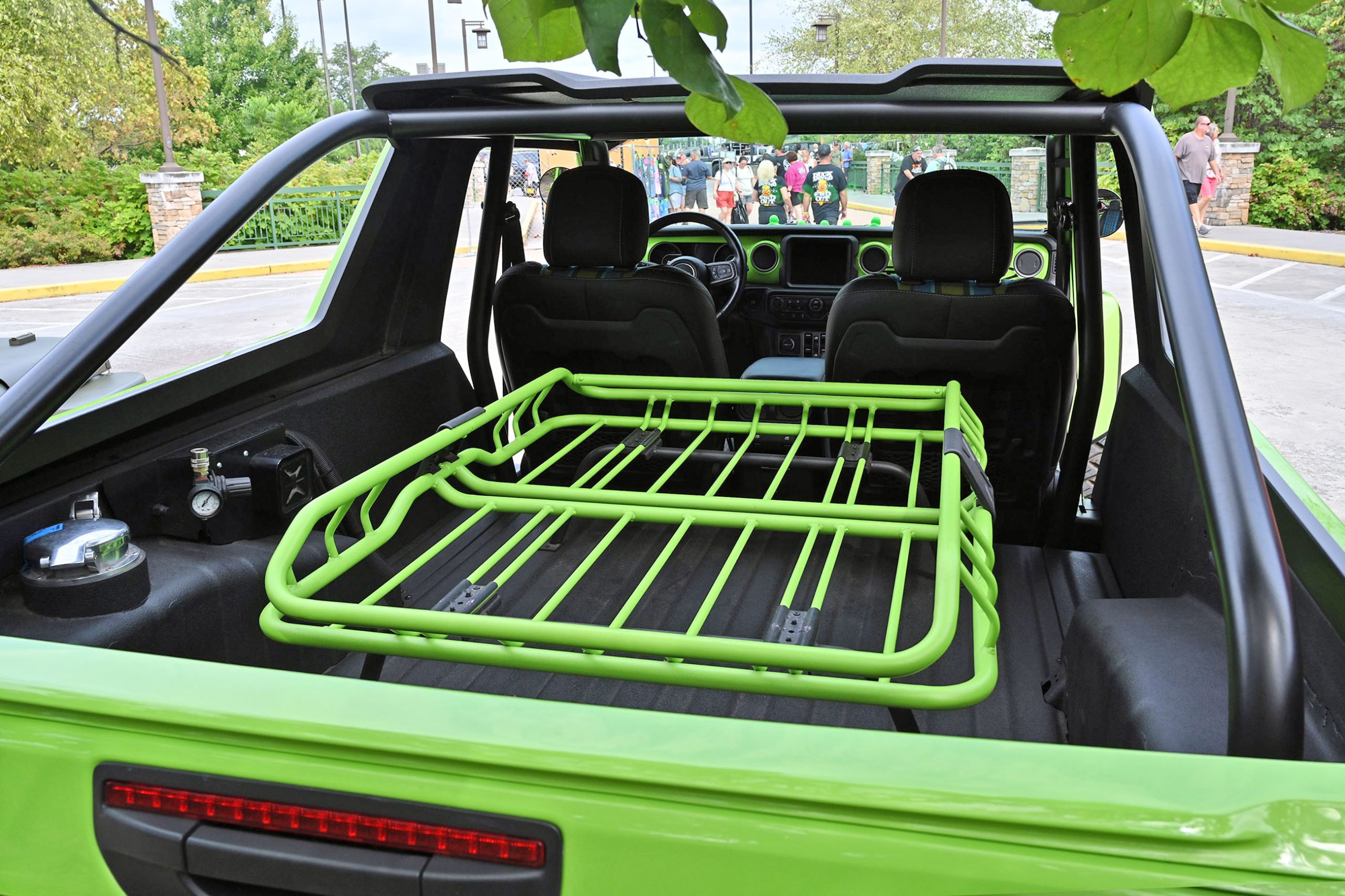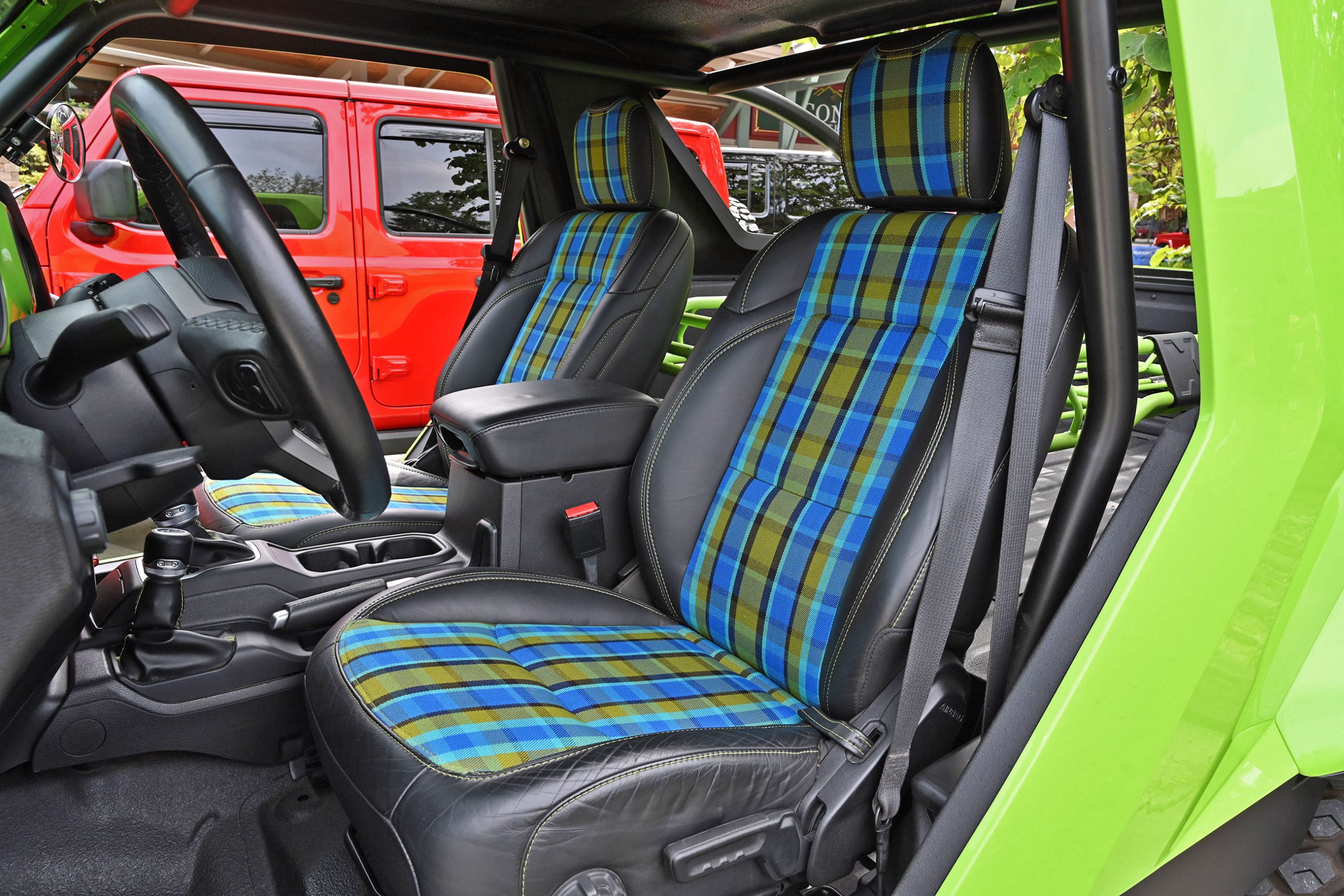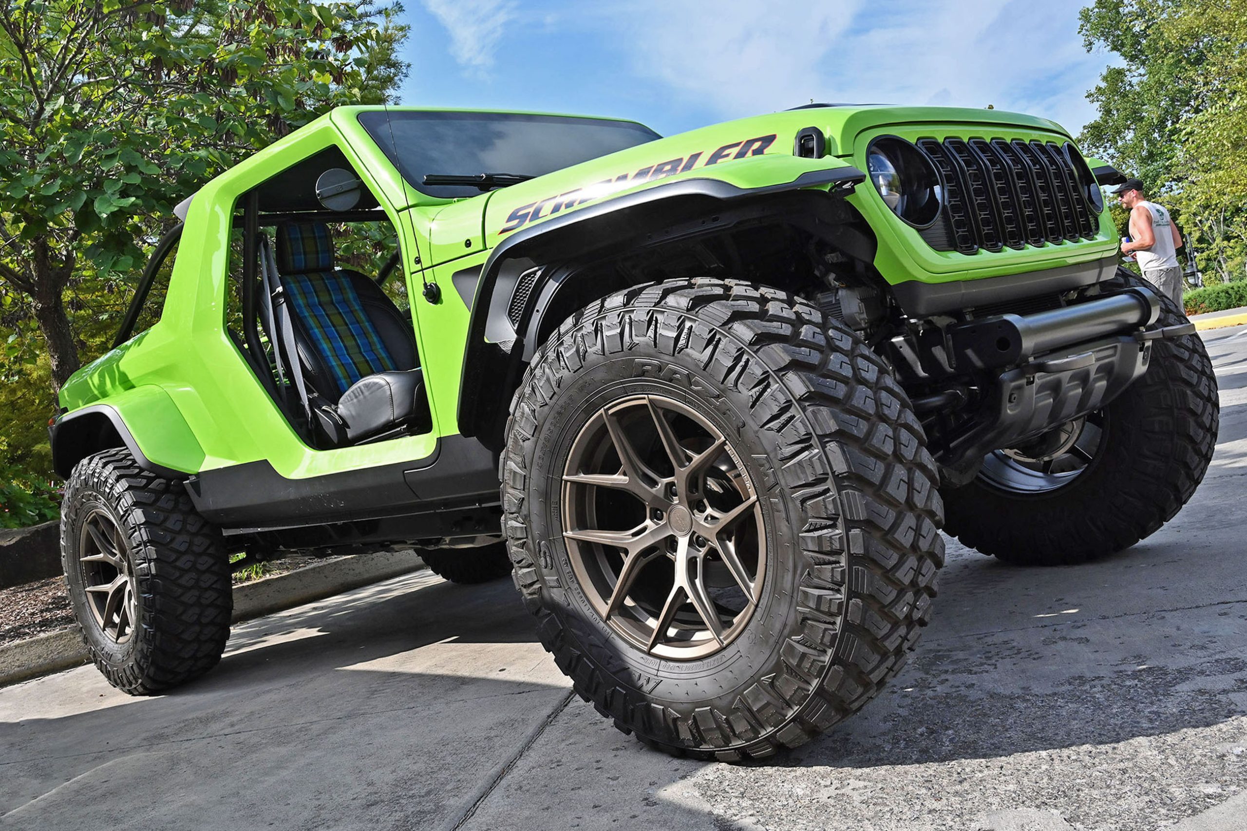Inside, it’s just as bold. Dark leather, lime-green stitching, and plaid seat inserts echo the exterior’s punch, while a giant “392” across the dash reminds you this isn’t your average Wrangler. Add in an AccuAir adjustable suspension that lets it hunker down or lift sky-high on command, and you’ve got a one-off Jeep that’s pure fantasy garage material. We spotted it, we fell in love — and like you, we wish Jeep would just build the thing already.