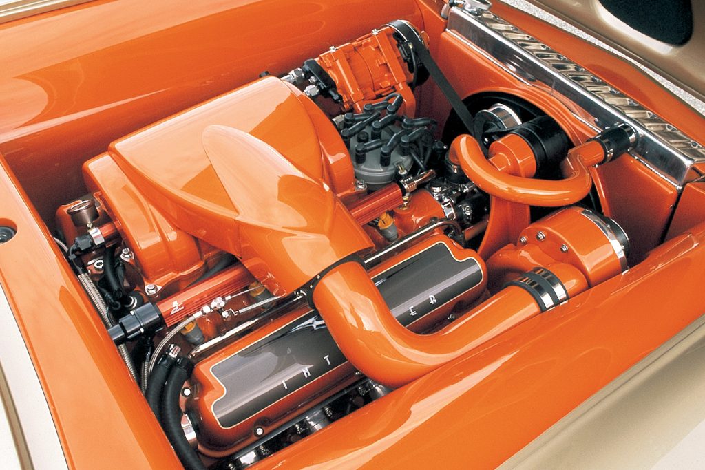 Another interesting aspect of the engine is the air intake system. Airflow begins at the custom airdam in the lower middle of the front bumper before flowing up the left side of the radiator core support that houses the air filter. (This support cradles a Griffin aluminum radiator assisted by Vintage Air’s thermostatically controlled electric fans.) Finally, the air continues across to the mass airflow sensor positioned near the right side of the inner fender, adjacent to the supercharger.
