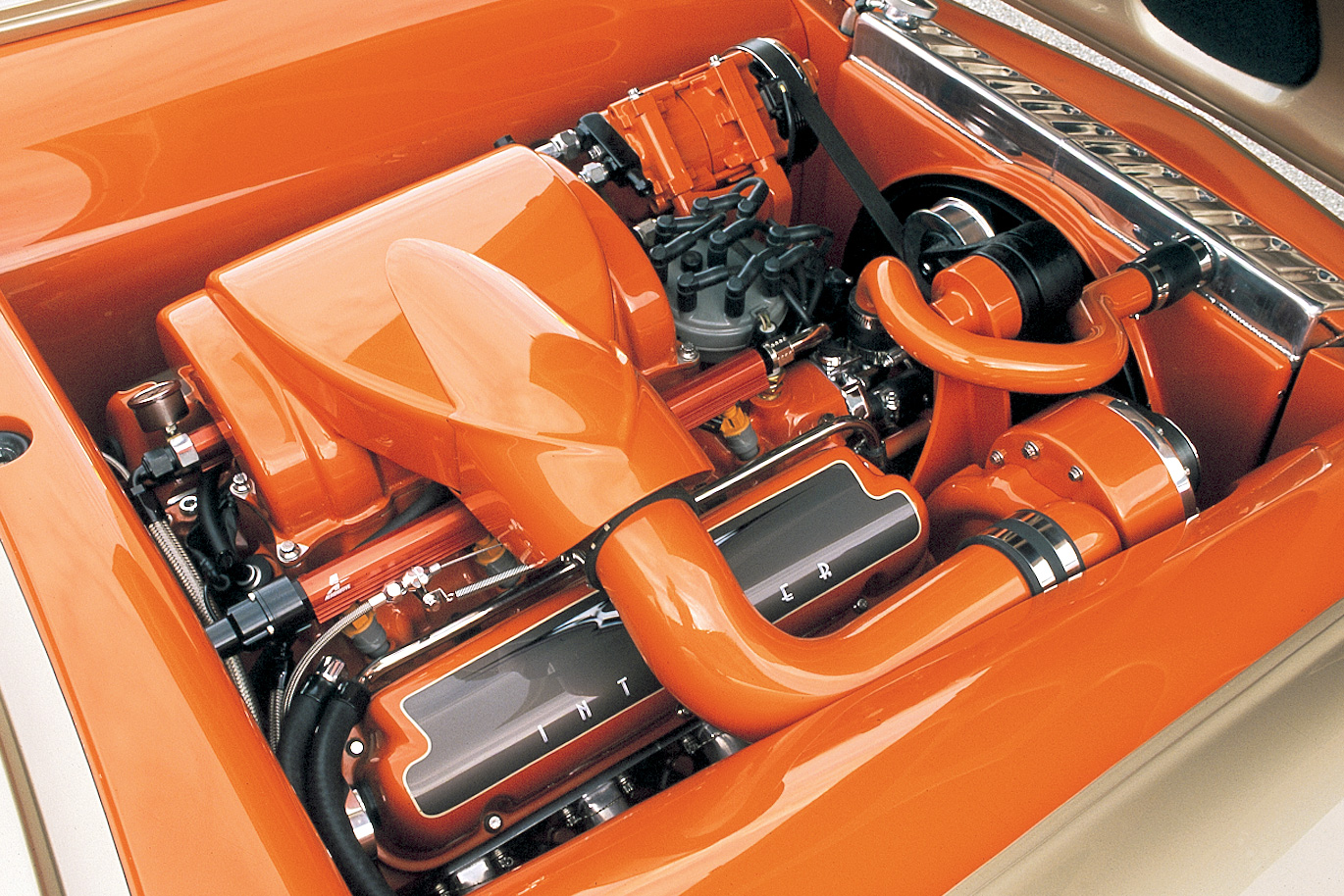 Another interesting aspect of the engine is the air intake system. Airflow begins at the custom airdam in the lower middle of the front bumper before flowing up the left side of the radiator core support that houses the air filter. (This support cradles a Griffin aluminum radiator assisted by Vintage Air’s thermostatically controlled electric fans.) Finally, the air continues across to the mass airflow sensor positioned near the right side of the inner fender, adjacent to the supercharger.