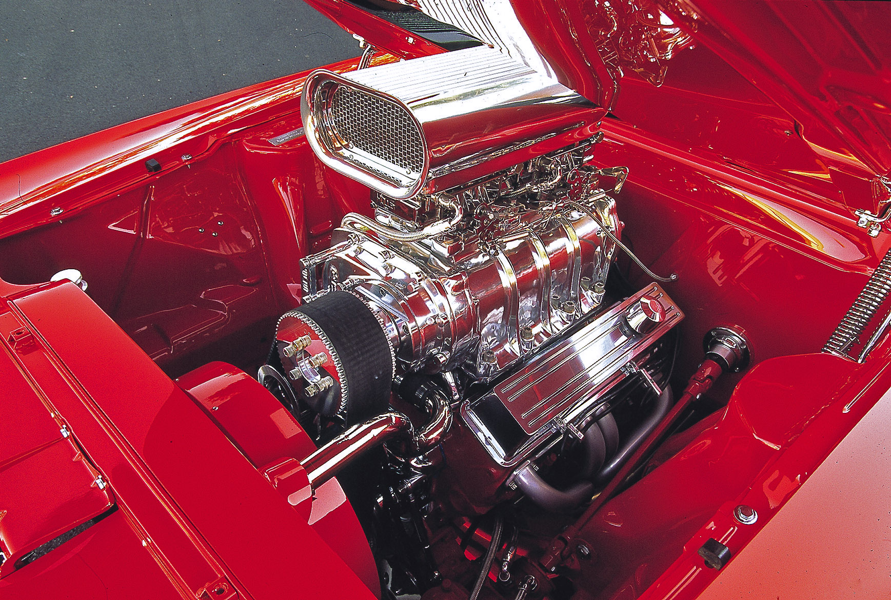 The healthy short block is topped with a set of ported and polished Brodix aluminum heads, with valve activation handled by a Lunati hydraulic roller cam with 0.560-inch lift with 287 degrees intake and 308 degrees exhaust duration. Evanuik Performance built the engine and ported the heads, and then it was topped with a Blower Drive Service 6-71 supercharger running a pair of Barry Grant 650cfm carburetors. An MSD distributor and coil handle the ignition, and exhaust exits through Street & Performance Jet Hot-coated headers and Stainless Specialties mufflers. Other engine accessories include Aeroquip braided-steel lines, a custom-built four-core radiator, Taylor wires and custom-made billet valve covers.