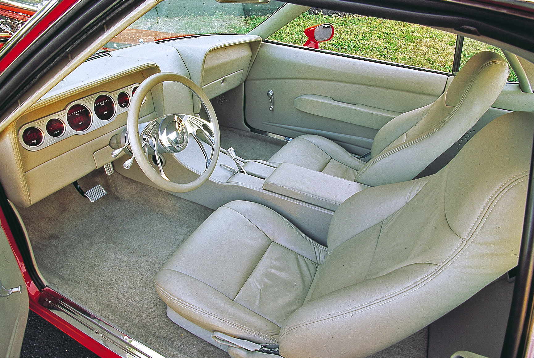 After building the super strong-running small block, Harrison planned on driving his new muscle car, so he wanted a comfortable interior. He started by replacing the old-fashioned seats with some nice ’95 Z28 Camaro bucket seats and then took the car to J.C. Auto Trim for a completely new interior. The comfortable interior was reupholstered in shale leather and wool carpets. The original door panels also were replaced with custom-designed units.