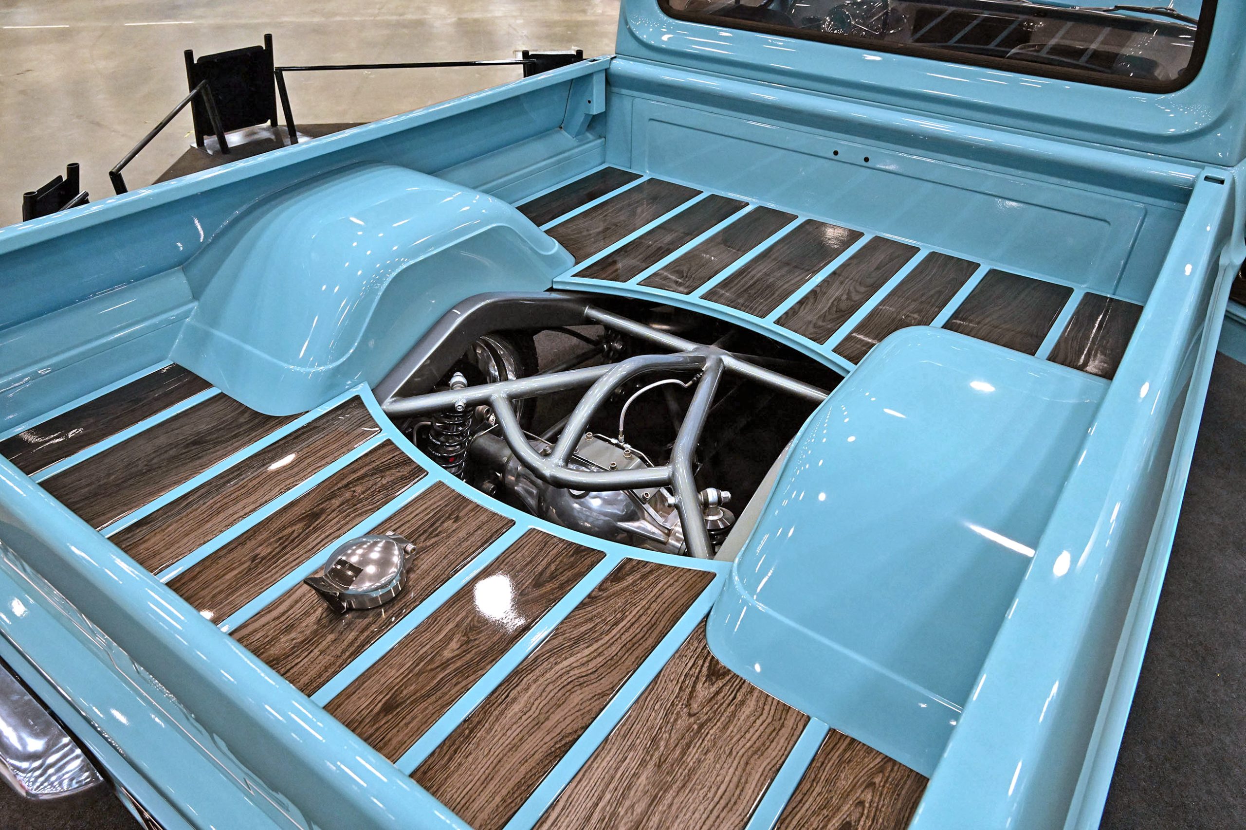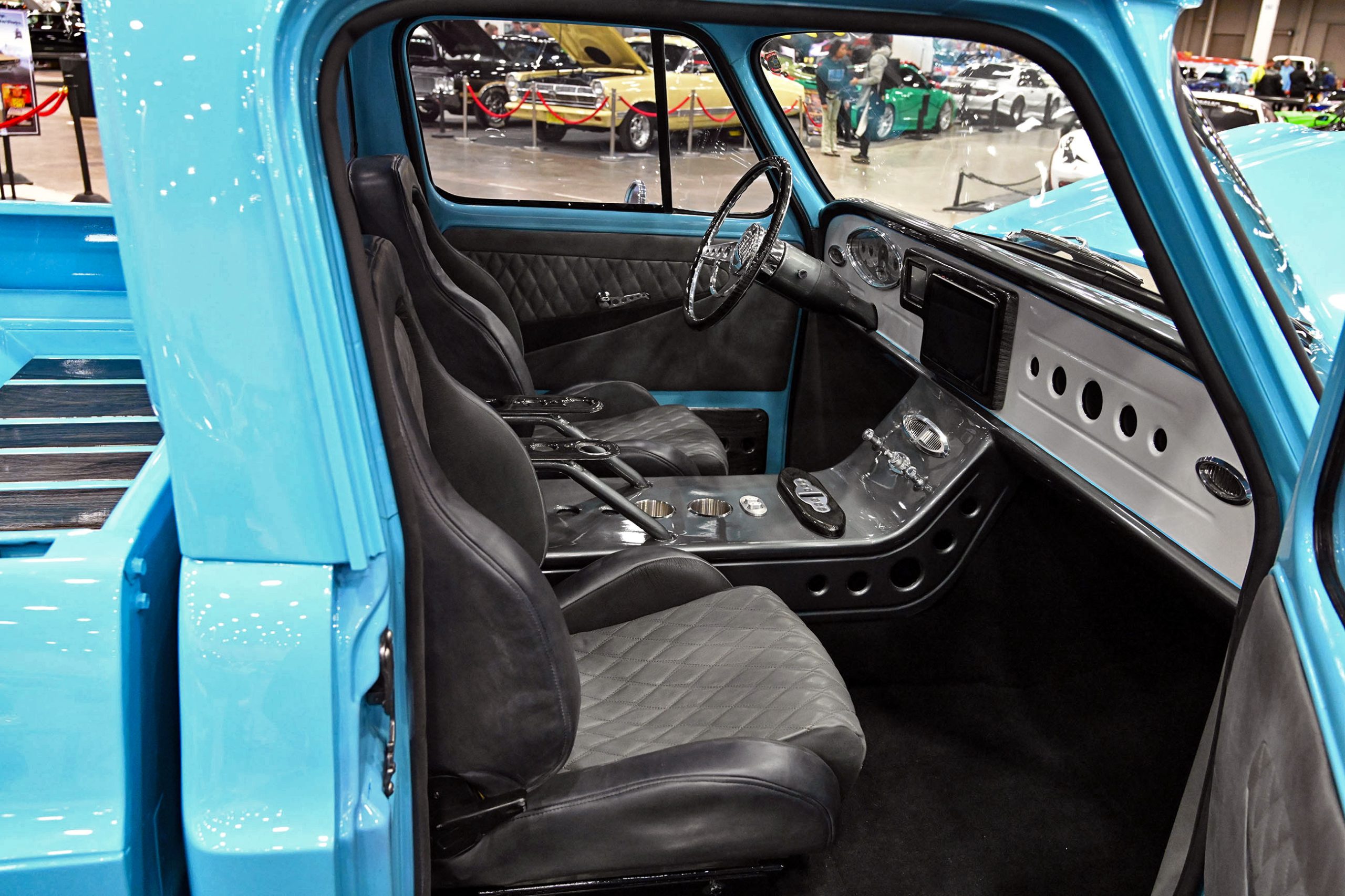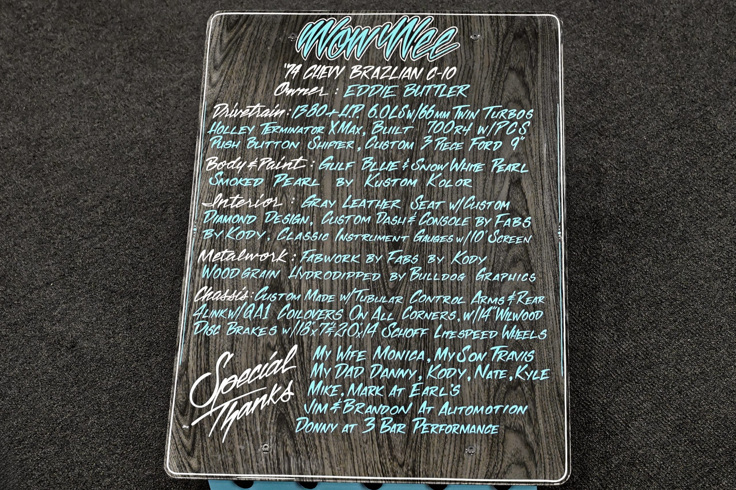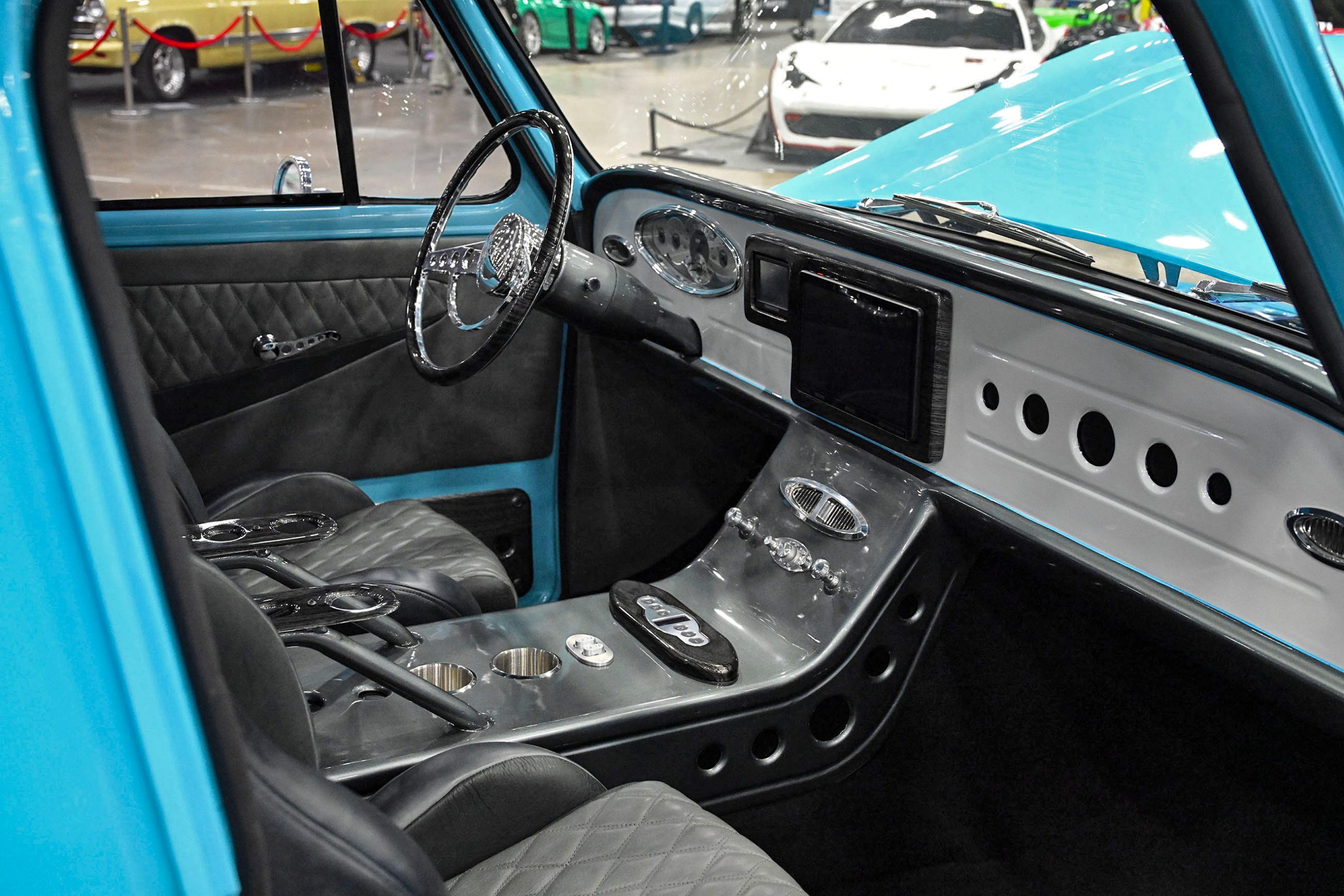 The paint pops in Gulf Blue and Snow White Pearl with smoked pearl by Kustom Kolor, while Fabs by Kody handled the interior, metalwork, and custom dash and console. Inside, gray diamond-stitched leather, a 10-inch screen, and Classic Instruments gauges mix with woodgrain hydrodipped by Bulldog Graphics. Sitting on a custom chassis with tubular control arms, QA1 coilovers on all corners, 14-inch Wilwood discs, and Schott Litespeed wheels (18×7 front, 20×14 rear), the WOW WEE C10 isn’t just rare—it’s a factory mash-up made downright insane with modern horsepower.