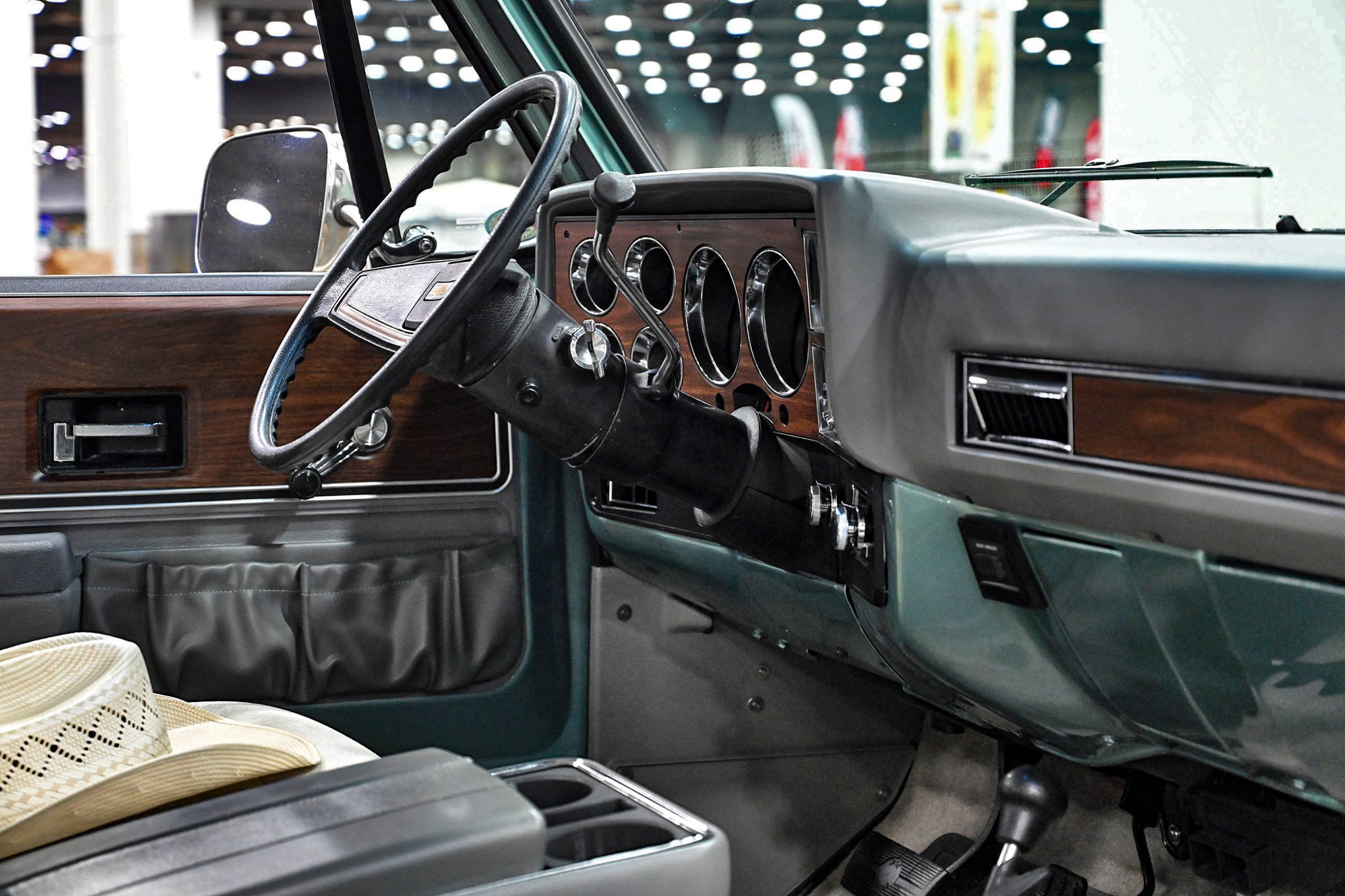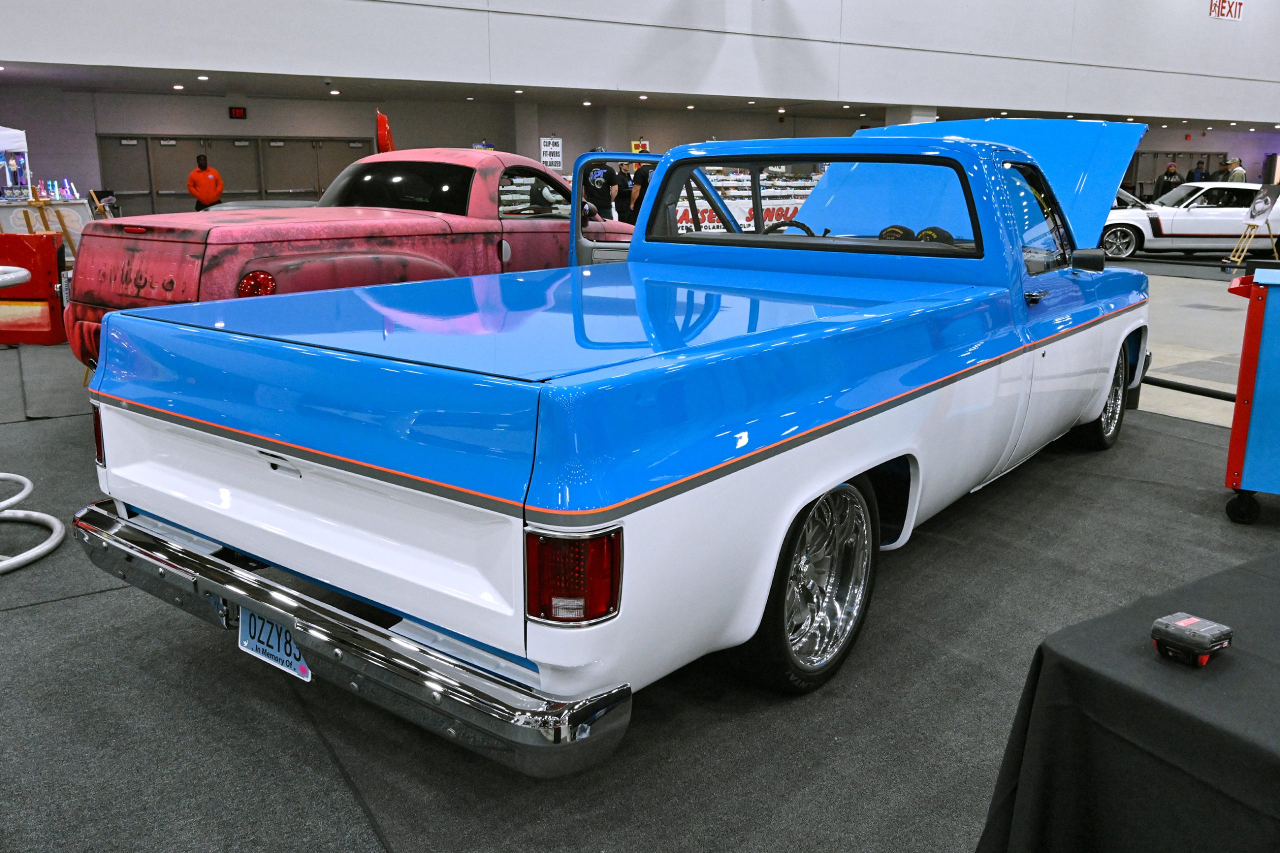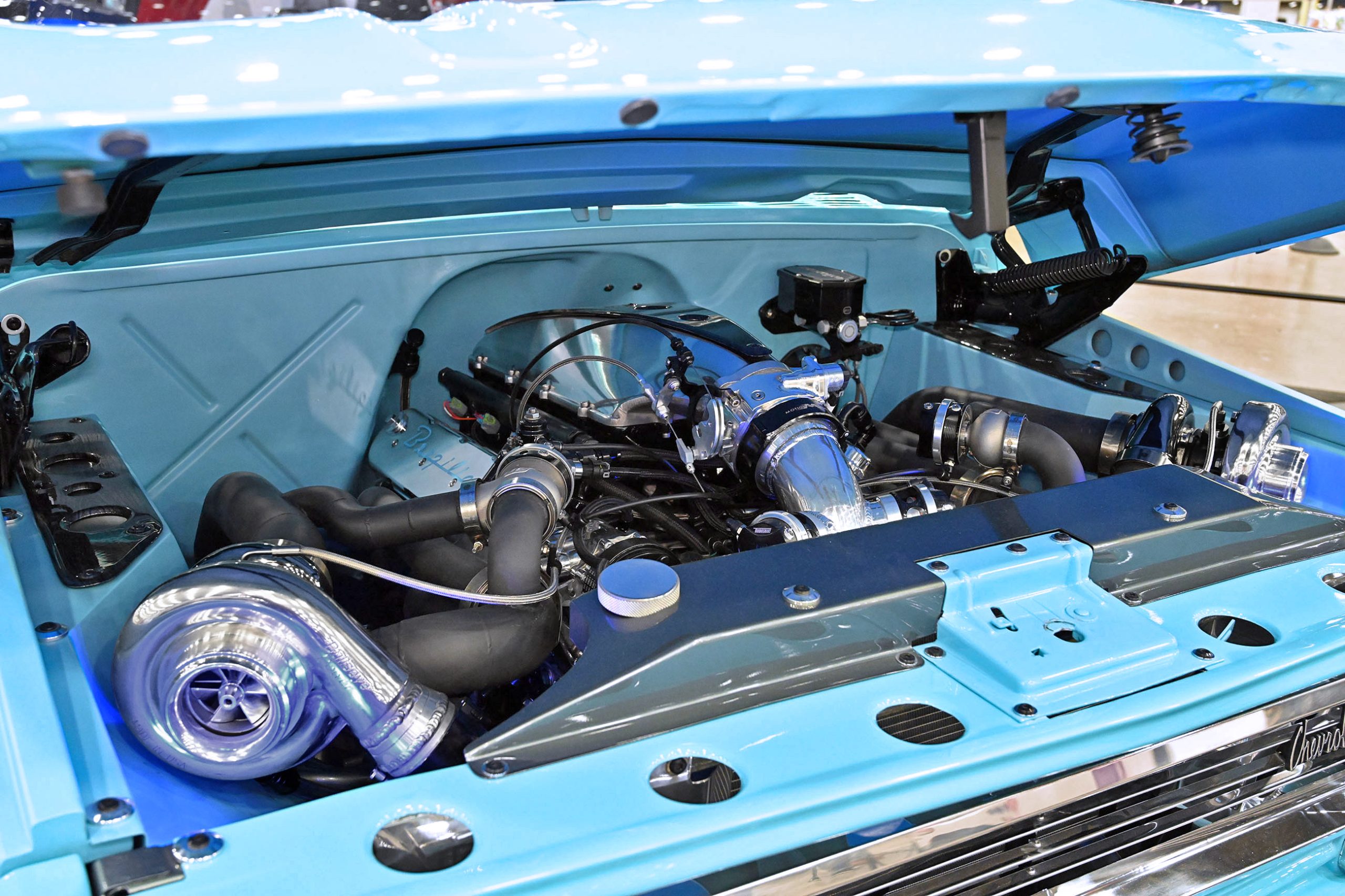 The paint pops in Gulf Blue and Snow White Pearl with smoked pearl by Kustom Kolor, while Fabs by Kody handled the interior, metalwork, and custom dash and console. Inside, gray diamond-stitched leather, a 10-inch screen, and Classic Instruments gauges mix with woodgrain hydrodipped by Bulldog Graphics. Sitting on a custom chassis with tubular control arms, QA1 coilovers on all corners, 14-inch Wilwood discs, and Schott Litespeed wheels (18×7 front, 20×14 rear), the WOW WEE C10 isn’t just rare—it’s a factory mash-up made downright insane with modern horsepower.