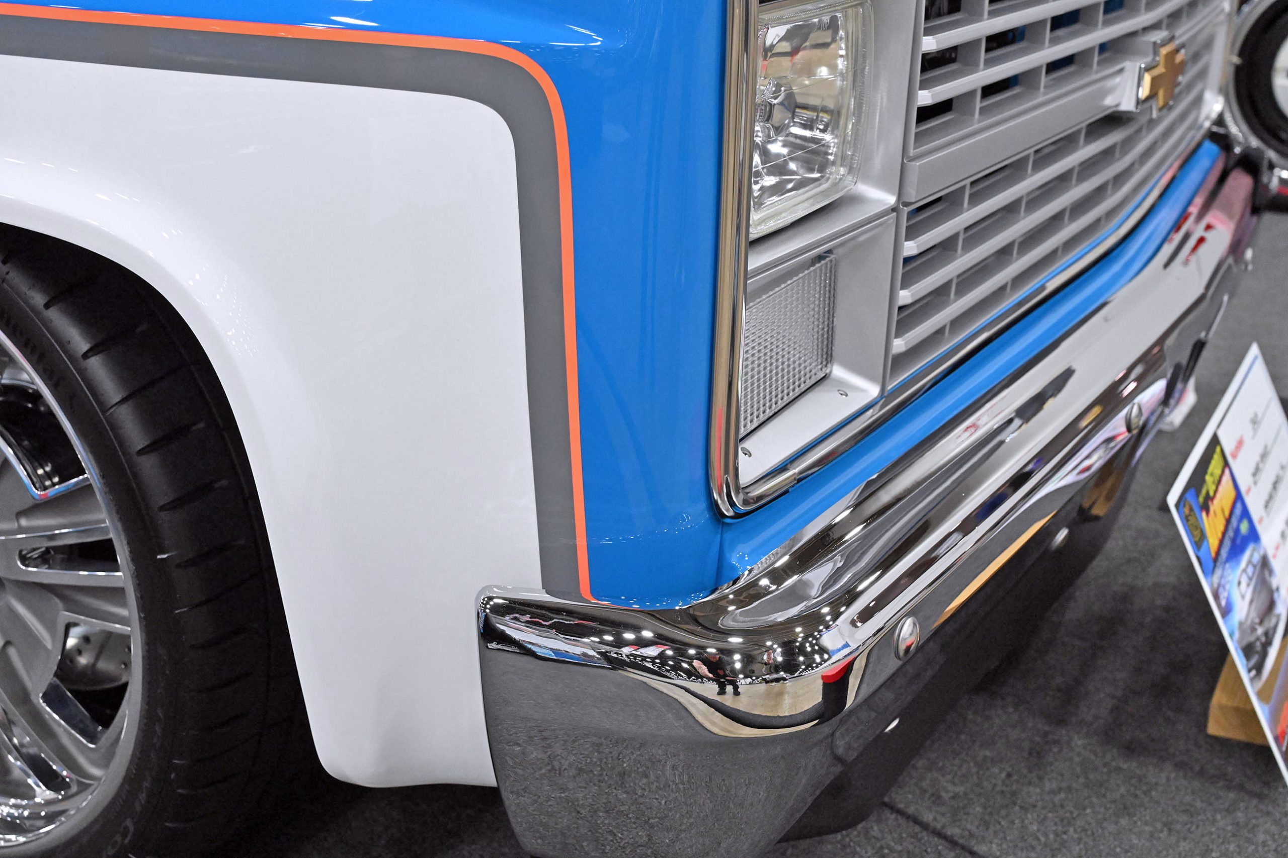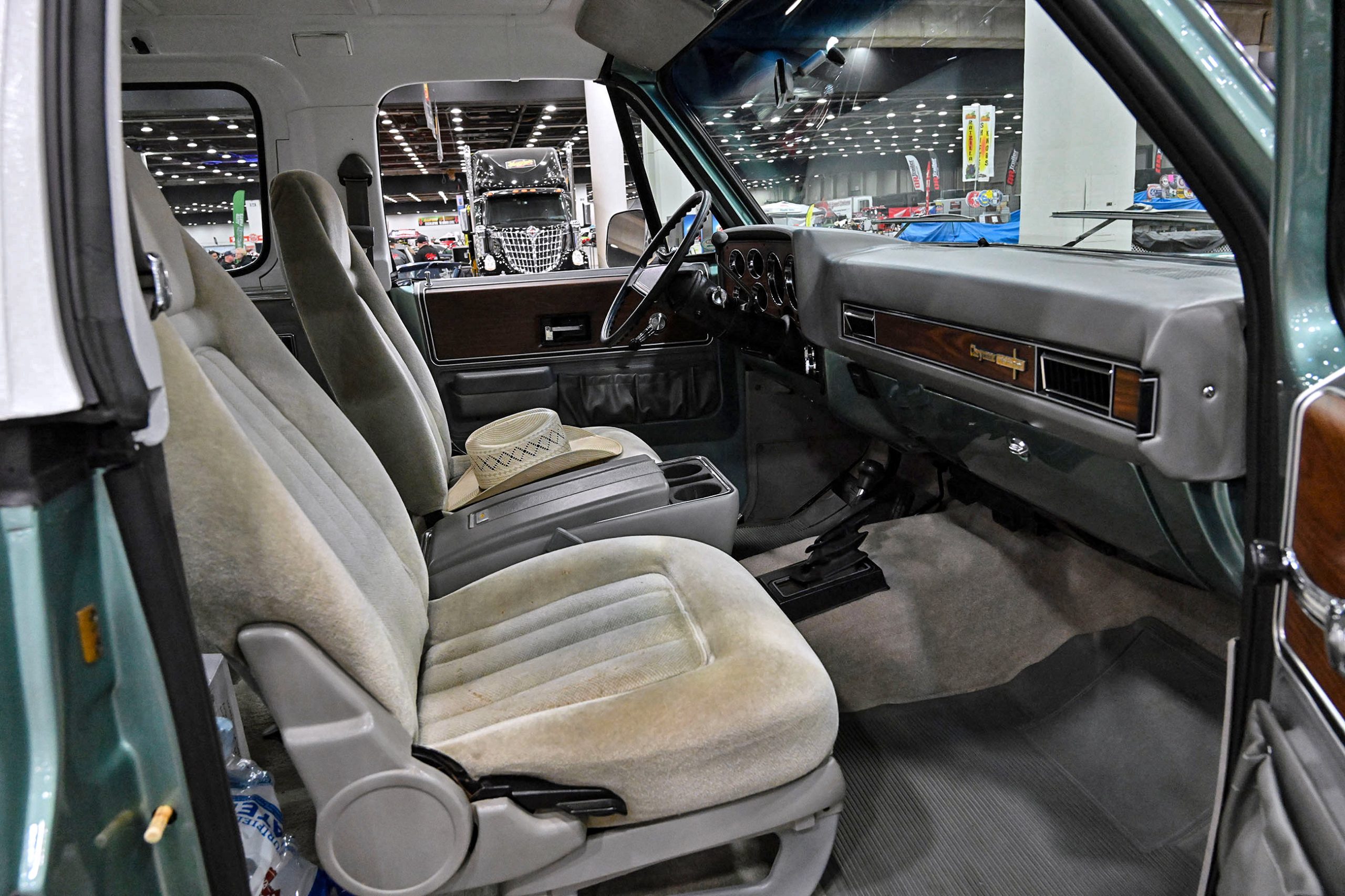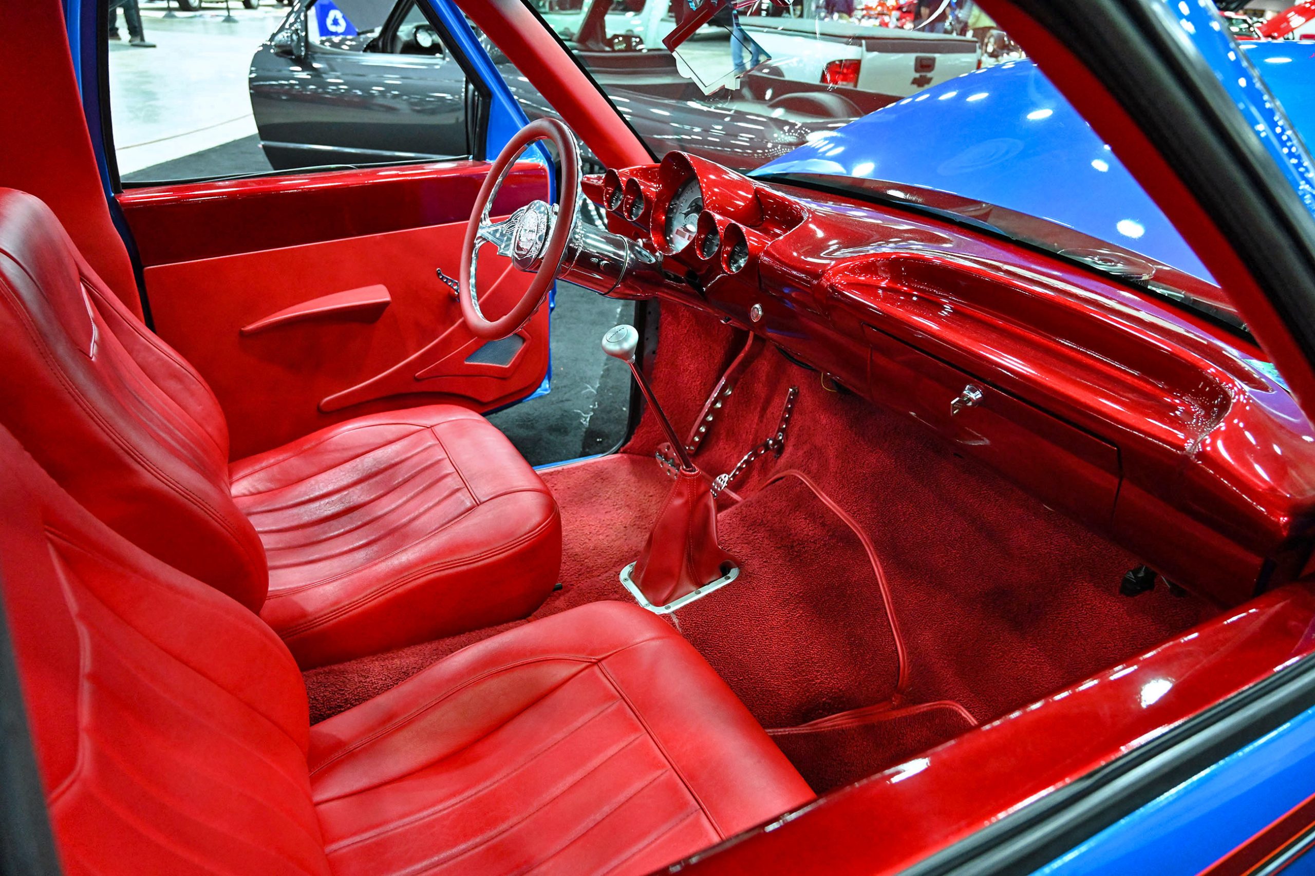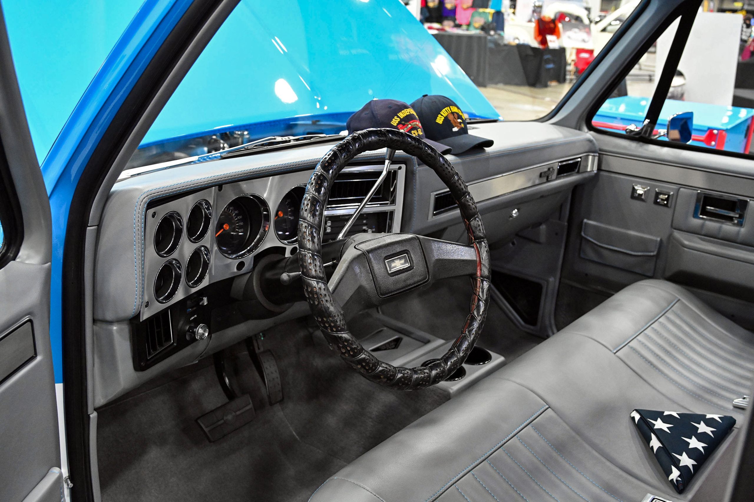 The paint pops in Gulf Blue and Snow White Pearl with smoked pearl by Kustom Kolor, while Fabs by Kody handled the interior, metalwork, and custom dash and console. Inside, gray diamond-stitched leather, a 10-inch screen, and Classic Instruments gauges mix with woodgrain hydrodipped by Bulldog Graphics. Sitting on a custom chassis with tubular control arms, QA1 coilovers on all corners, 14-inch Wilwood discs, and Schott Litespeed wheels (18×7 front, 20×14 rear), the WOW WEE C10 isn’t just rare—it’s a factory mash-up made downright insane with modern horsepower.