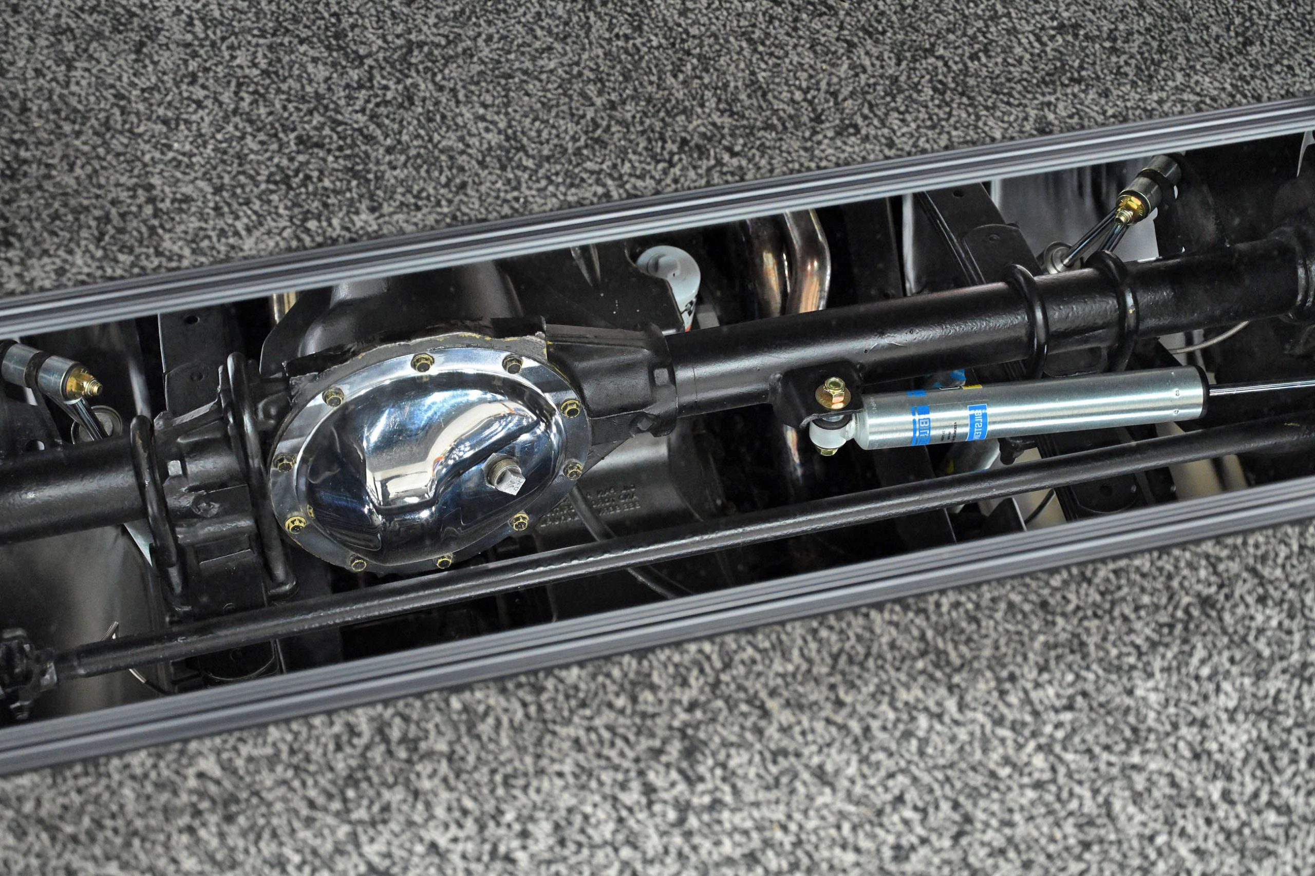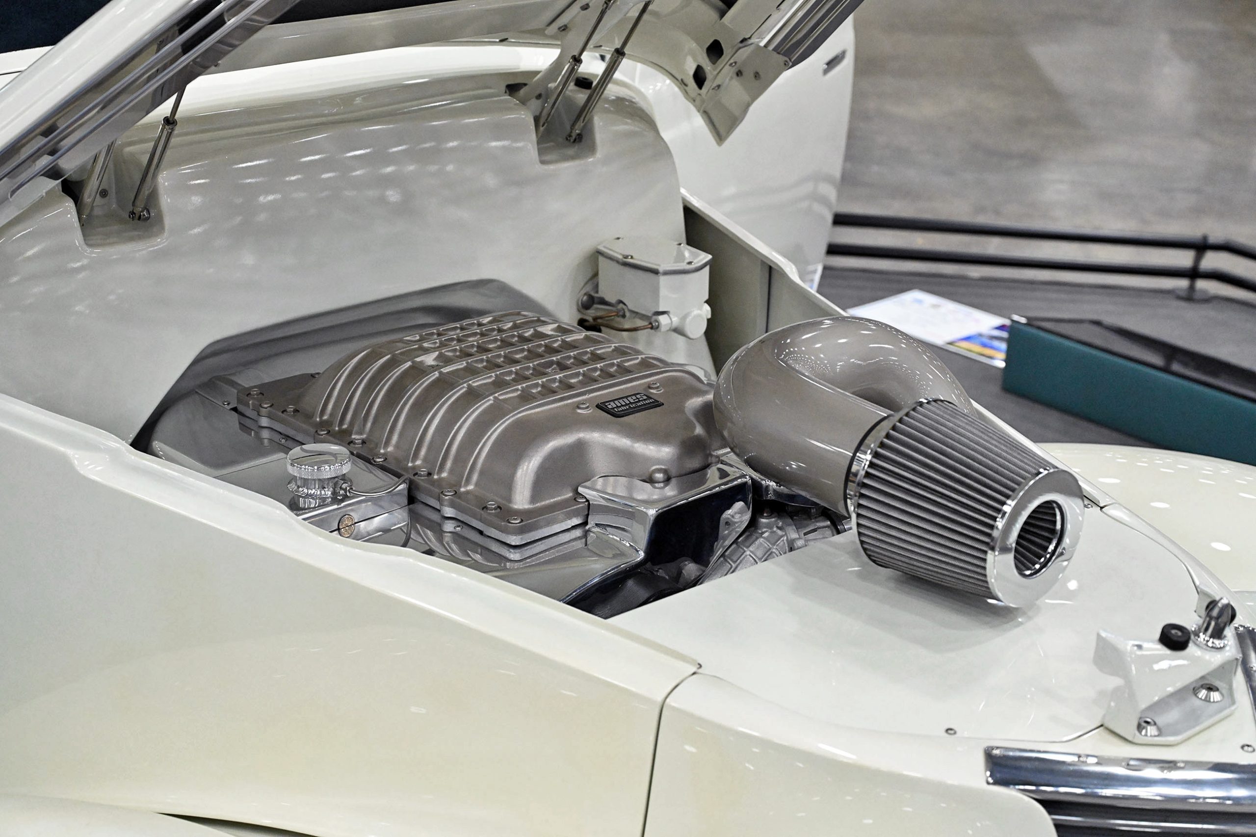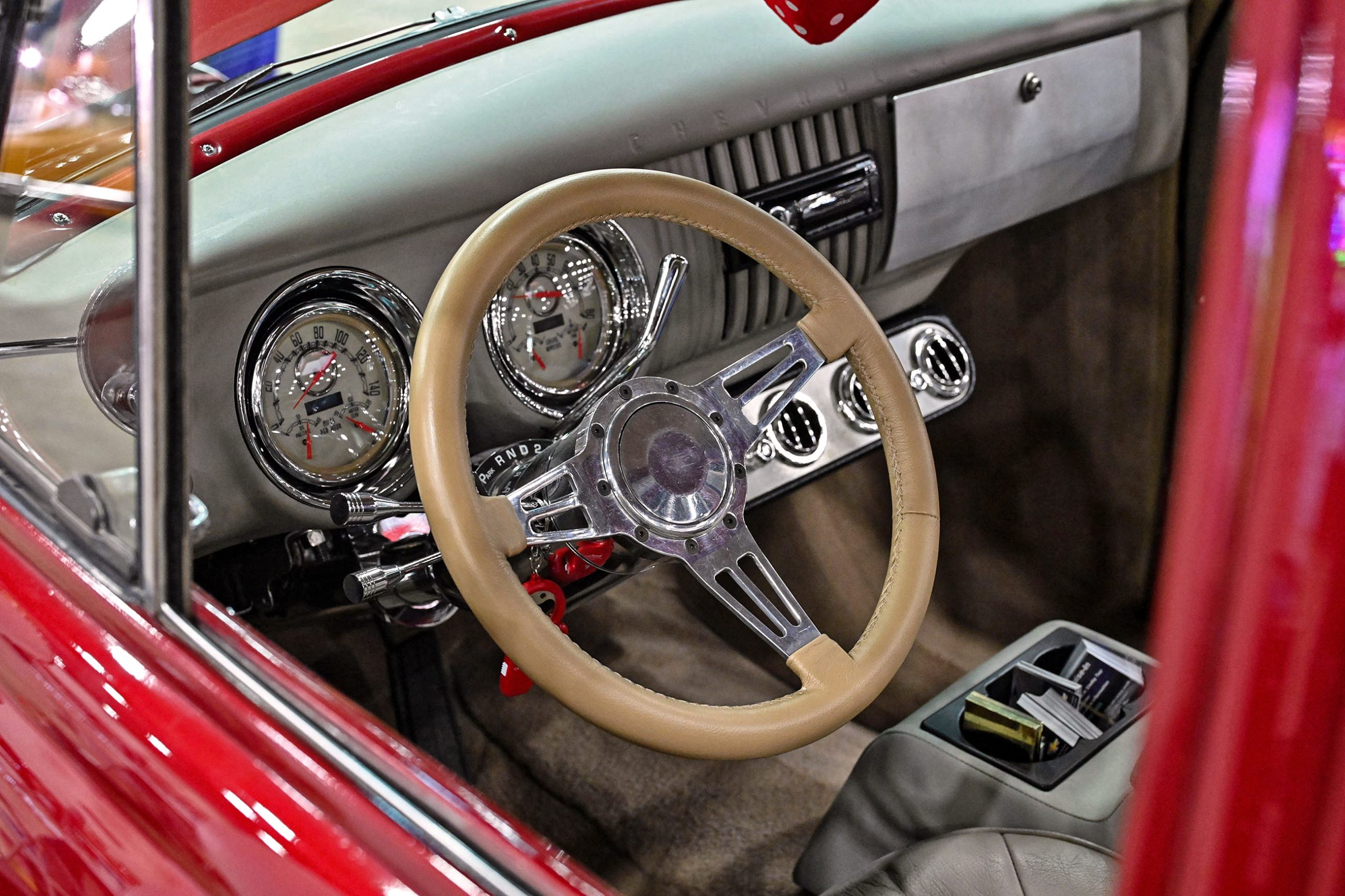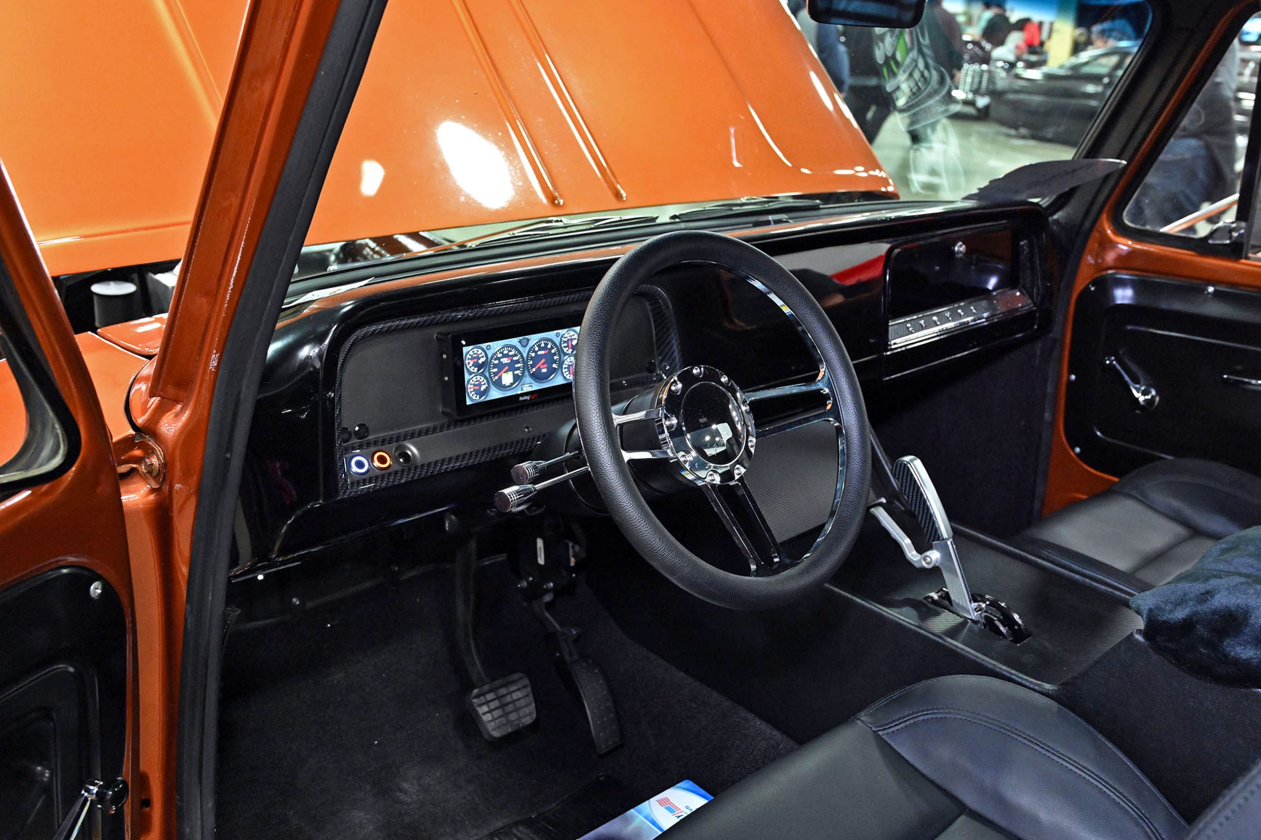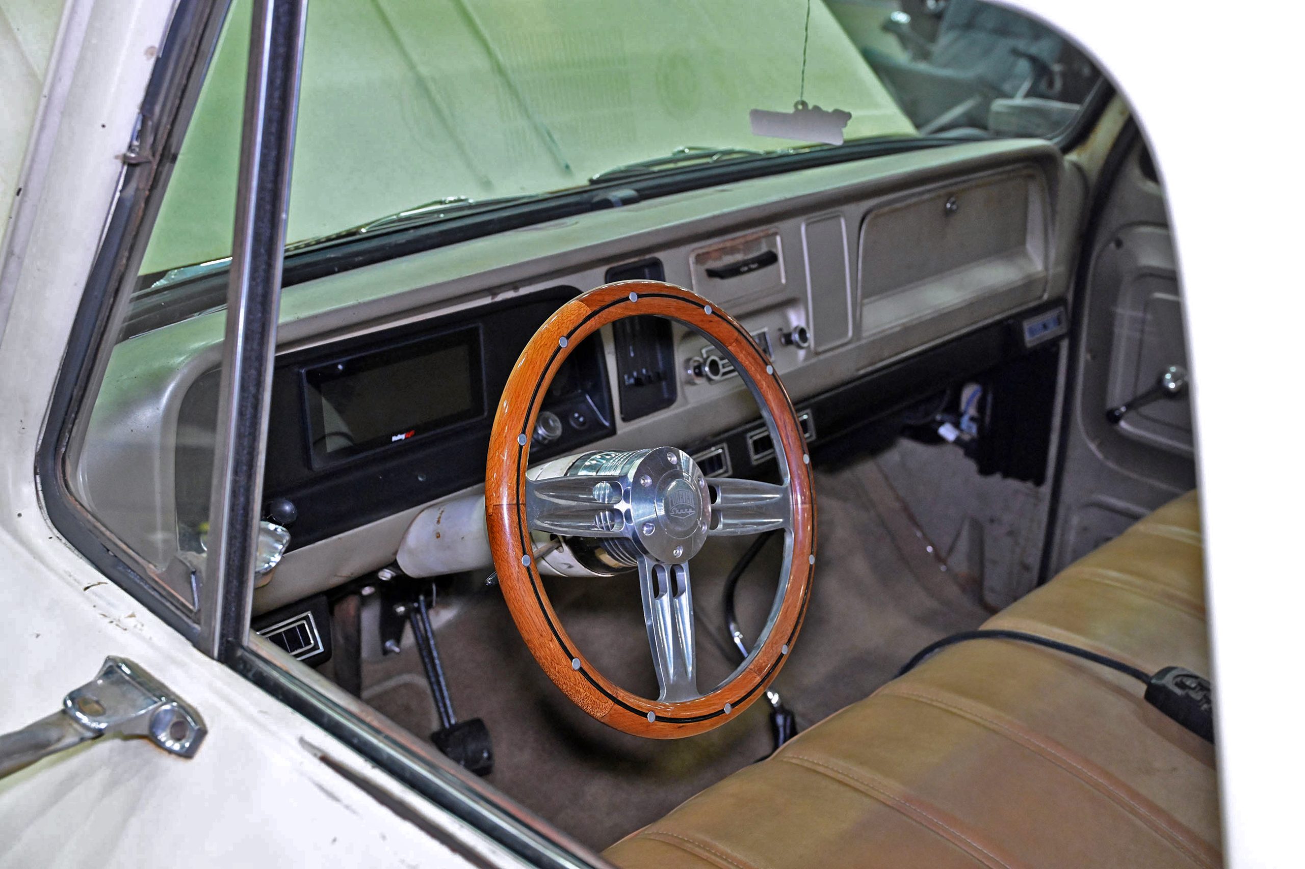 The bodywork, built from all original steel, features a long list of carefully executed modifications, including a custom aluminum grille, flush-mounted windshield, hidden hinges and flush door handles, and an oval rear window that adds a distinctive custom touch. The headlights were lowered three inches to sharpen the truck’s stance, while the bed was extensively reworked with a bulkhead contoured to the cab, a hinged bed floor, and custom tailgate hardware. Finished in Crystal Champagne Pearl with a titanium powder-coated frame, the truck carries a clean, high-end presentation throughout. Inside, Trent’s Trick Upholstery crafted the interior, complete with a 3D-printed steering wheel and Dakota Digital gauges, while Hotwire Auto handled the wiring. The result is a carefully engineered custom that blends modern supercharged power with sophisticated craftsmanship and unmistakable attitude.