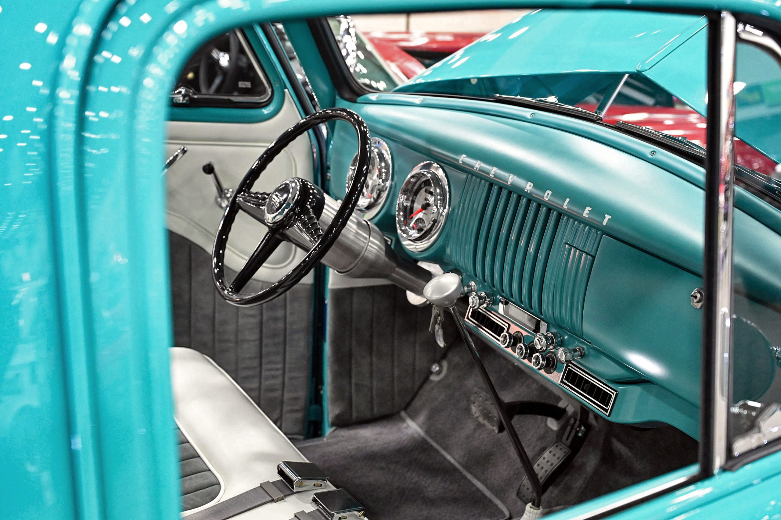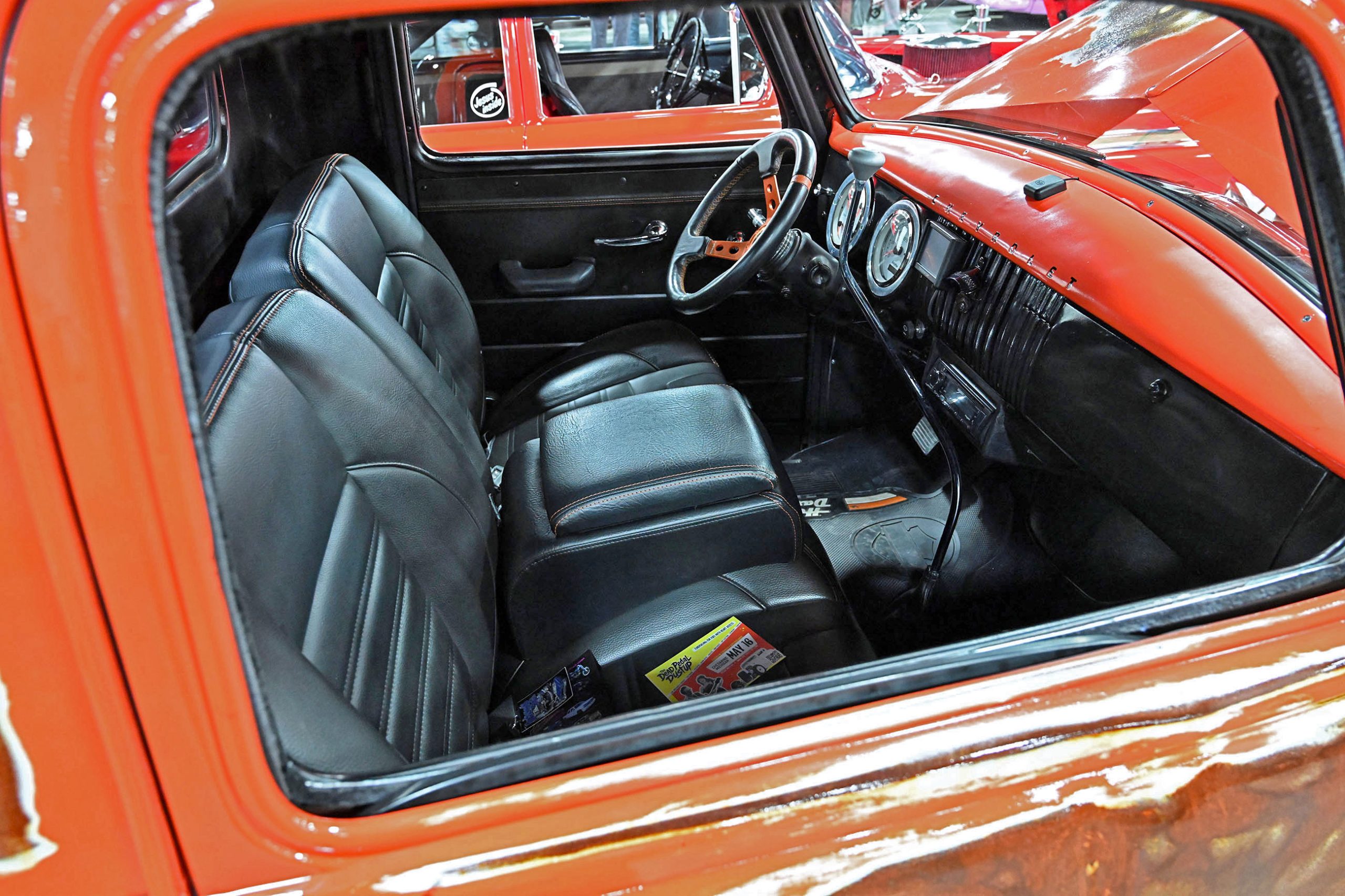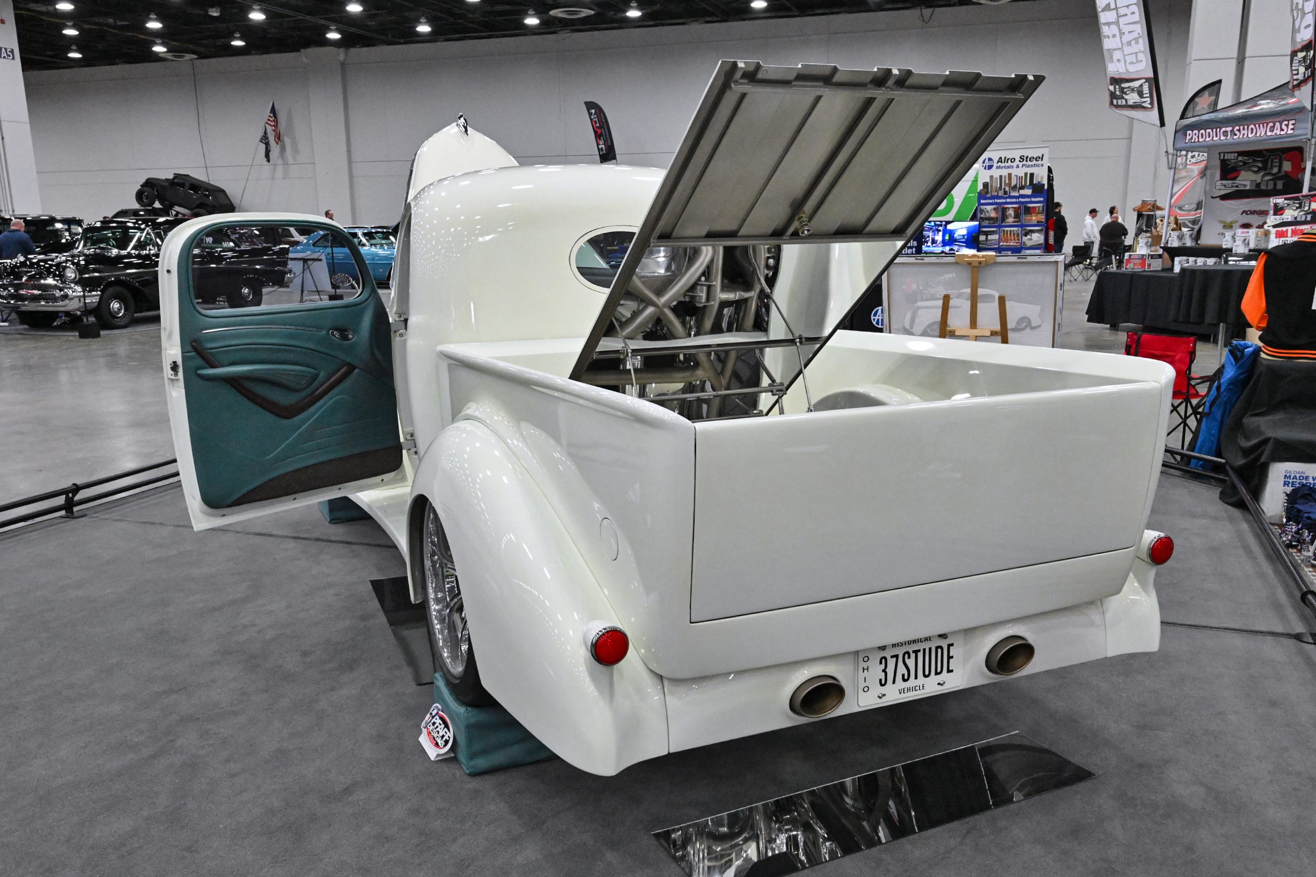 Kurt Finton’s ’37 Studebaker Coupe Express, known as the “Hellcat Express,” blends classic truck lines with modern supercharged muscle. Built on a James Ames round-tube chassis with Heidts independent front suspension and high-horsepower IRS, the truck is engineered to handle the serious power lurking under the hood. That power comes from a 707hp supercharged 6.2L Hellcat Hemi backed by an 8-speed automatic, delivering modern Mopar performance in a completely reimagined prewar package. Visually, the proportions were refined with a four-inch stretch in the cab and doors, giving the truck better balance while creating more interior space. It rolls on **Schott Throttle wheels—18×8 up front and 20×10 out back—**with Wilwood disc brakes bringing everything back down to earth.