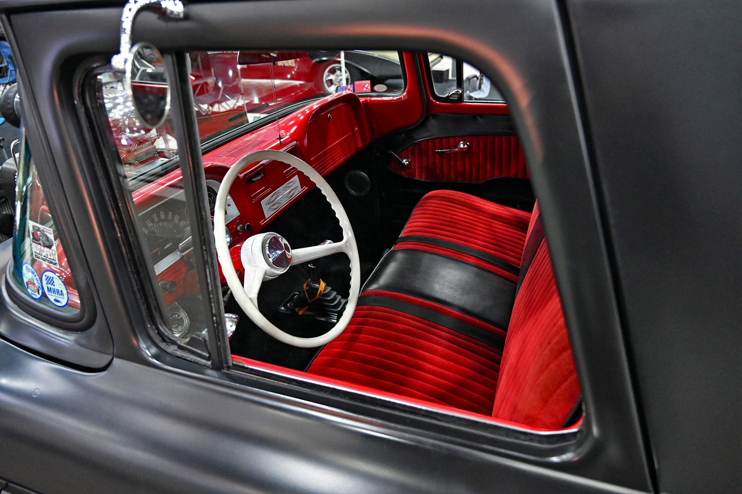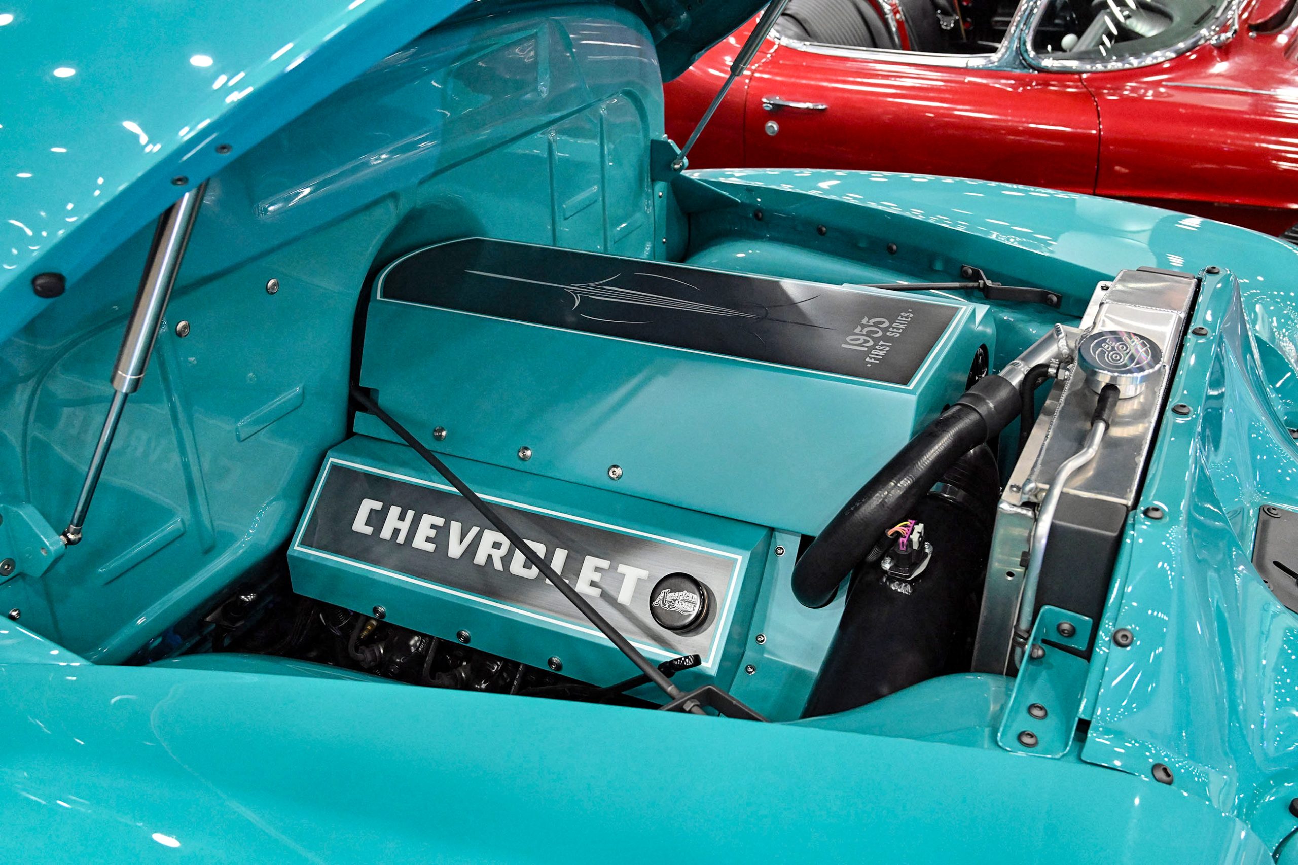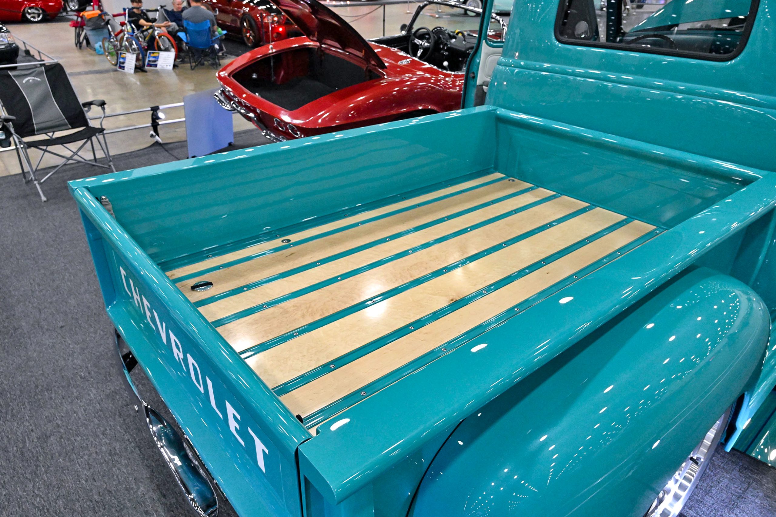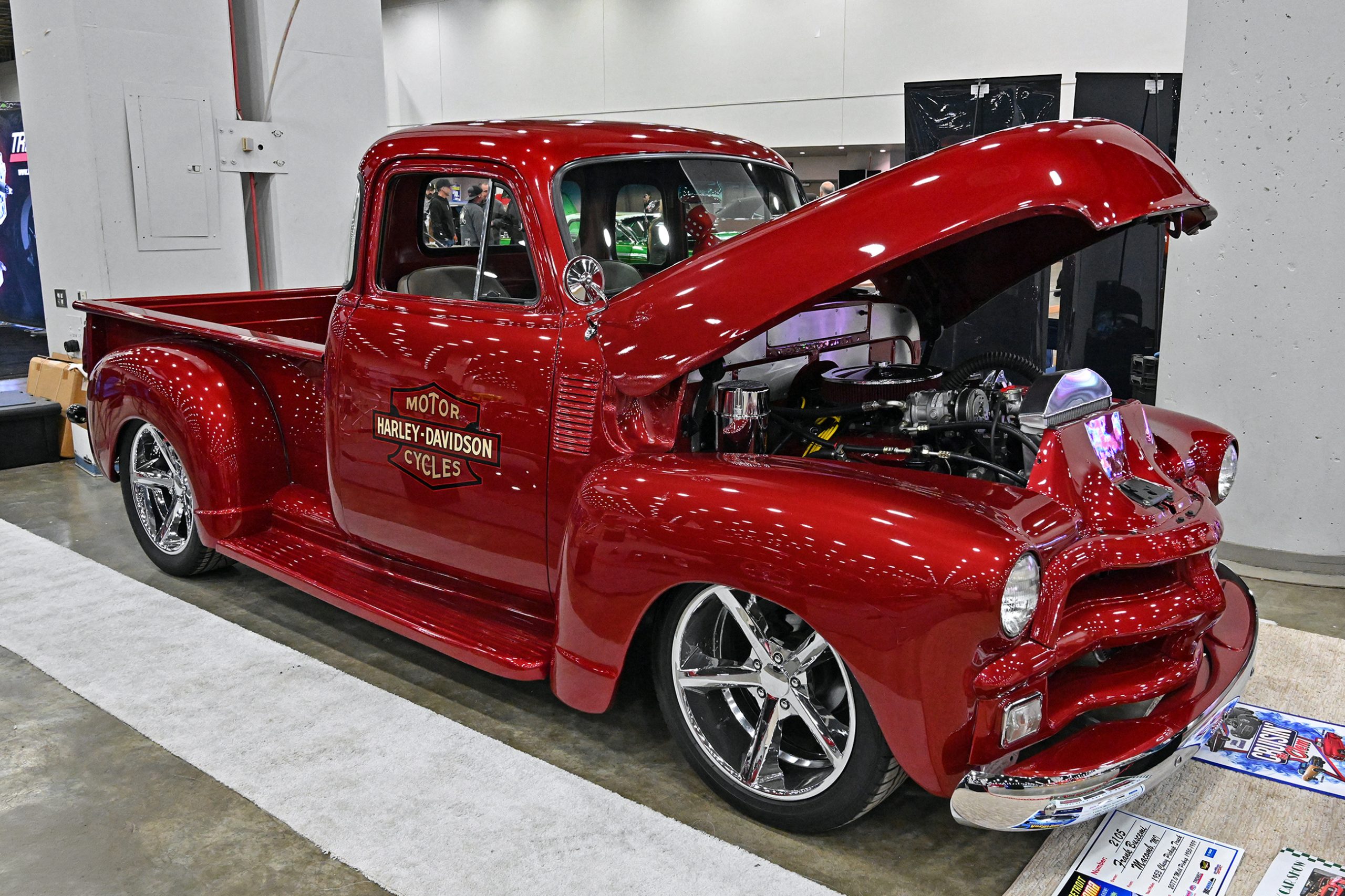 This 1953 Chevrolet pickup owned by Frank Buscemi stands out thanks to a truly unique piece of hand-painted artistry. The truck features a one-of-a-kind Harley-Davidson logo pinstriping design created by legendary pinstriper Letterfly, turning the classic Chevy into a rolling canvas. The detailed striping work adds a bold custom touch that blends motorcycle culture with vintage truck style, giving the pickup a personality all its own.
