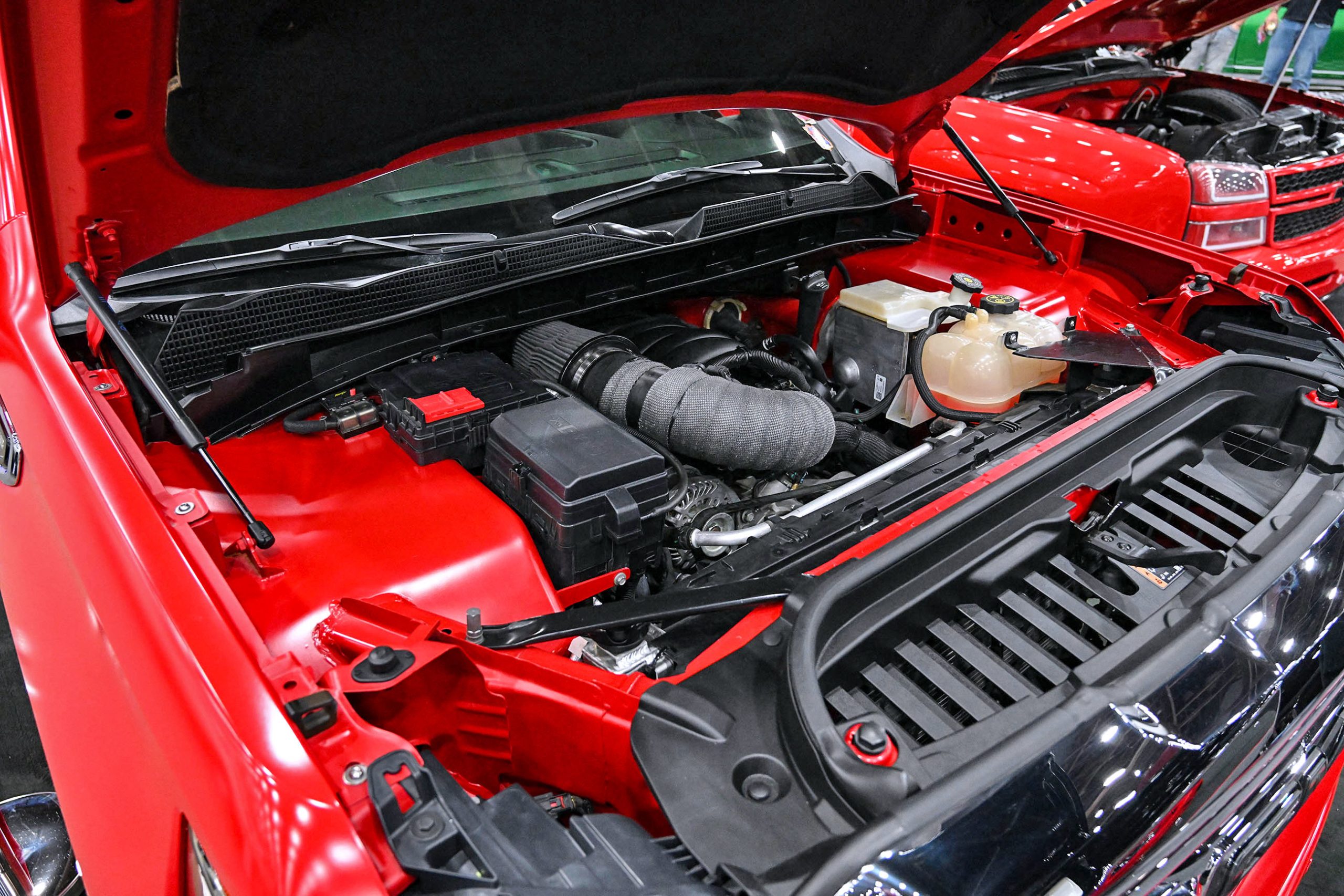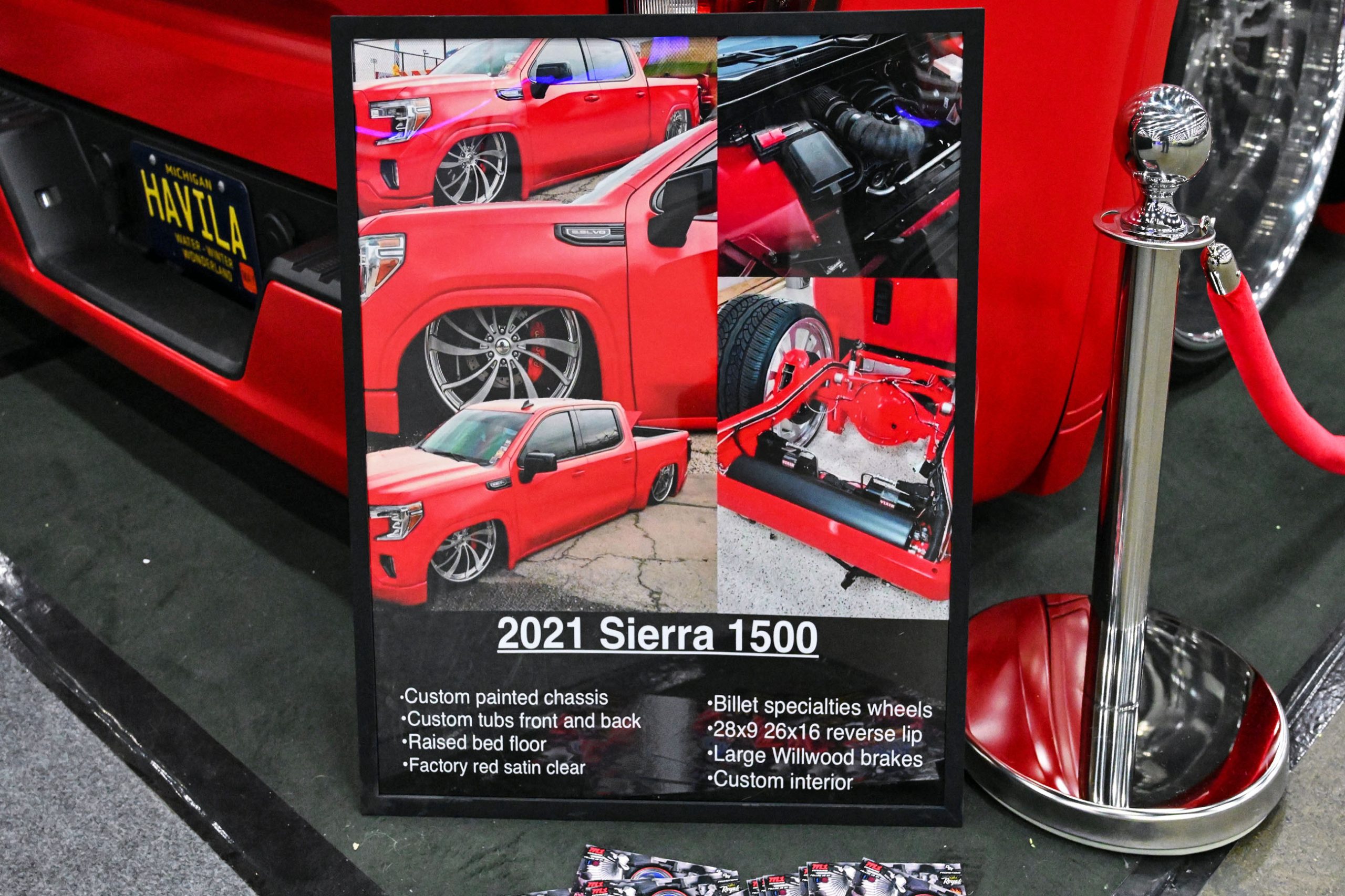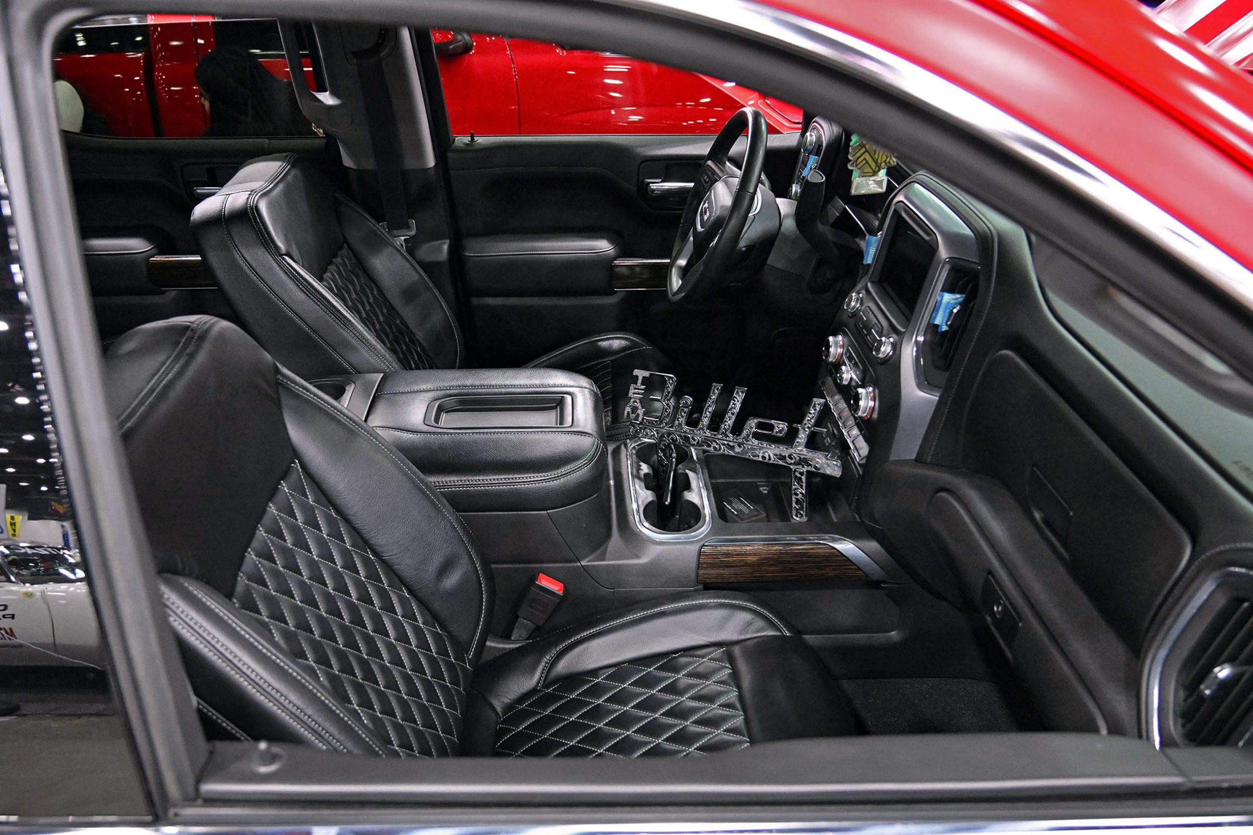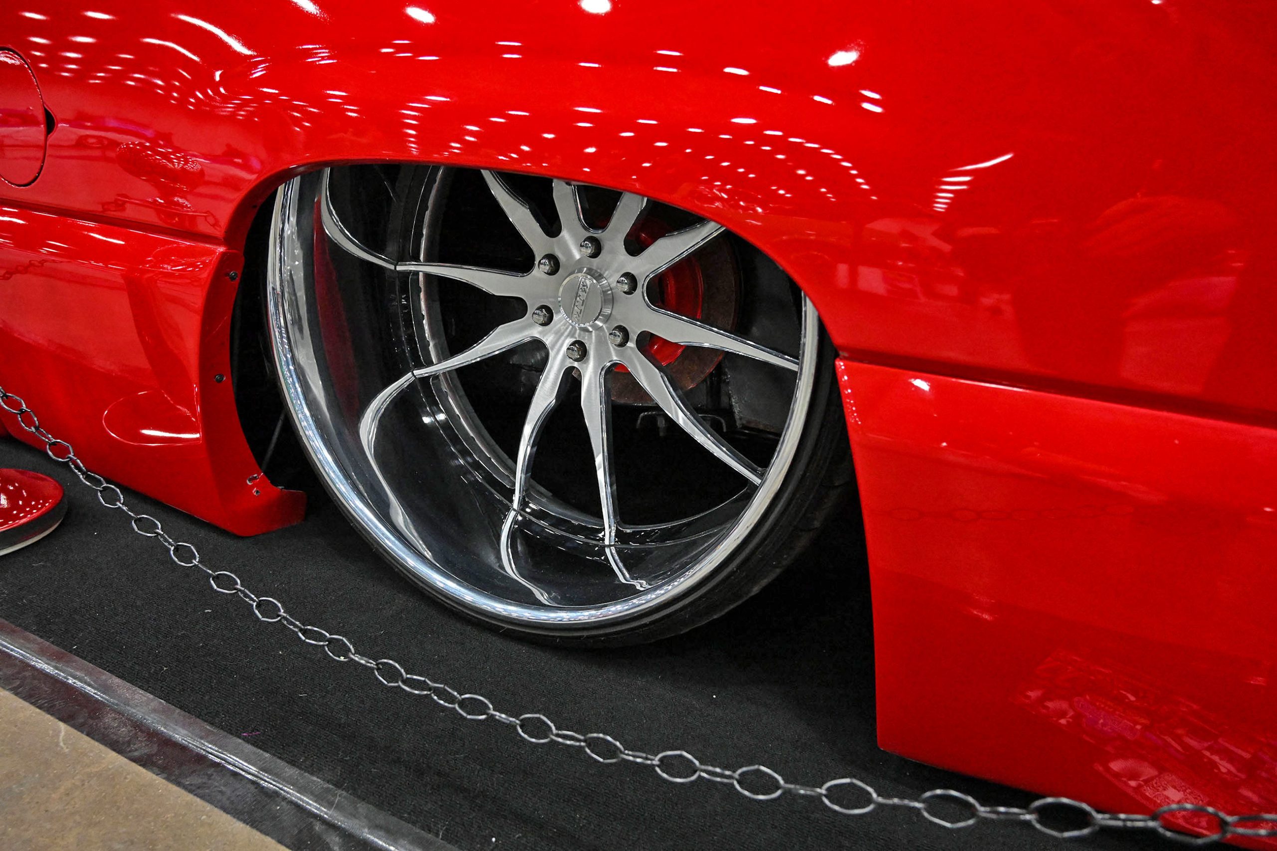Humberto Avila’s 2021 GMC Sierra 1500 represents the modern side of the Team Billet show-truck movement—clean, low, and built with serious attention to detail. The truck features a custom-painted chassis, with extensive fabrication including front and rear tubs and a raised bed floor to accommodate its massive rolling stock while keeping the stance dialed in. Finished in factory red with a satin clear, the Sierra has a rich, modern finish that pairs perfectly with its laid-out presence.