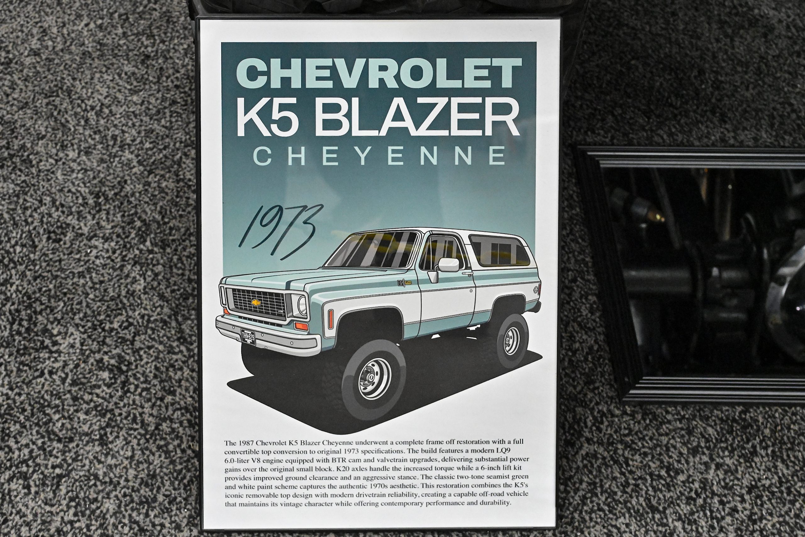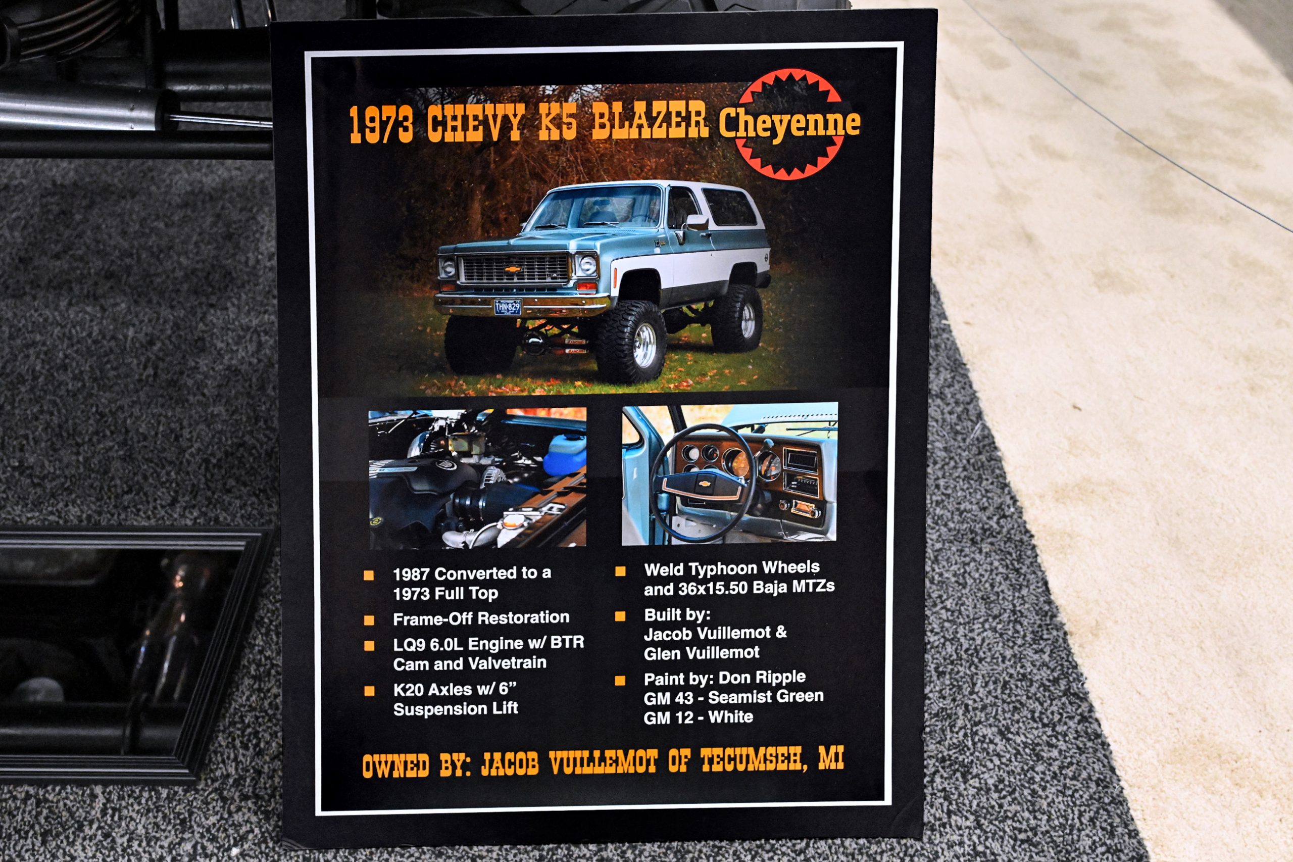 Jacob Vuillemot’s K5 Blazer Cheyenne blends classic early Blazer style with modern muscle and trail-ready hardware. Originally a 1987 model, the truck underwent a complete frame-off restoration and was converted to the desirable 1973 full convertible top configuration, bringing back the iconic removable-top design that made early K5s legends both on the street and off-road. Finished in the classic GM Seamist Green and White two-tone, the paintwork by Don Ripple perfectly captures the unmistakable look of a 1970s Chevrolet 4×4.