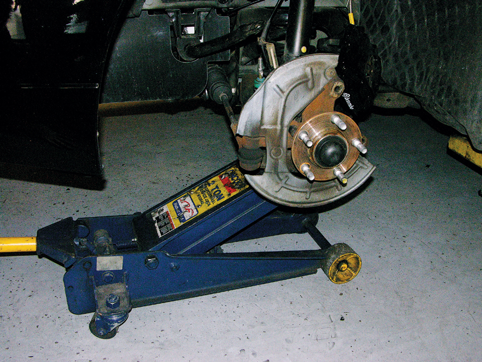 Before you can install the rest of the new suspension, put the wheels back on the car. Raise the jackstands until you like the fit between the tire and the wheel arch. Measure the distance and save it for determining ride height later.
