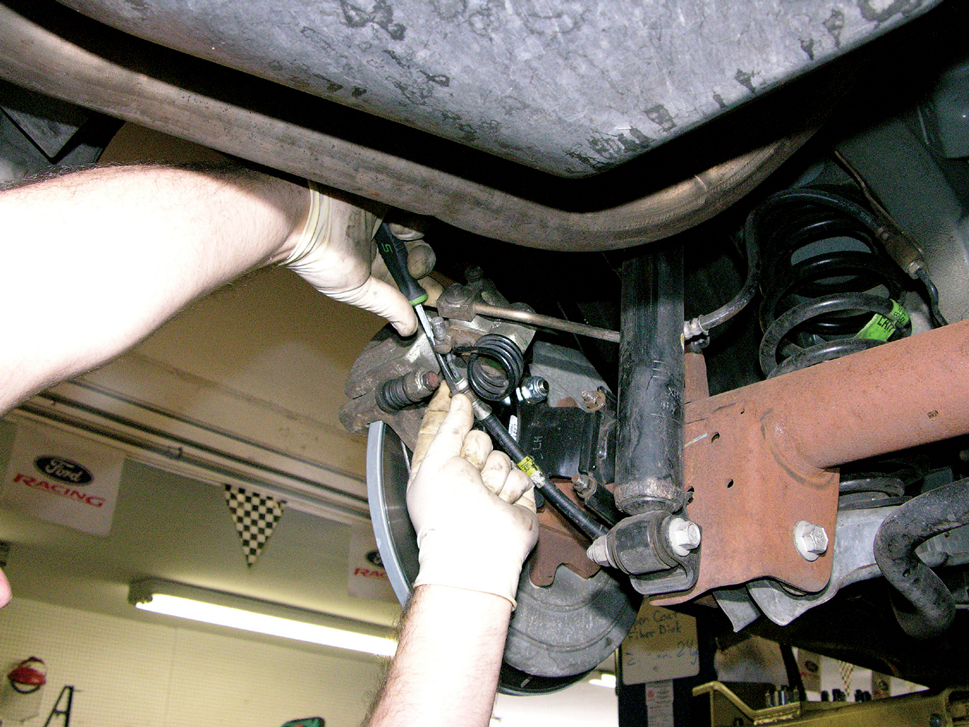Begin by disconnecting the parking brake cables at the caliper.