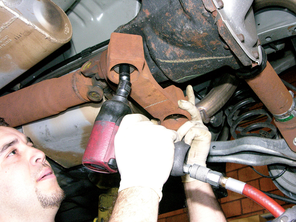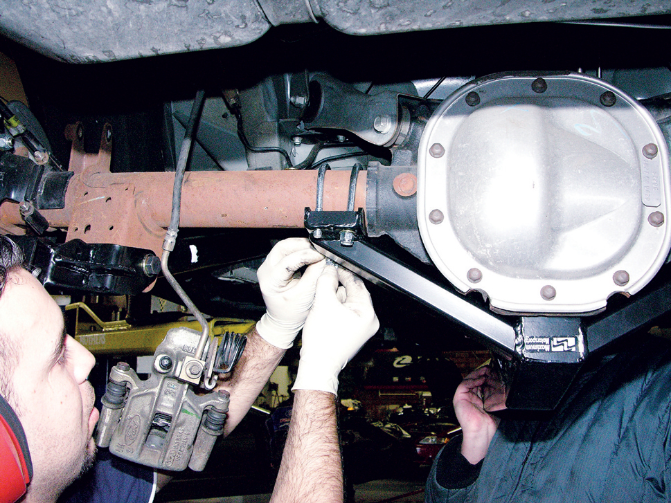 Another four U-bolts hold the sway bar to the rear axle. Take measurements, center the sway bar and bolt it down