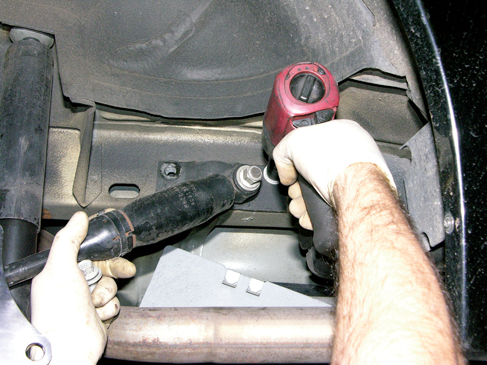On the passenger side, remove the factory lower shock mount and replace it with this new mount (this is only necessary if you’re installing coilovers).