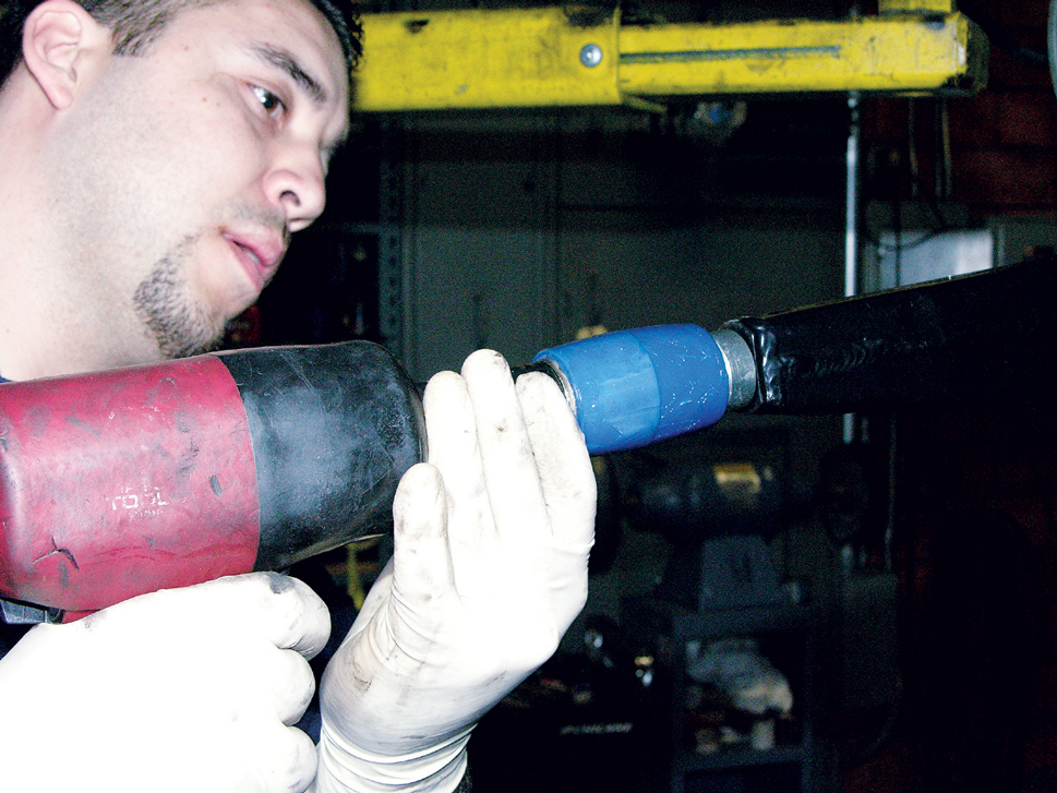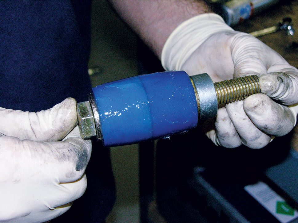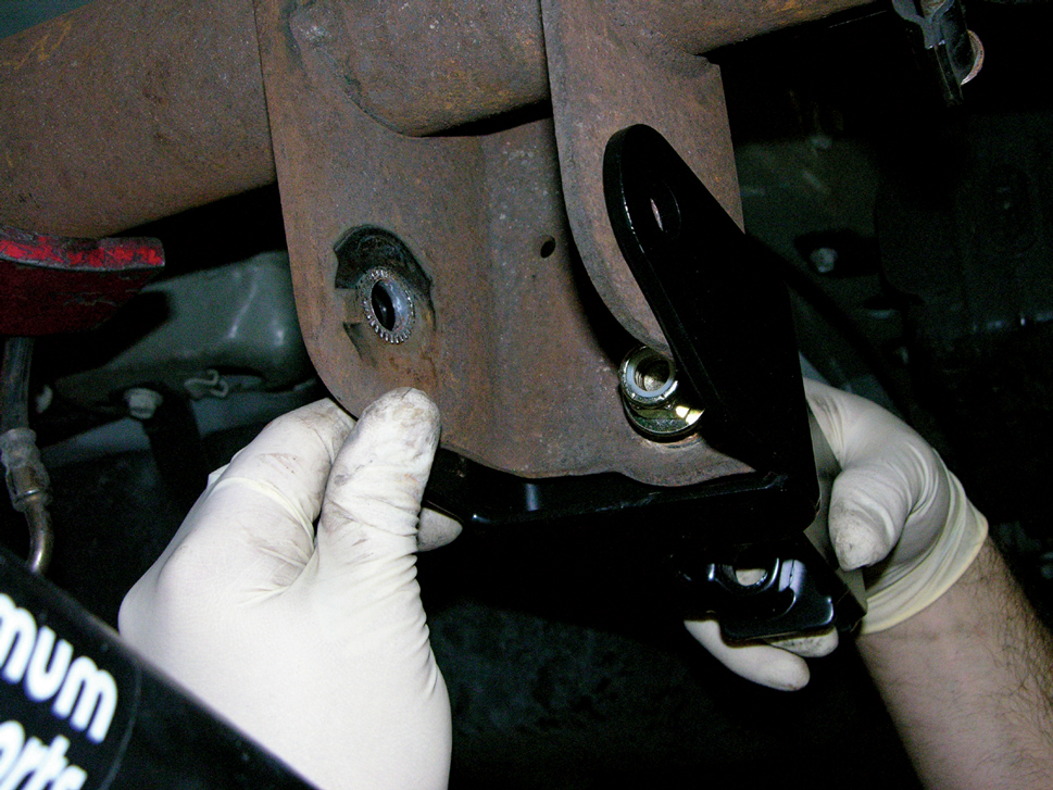 Use a rubber mallet to seat the torque arm crossmember on the pivot bolt assembly. The edge of the receiver tube should align with the edge of the urethane bushing.