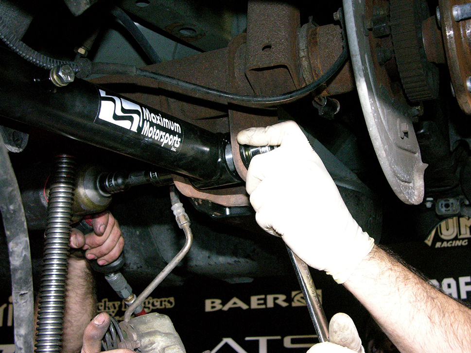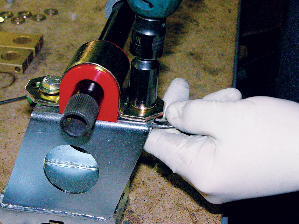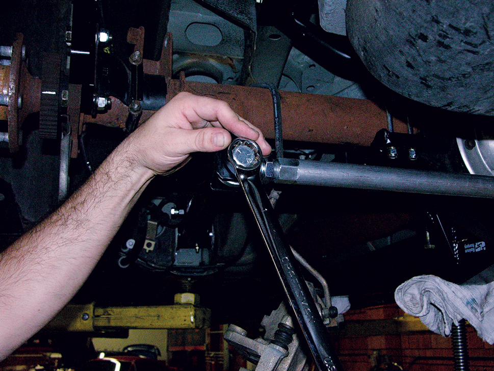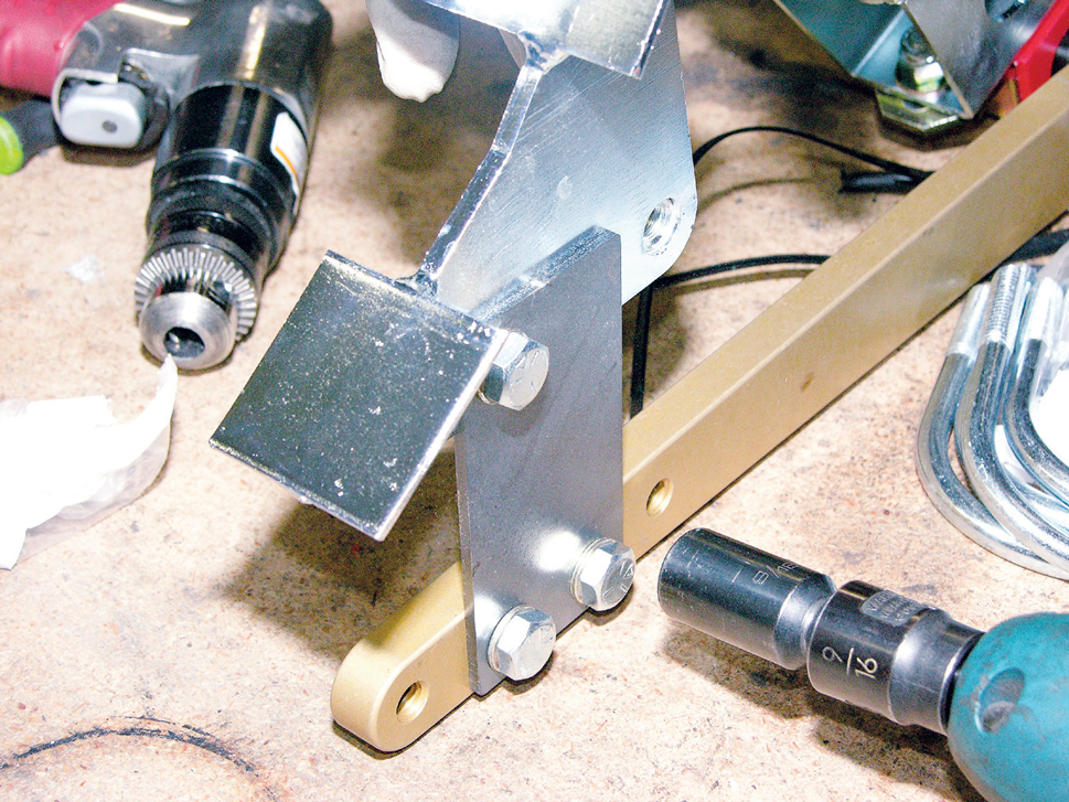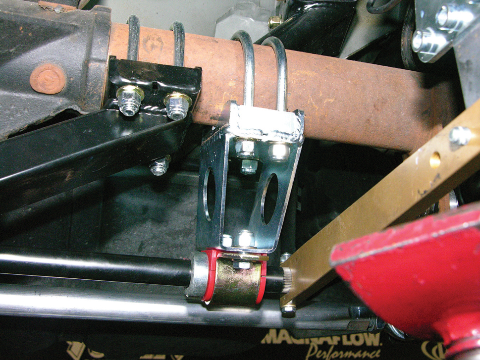 Assemble the Panhard bar and bolt it to the frame and to the axle. Leave it loose so you can adjust it later; it should be as level as possible with the ground, and MM recommends adjusting it with the driver and at least half a tank of fuel in the car.