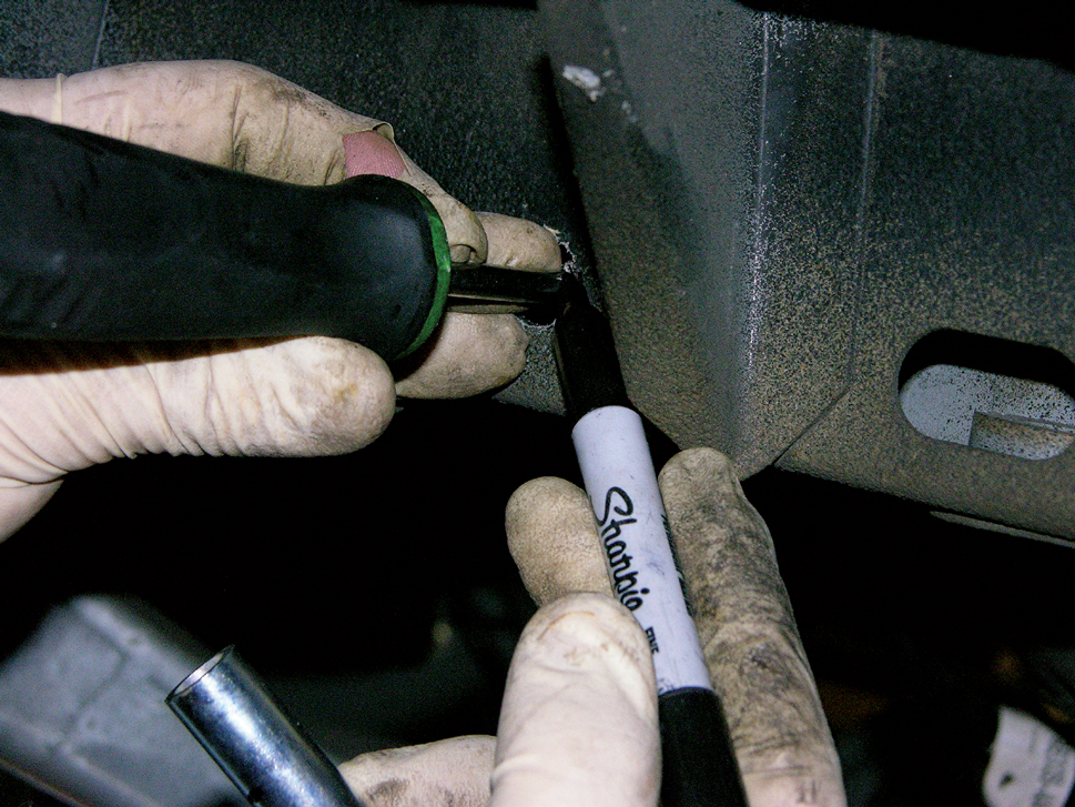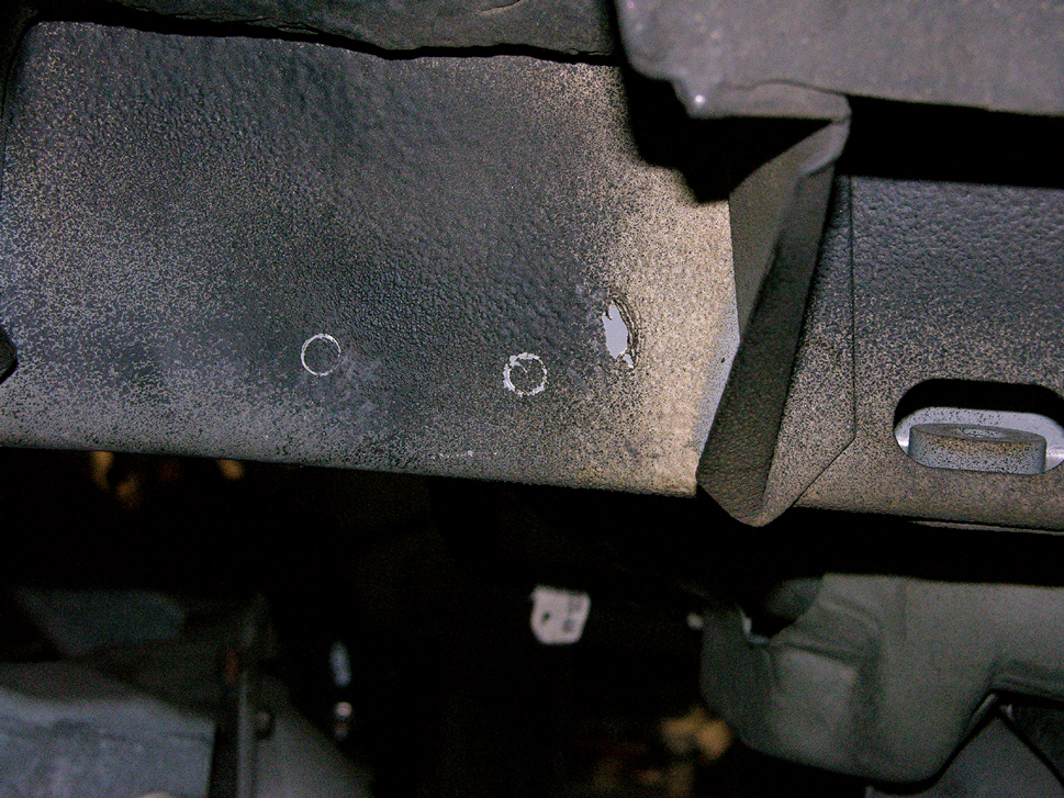 The measurements you just took will allow you to locate the two holes you’ll need to drill into the outside of the framerails. Once you’re positive you’ve marked their position correctly, drill them to 5/8 inch.