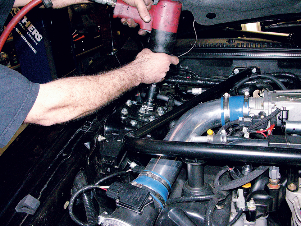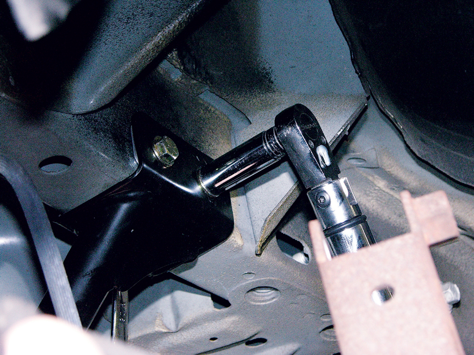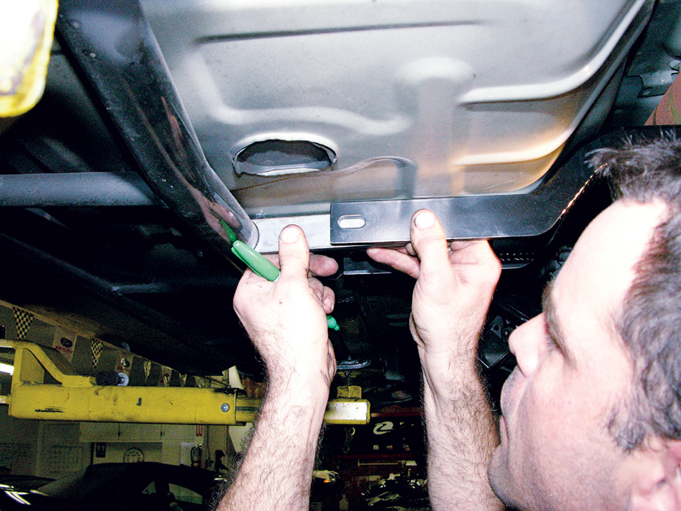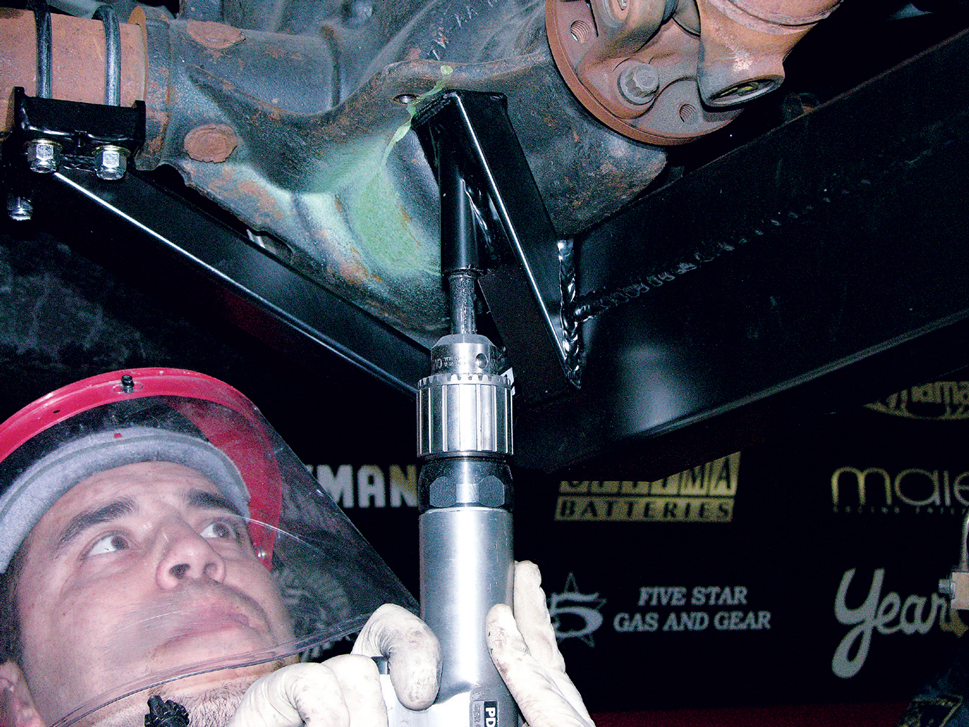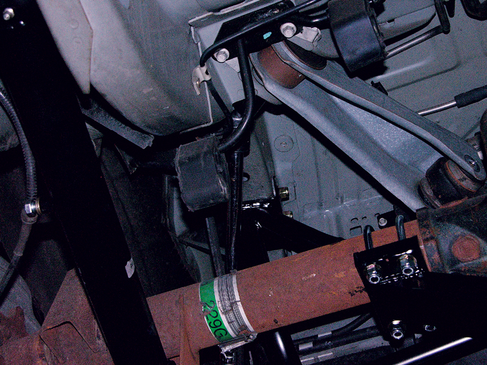 Support the front of the torque arm and crossmember with a jackstand, then measure and make sure it’s absolutely centered. Rather than using the included crossmember-to-subframe mounts, Chicane prefers to use mounts of its own design for use with the GW subframe connectors. Here, Chicane’s Joe Gosinski marks the spot where he’ll drill the mounts to bolt up to the crossmember.