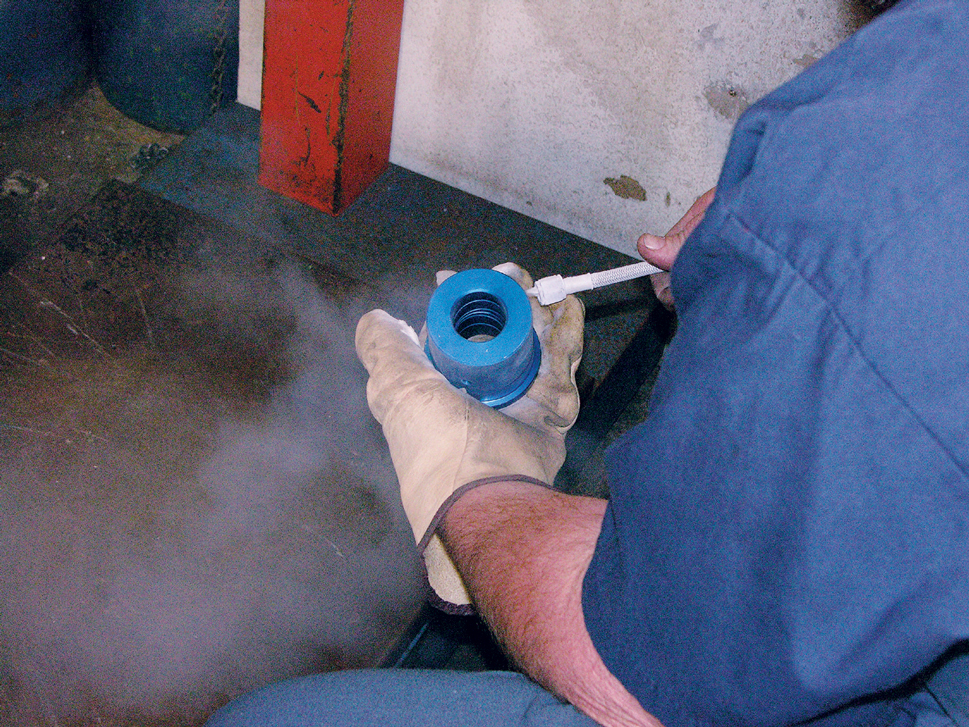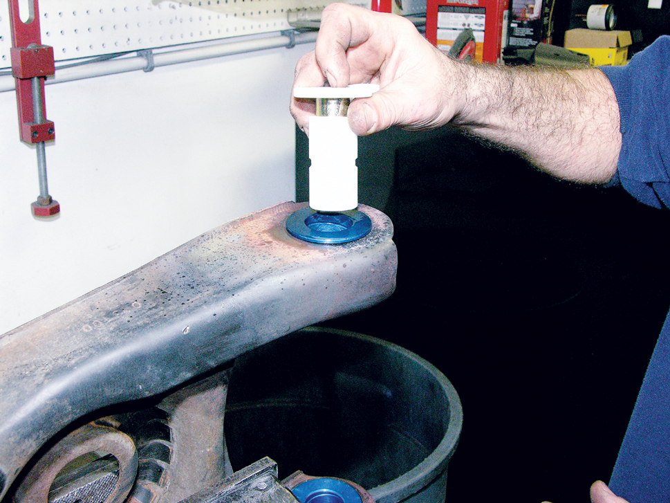 Although it’s possible to use a hydraulic press to install Del-A-Lum bushings, that process isn’t ideal. The design of the control arm naturally resists the process (picture the C-shaped arm clamping closed as the bushing is pressed in), and it can deeply score the aluminum sleeve, too. A better alternative is to remove the delrin insert and then freeze the aluminum sleeve.